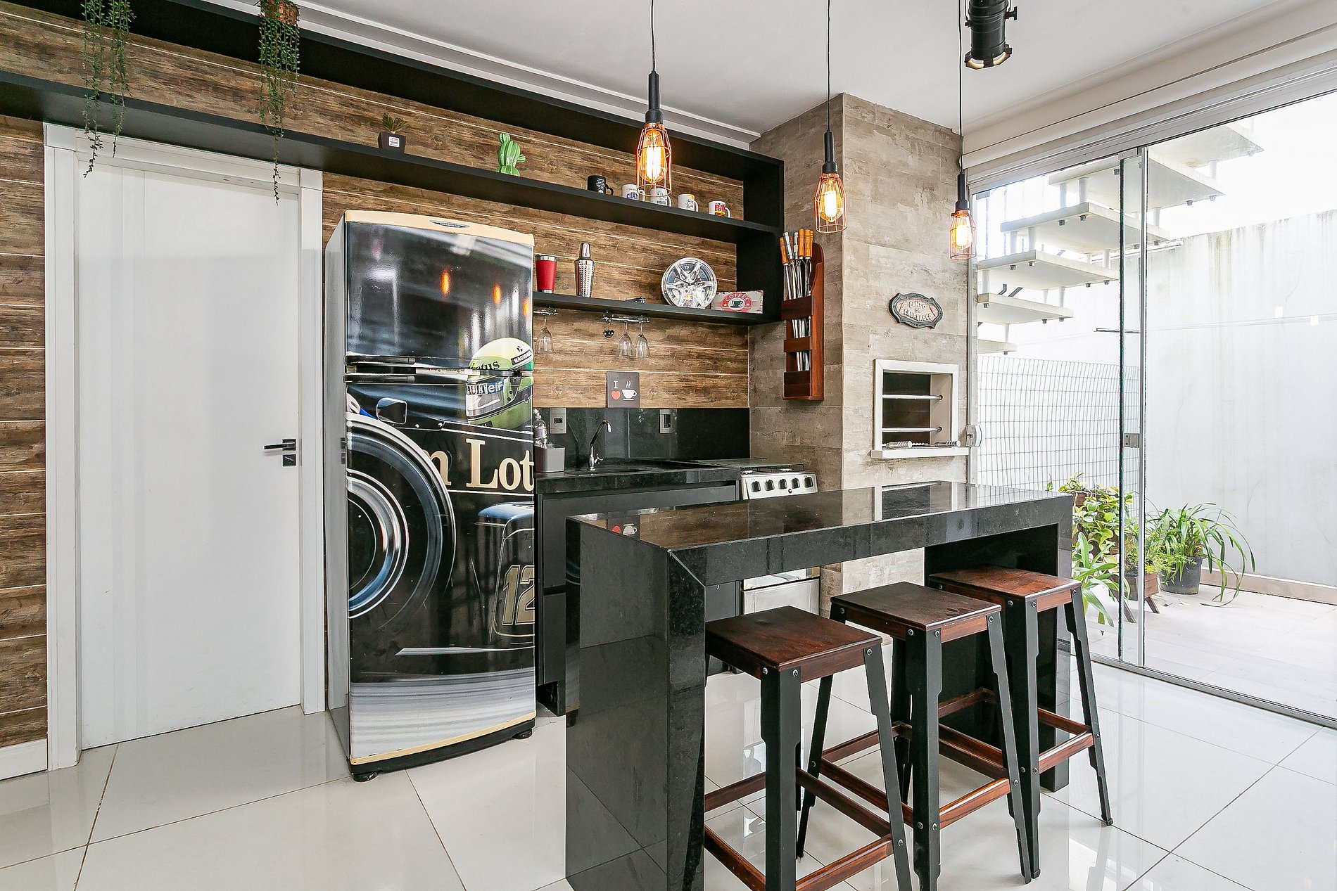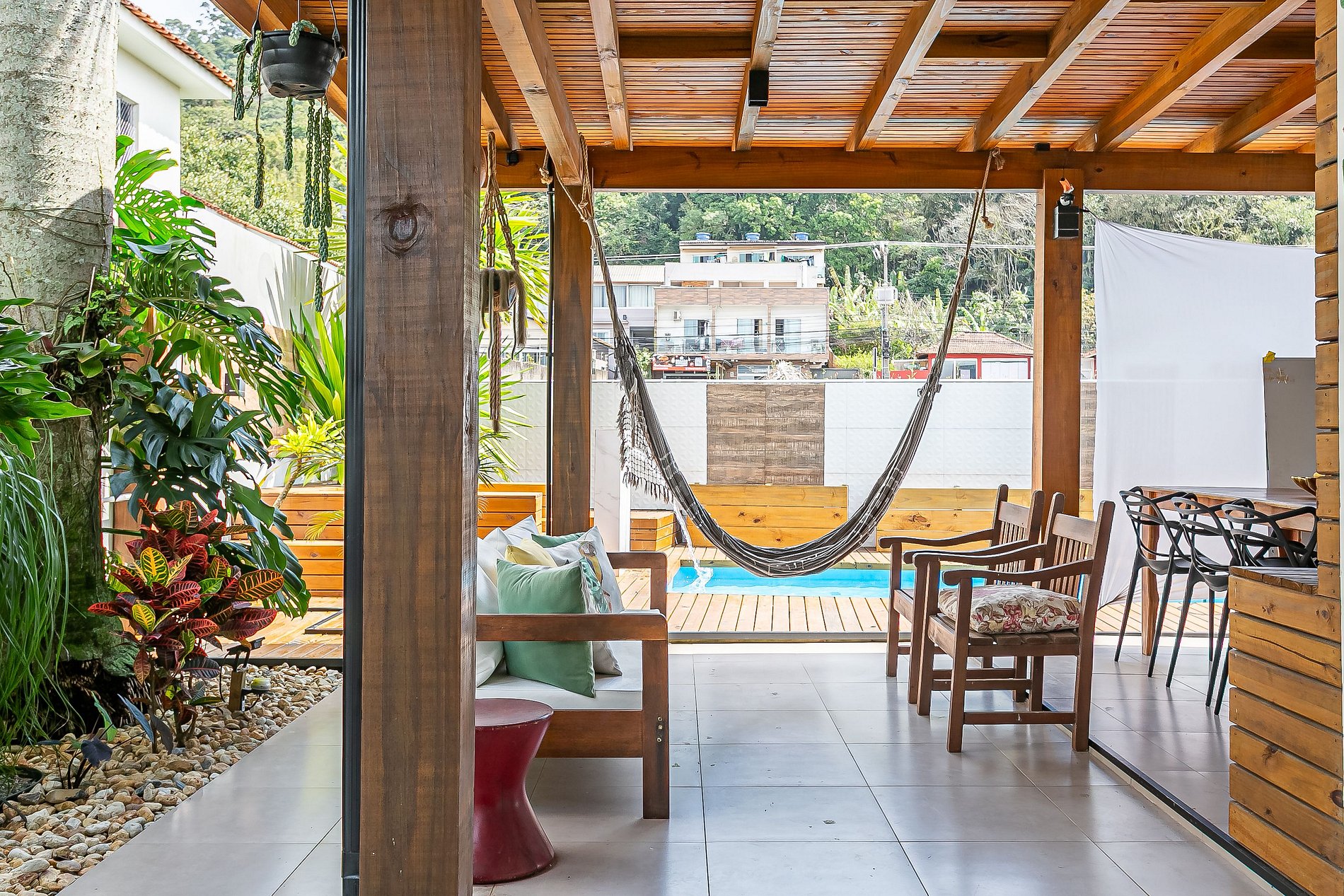 Os proprietários residem na parte superior do imóvel, com acesso totalmente independente por um corredor lateral. Para maior privacidade, os quartos contam com grade de separação e, na área de estar, há divisórias em tecido que ajudam a isolar a vista e delimitar os ambientes.
