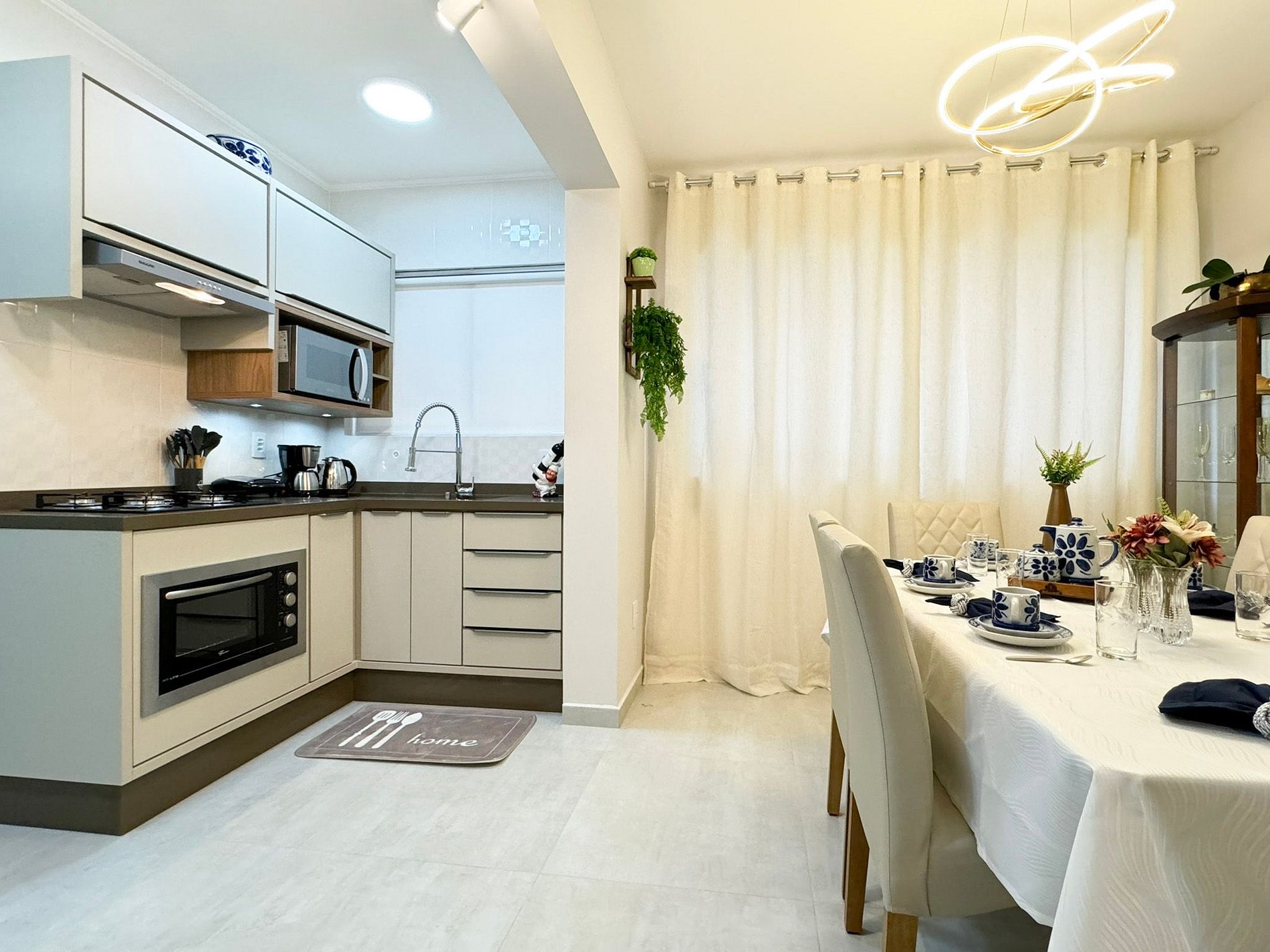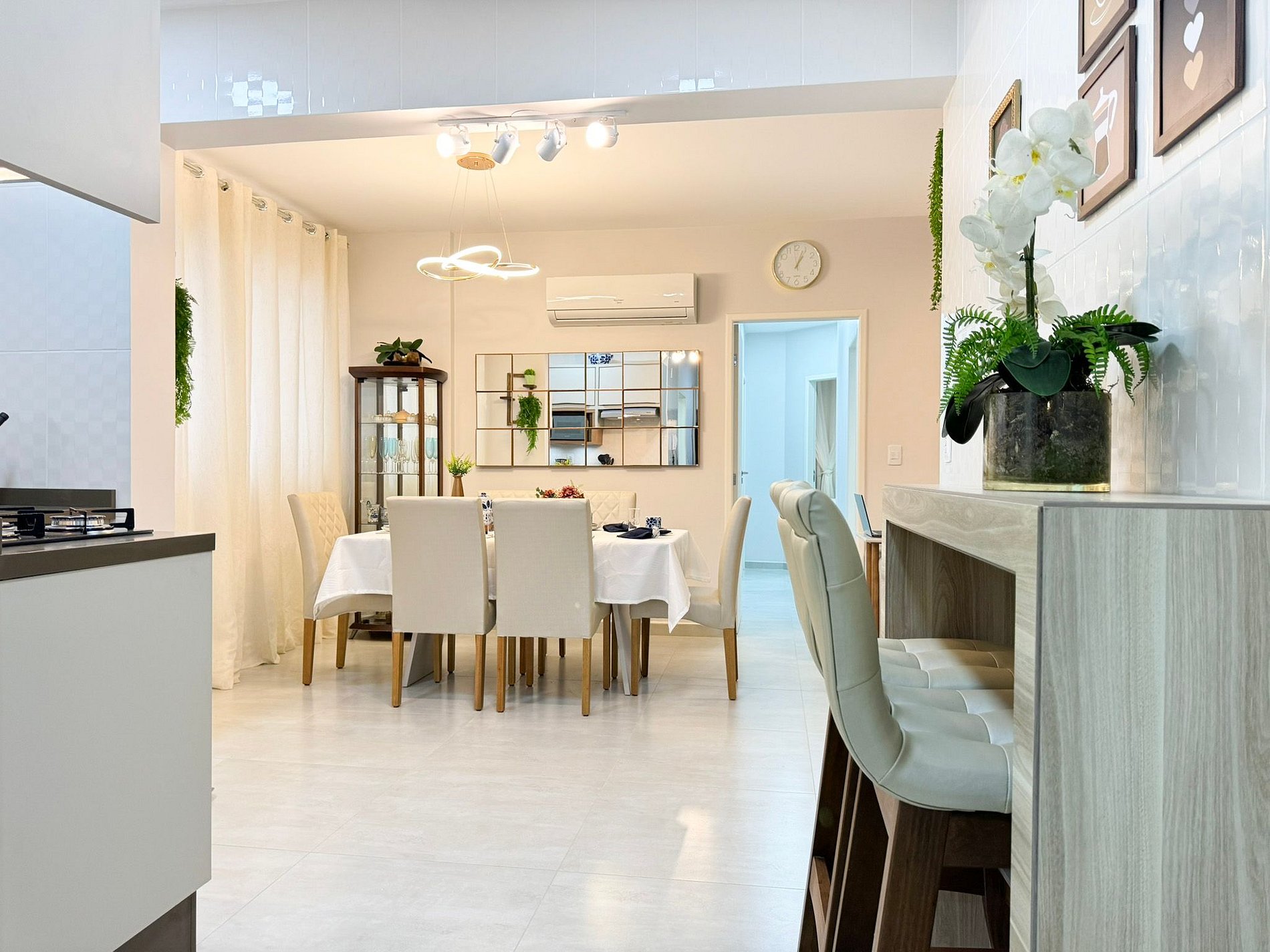 Com uma sala ampla, integrada à cozinha e à sala de jantar, o ambiente é perfeito para socializar ou relaxar. A cozinha totalmente equipada oferece todos os utensílios necessários para preparar suas refeições com facilidade. Além disso, todos os hóspedes recebem roupas de cama e banho, garantindo uma experiência tranquila e relaxante.