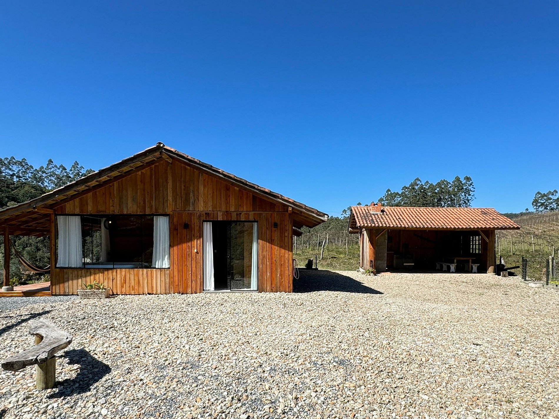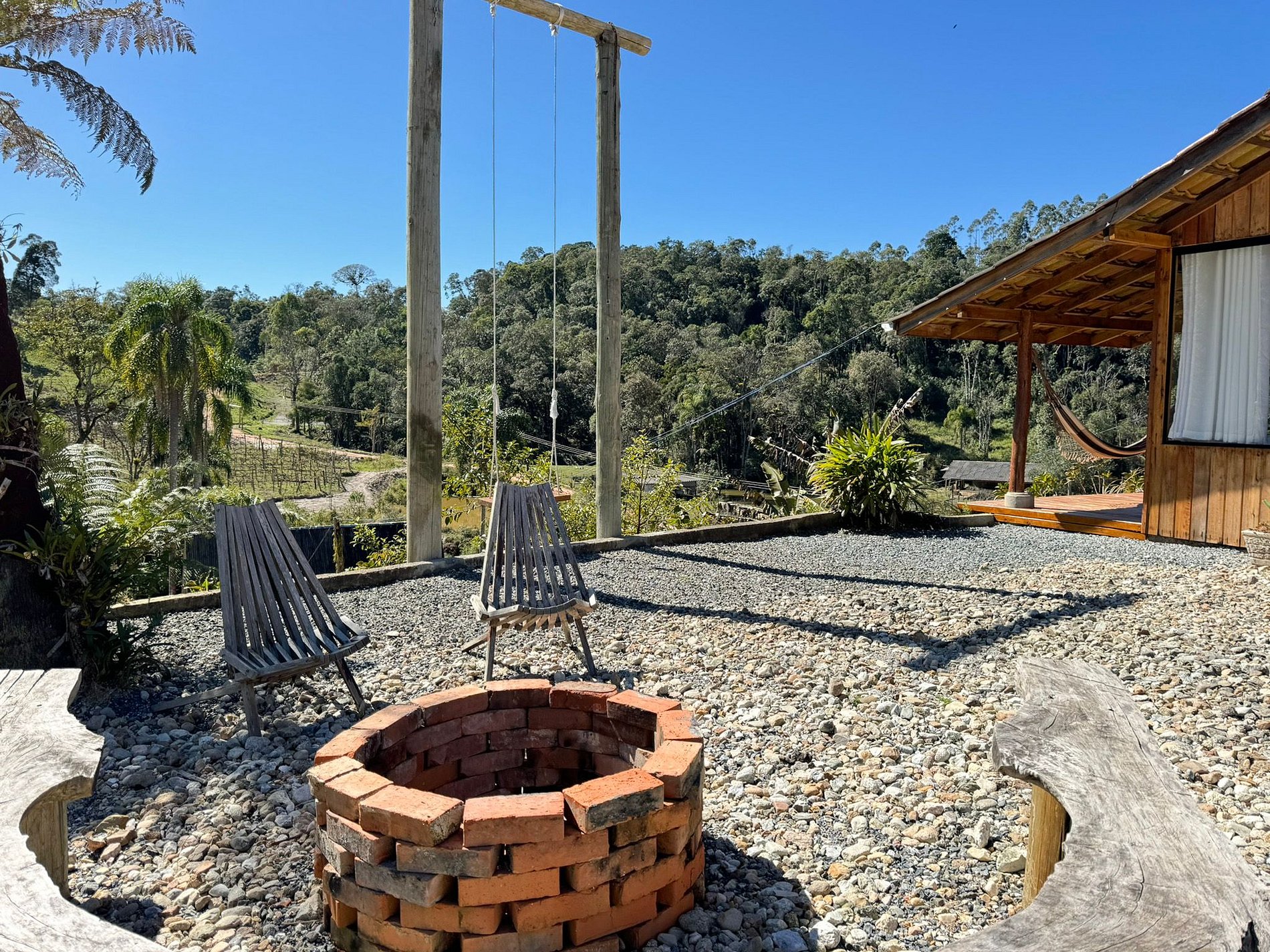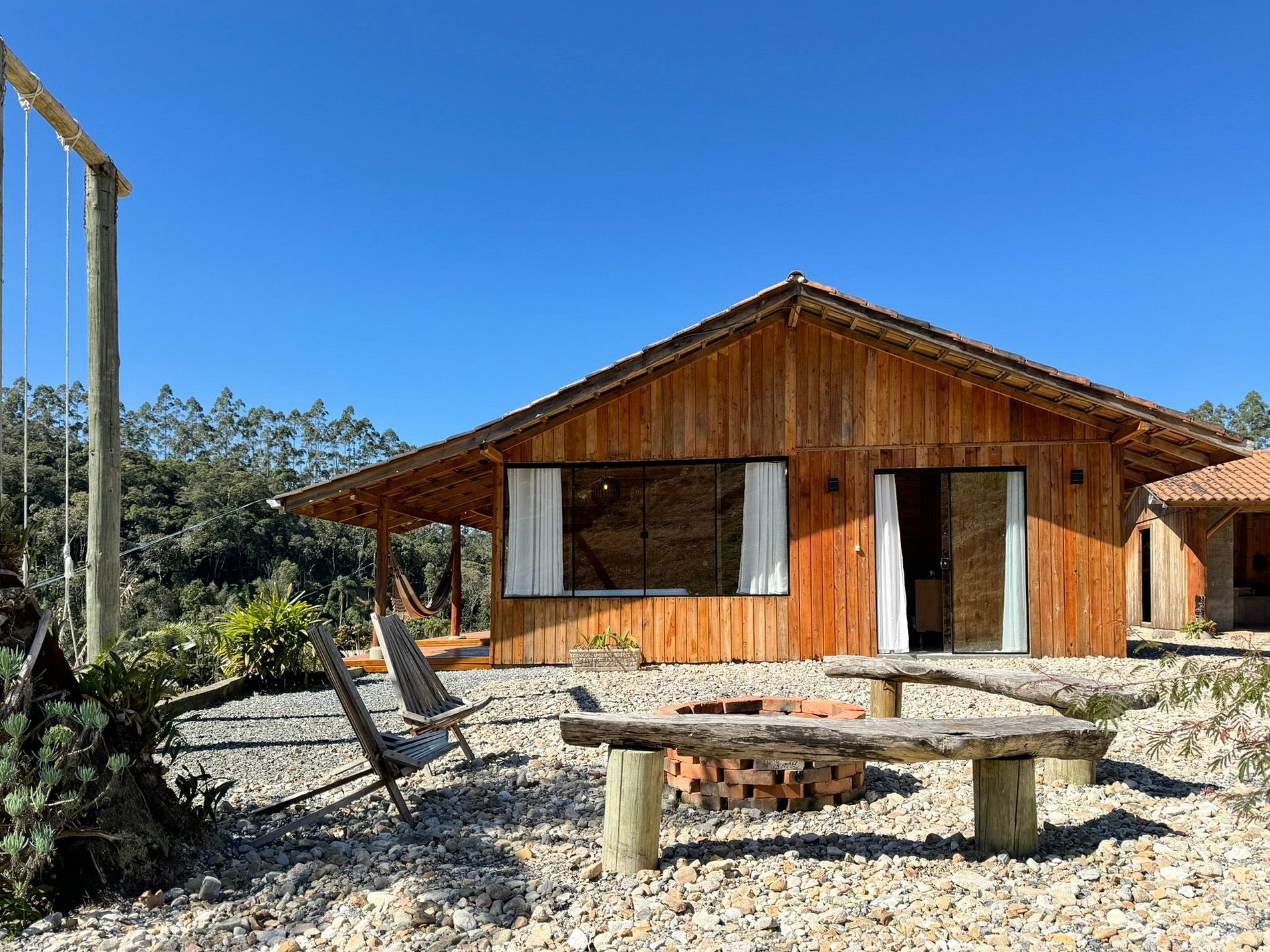 No lado externo, aproveite momentos únicos ao redor da fogueira, compartilhando histórias sob o céu estrelado. Para completar o ambiente acolhedor, um balanço suspenso proporciona uma vista deslumbrante para as montanhas, criando uma conexão perfeita com a natureza.