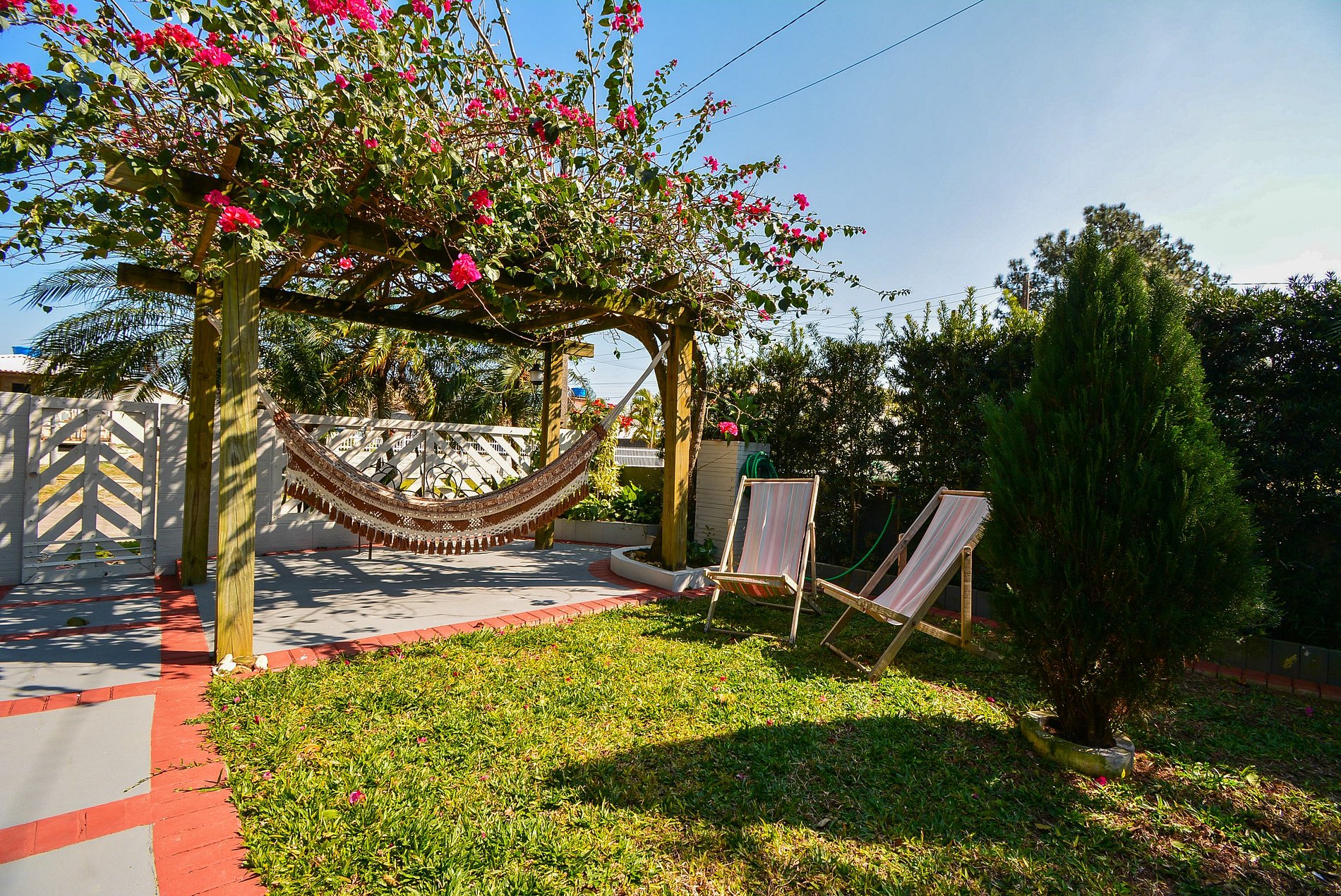 As crianças têm um espaço especial com um helicóptero de madeira para brincadeiras criativas e seguras, além de uma cesta de basquete para diversão garantida. Para quem busca relaxar, uma charmosa rede de descanso sob o pergolado completa o cenário ideal para dias inesquecíveis em contato com a natureza.