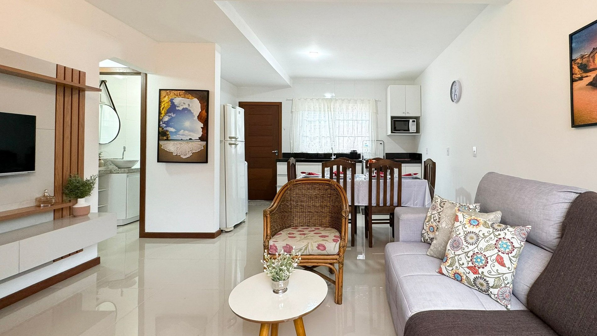 A cozinha é totalmente equipada e oferece um ambiente funcional para preparar as suas refeições. A sala de estar é aconchegante, com sofá espaçoso, poltronas confortáveis e uma decoração charmosa, perfeita para momentos de descontração.