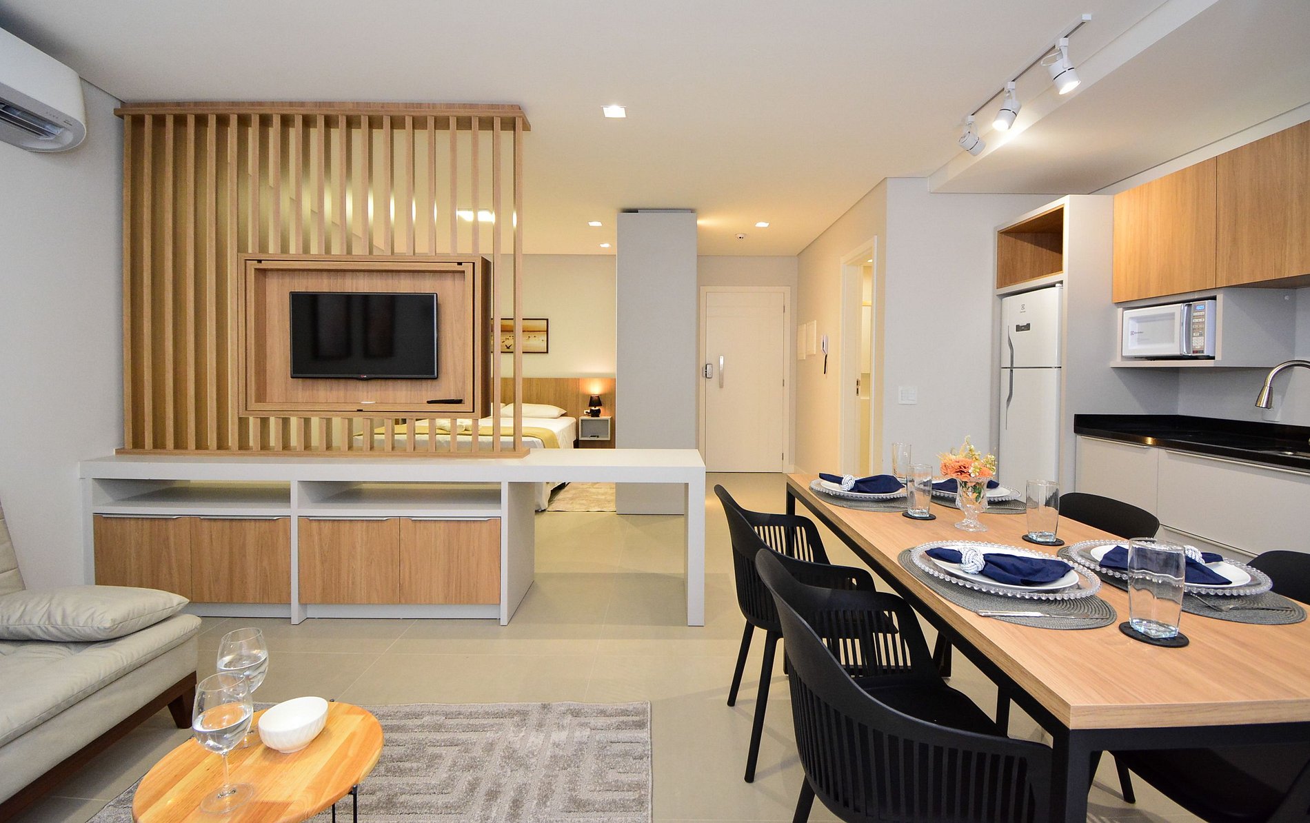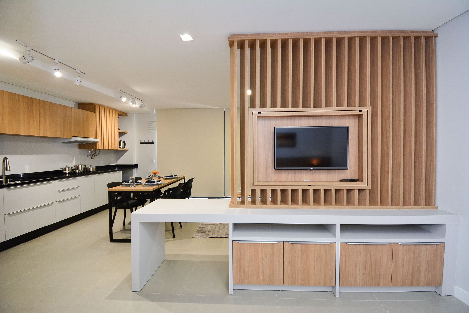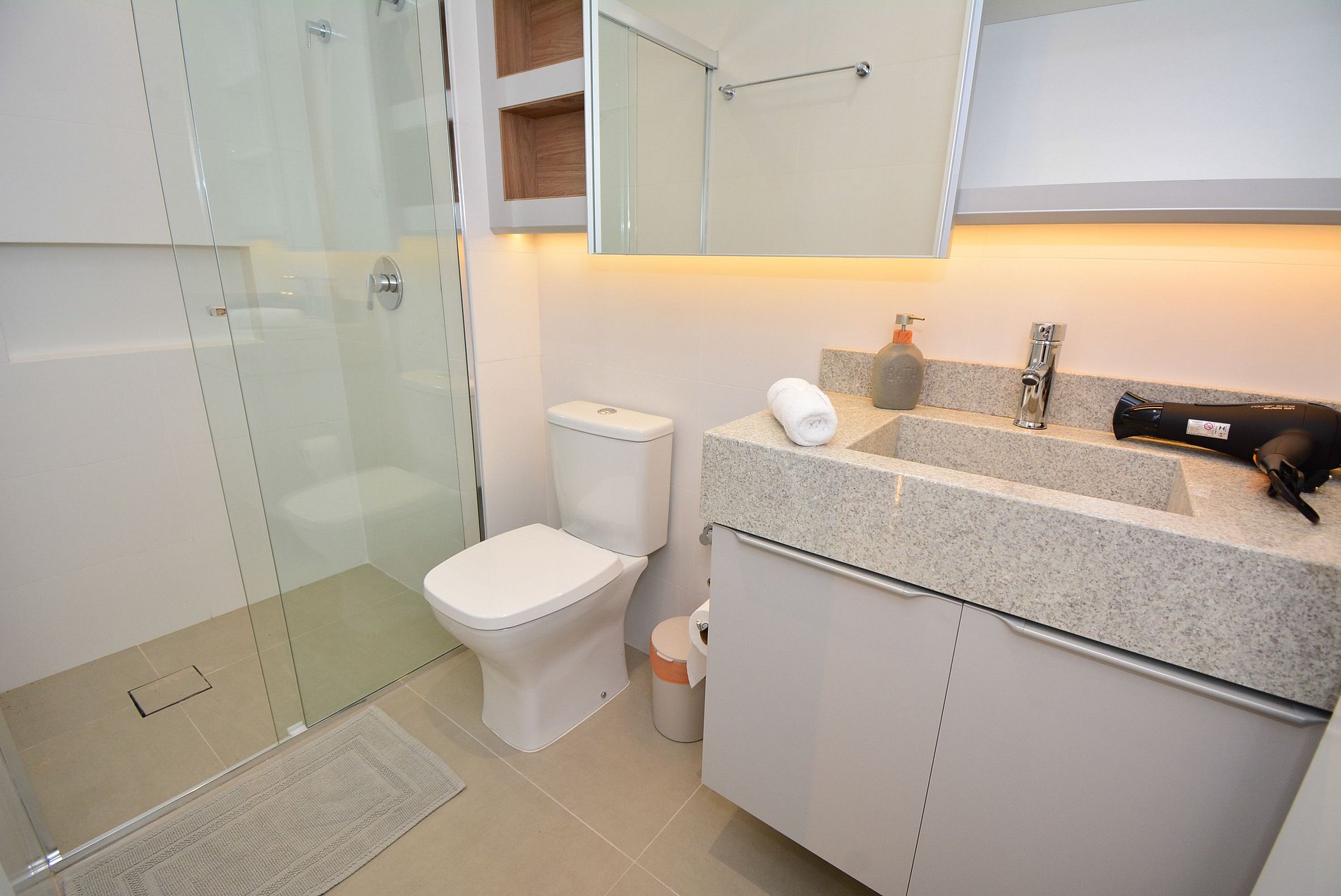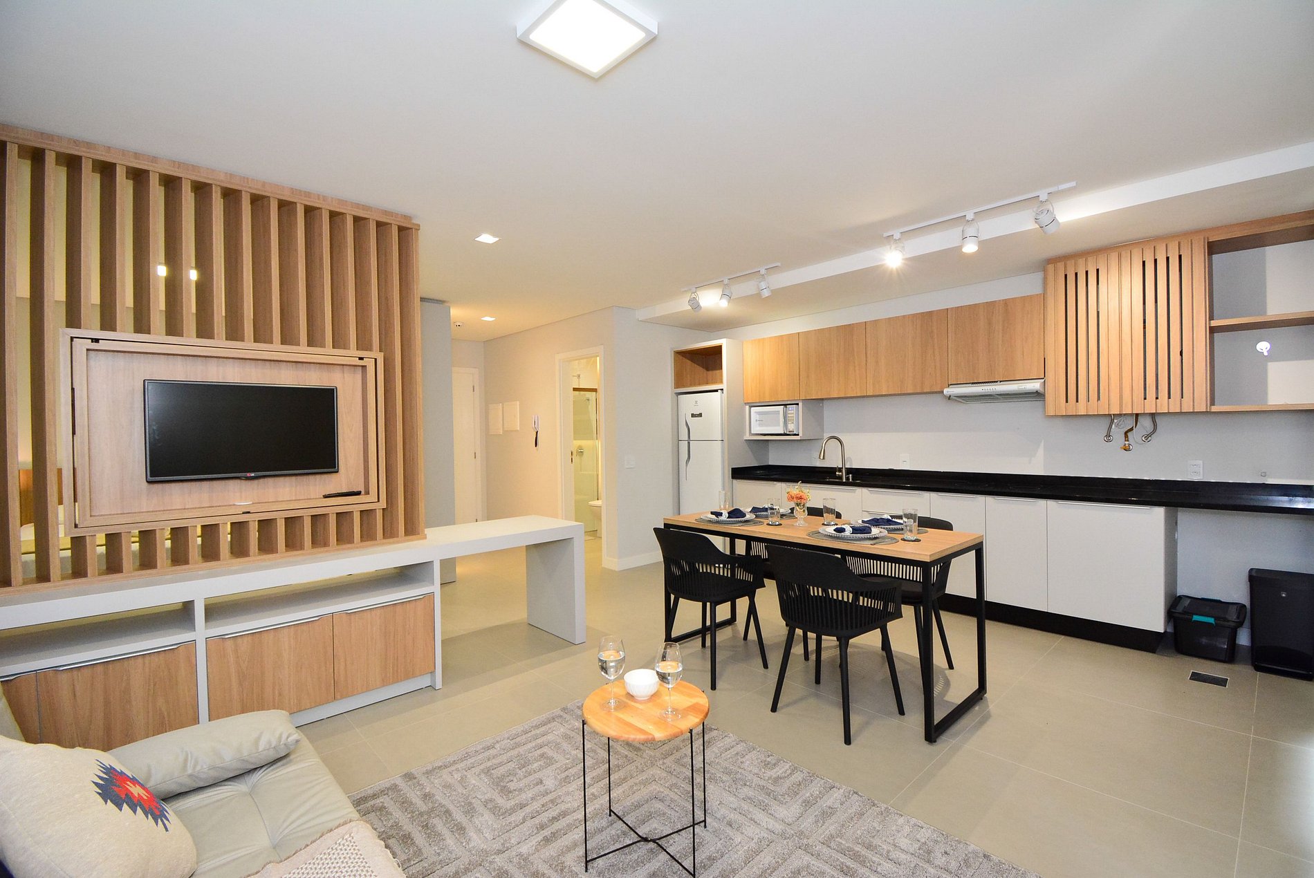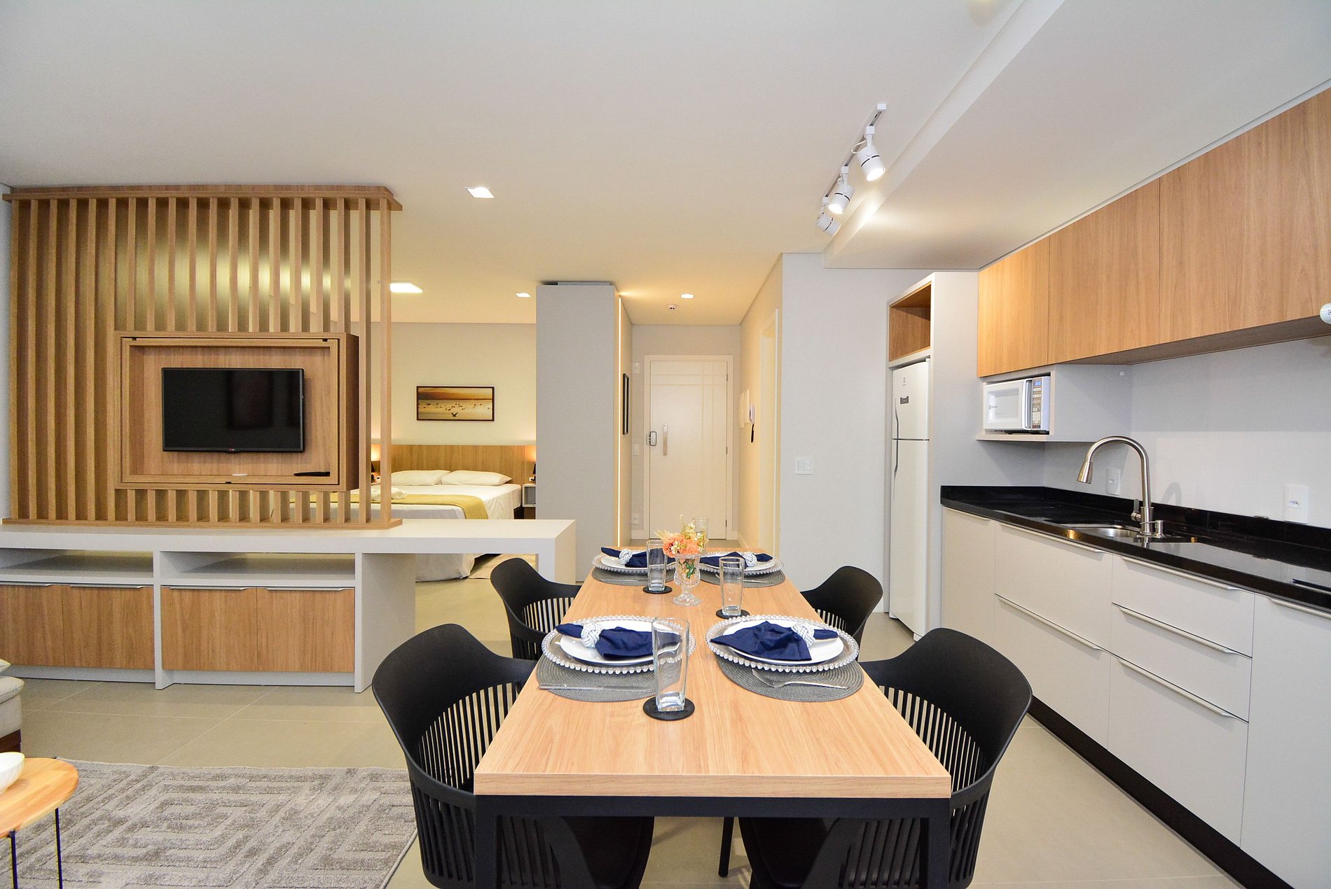 A cozinha, totalmente equipada com todos os utensílios necessários, permite que você prepare suas refeições com facilidade, proporcionando uma experiência gastronômica completa. O apartamento é moderno e tecnológico, garantindo uma estadia agradável e sem preocupações.