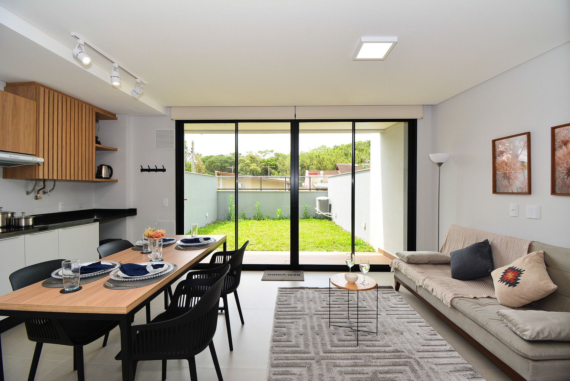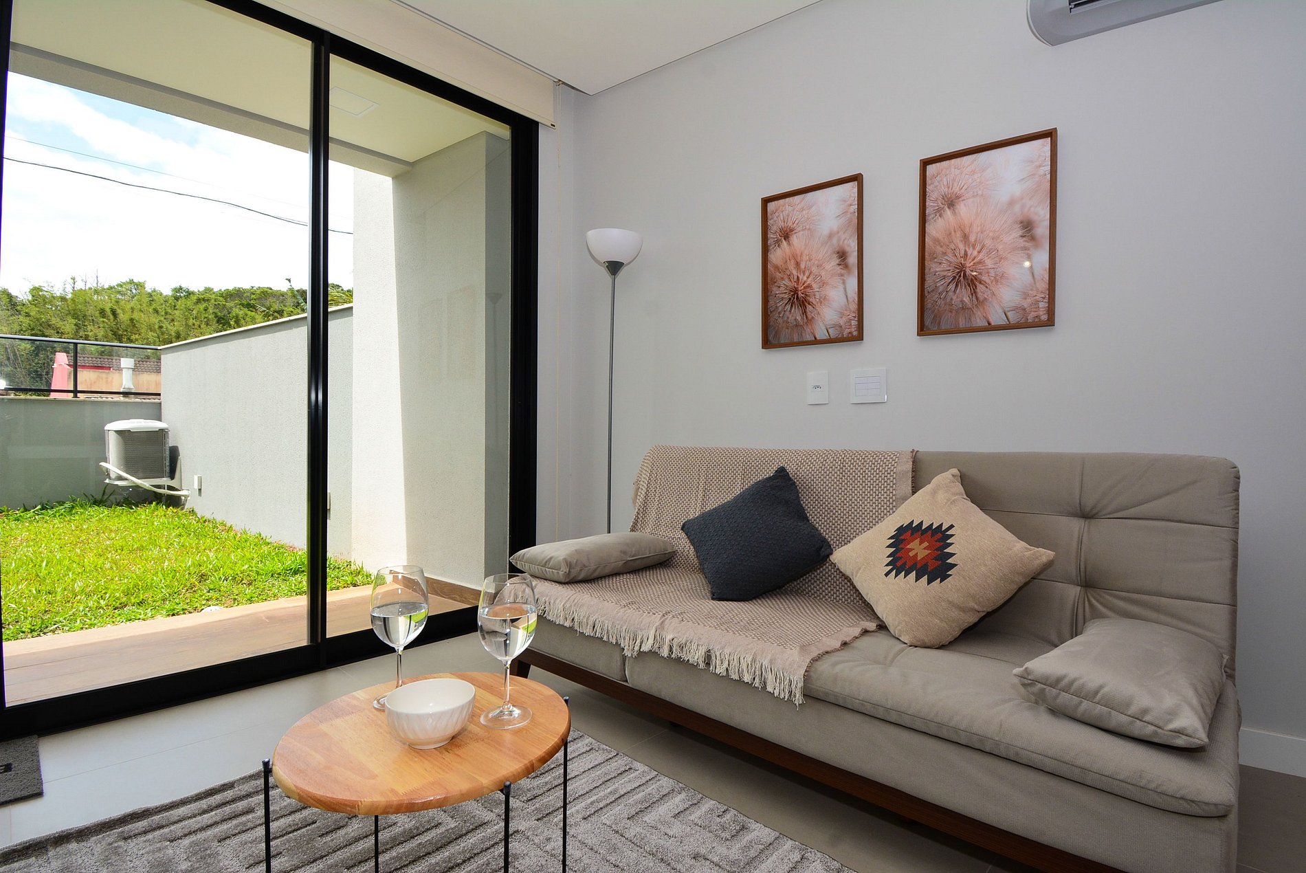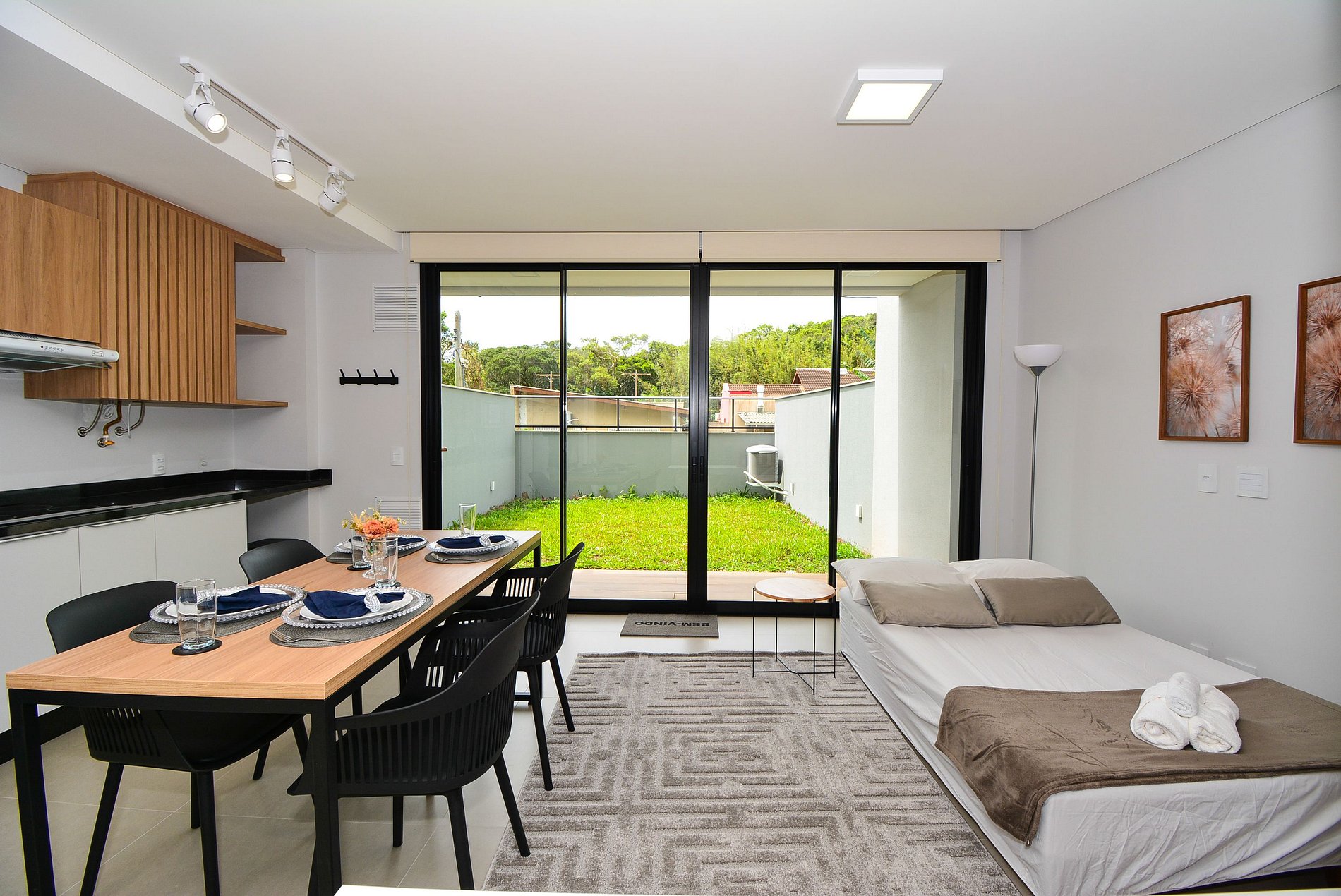 Localizado no térreo, o studio oferece uma charmosa área externa com gramado e uma churrasqueira, perfeita para momentos de lazer ao ar livre com amigos e família.