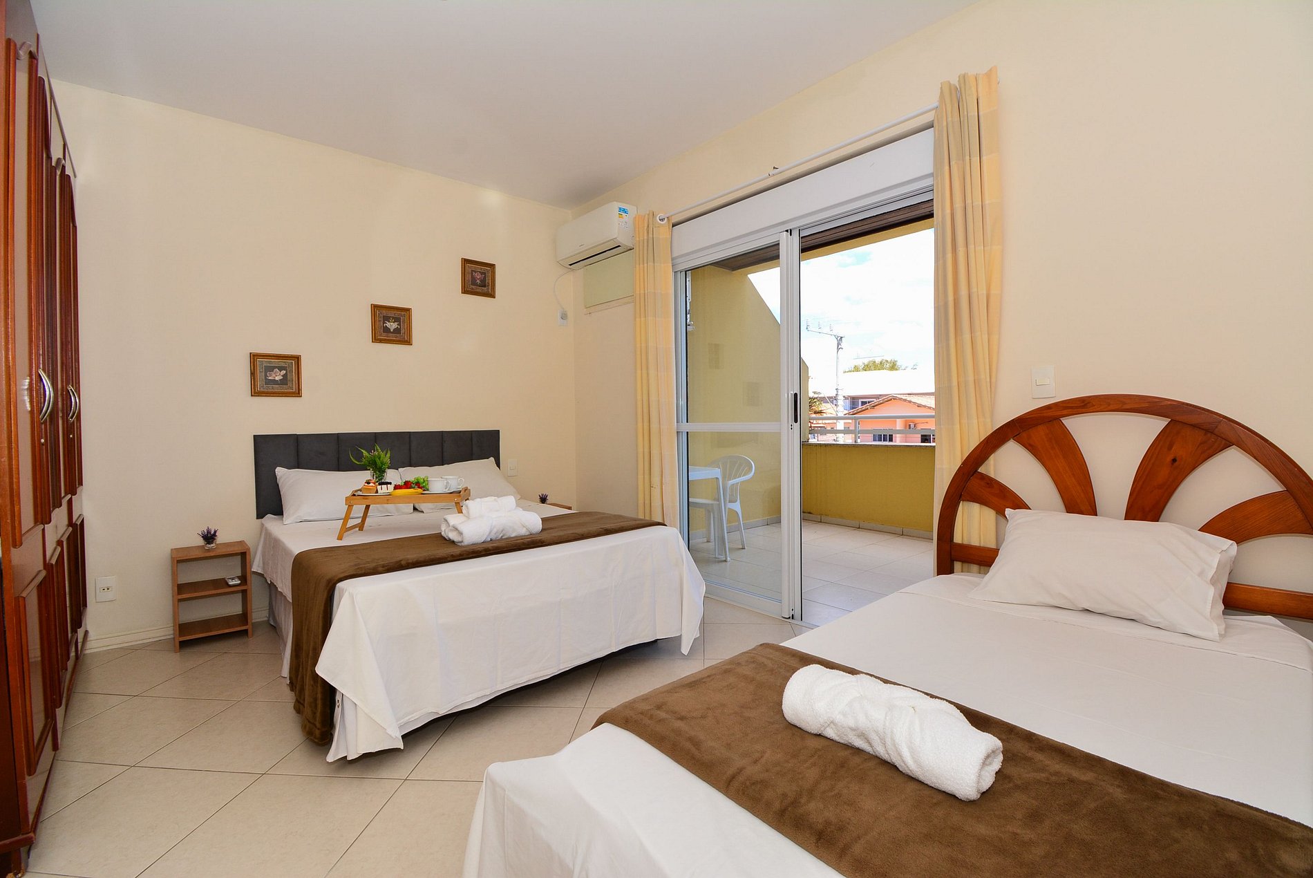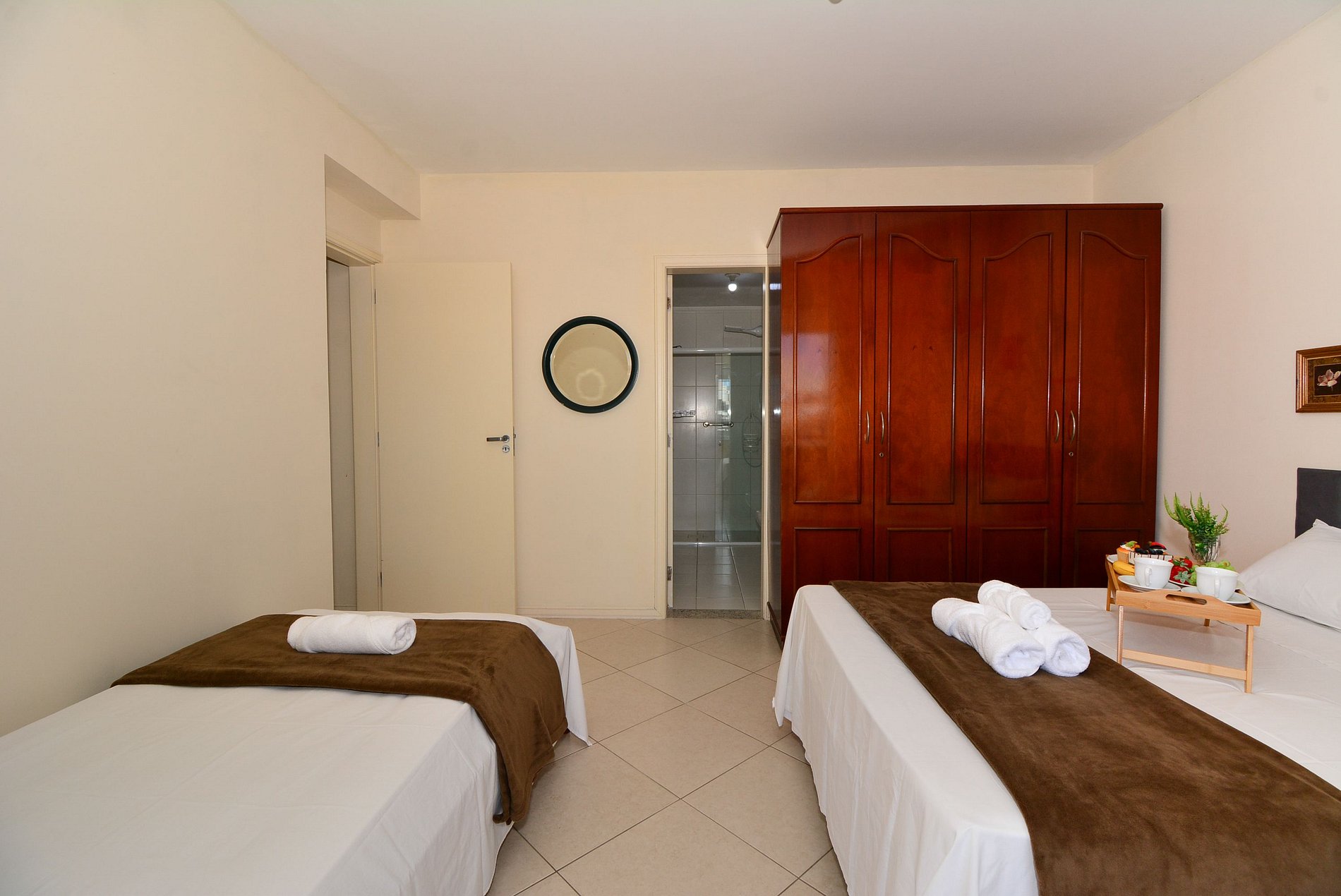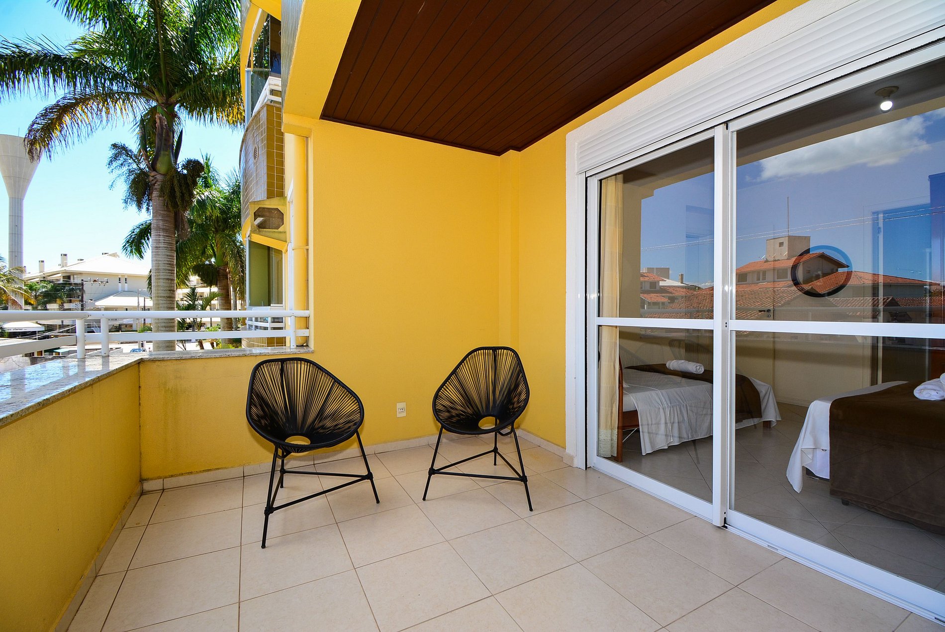 Conta com dois quartos, sendo uma suíte com cama de casal e cama de solteiro com acesso a uma ampla sacada com cadeiras para relaxar. E um segundo quarto com duas camas de solteiro que podem ser unidas e transformadas em cama de casal.