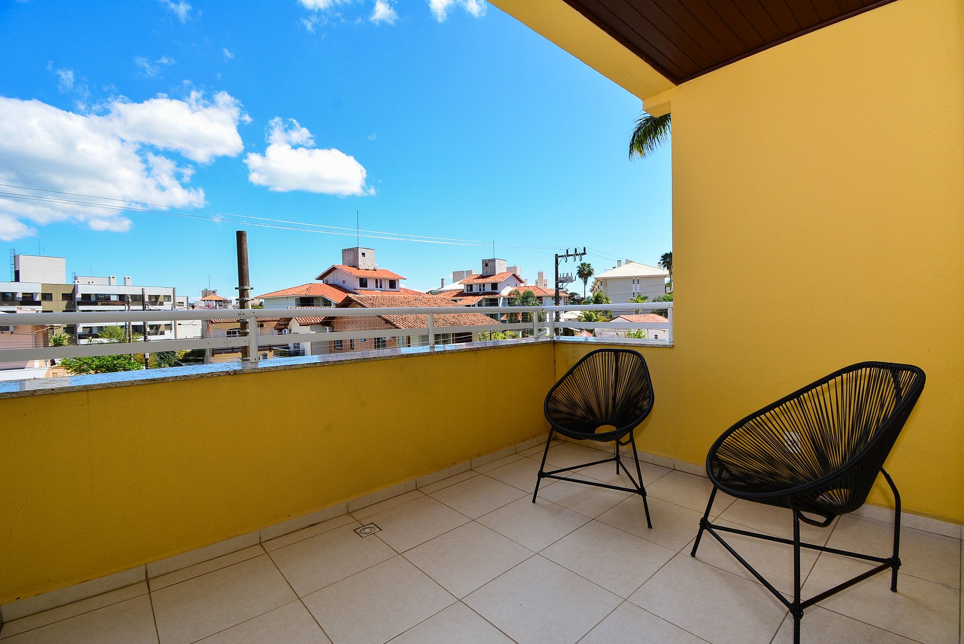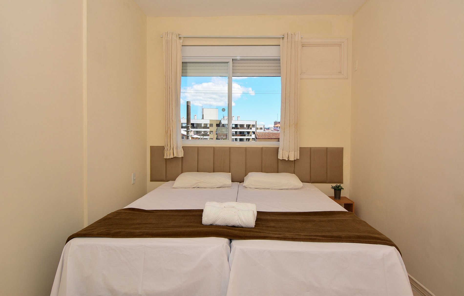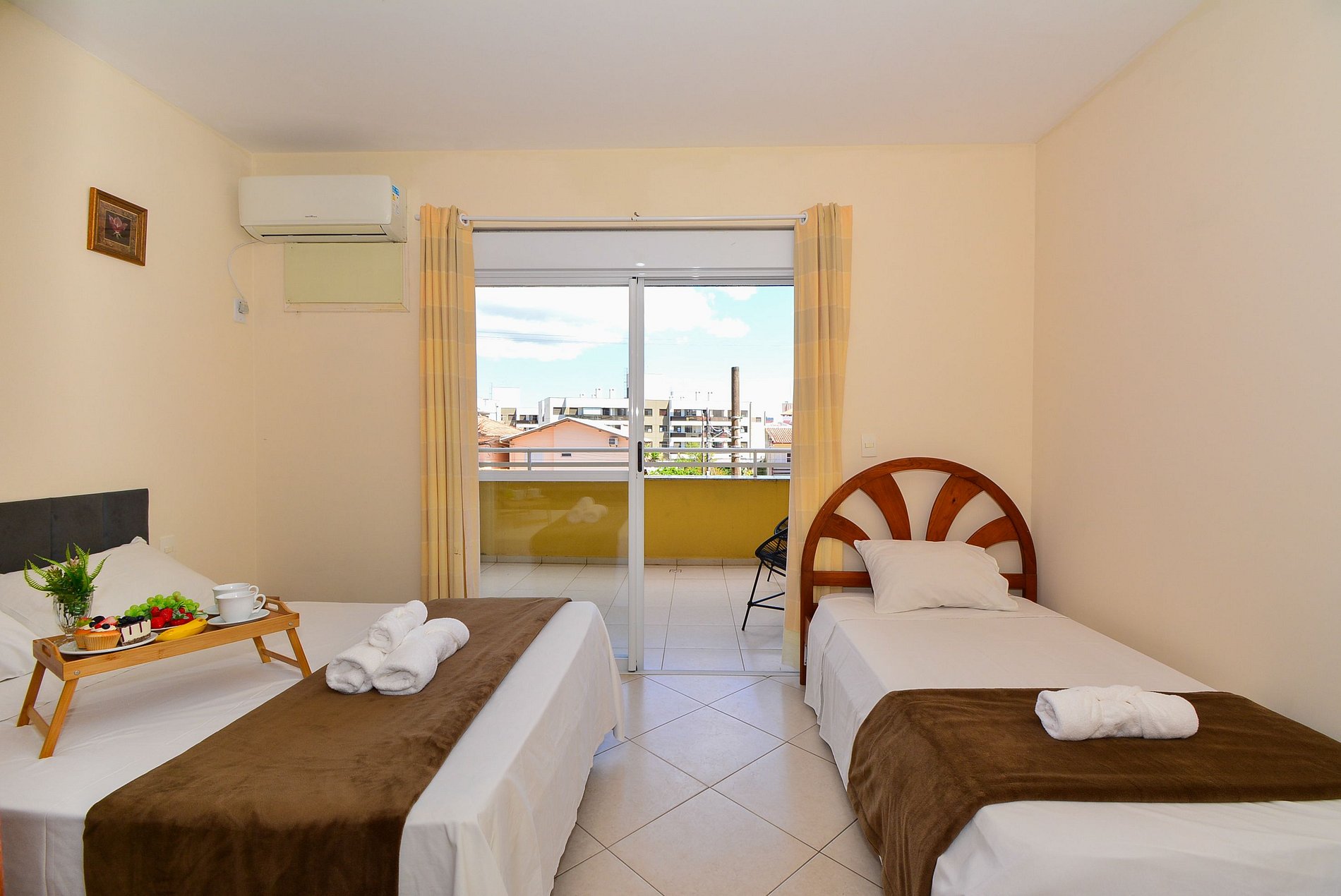 Conta com dois quartos, sendo uma suíte com cama de casal e cama de solteiro com acesso a uma ampla sacada com cadeiras para relaxar. E um segundo quarto com duas camas de solteiro que podem ser unidas e transformadas em cama de casal.