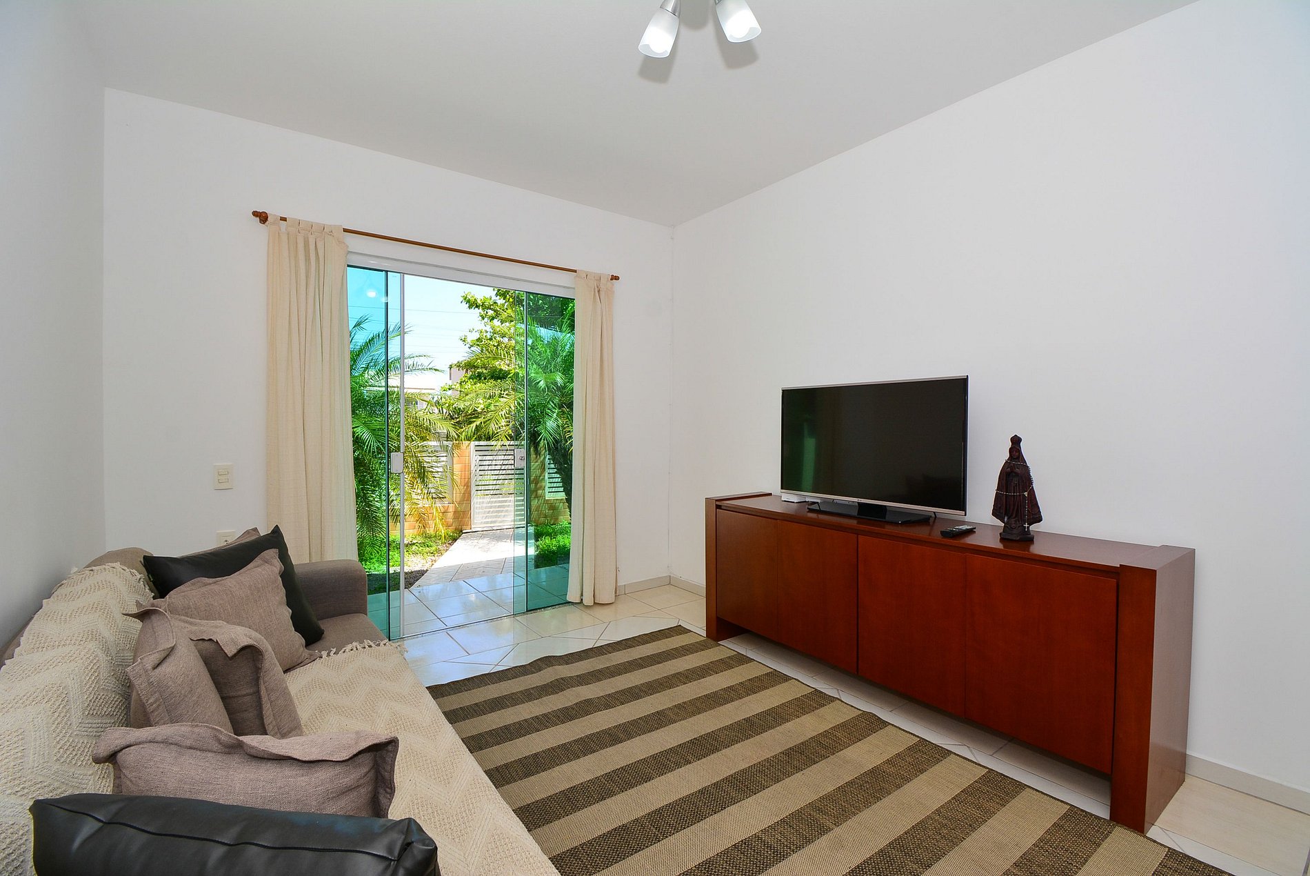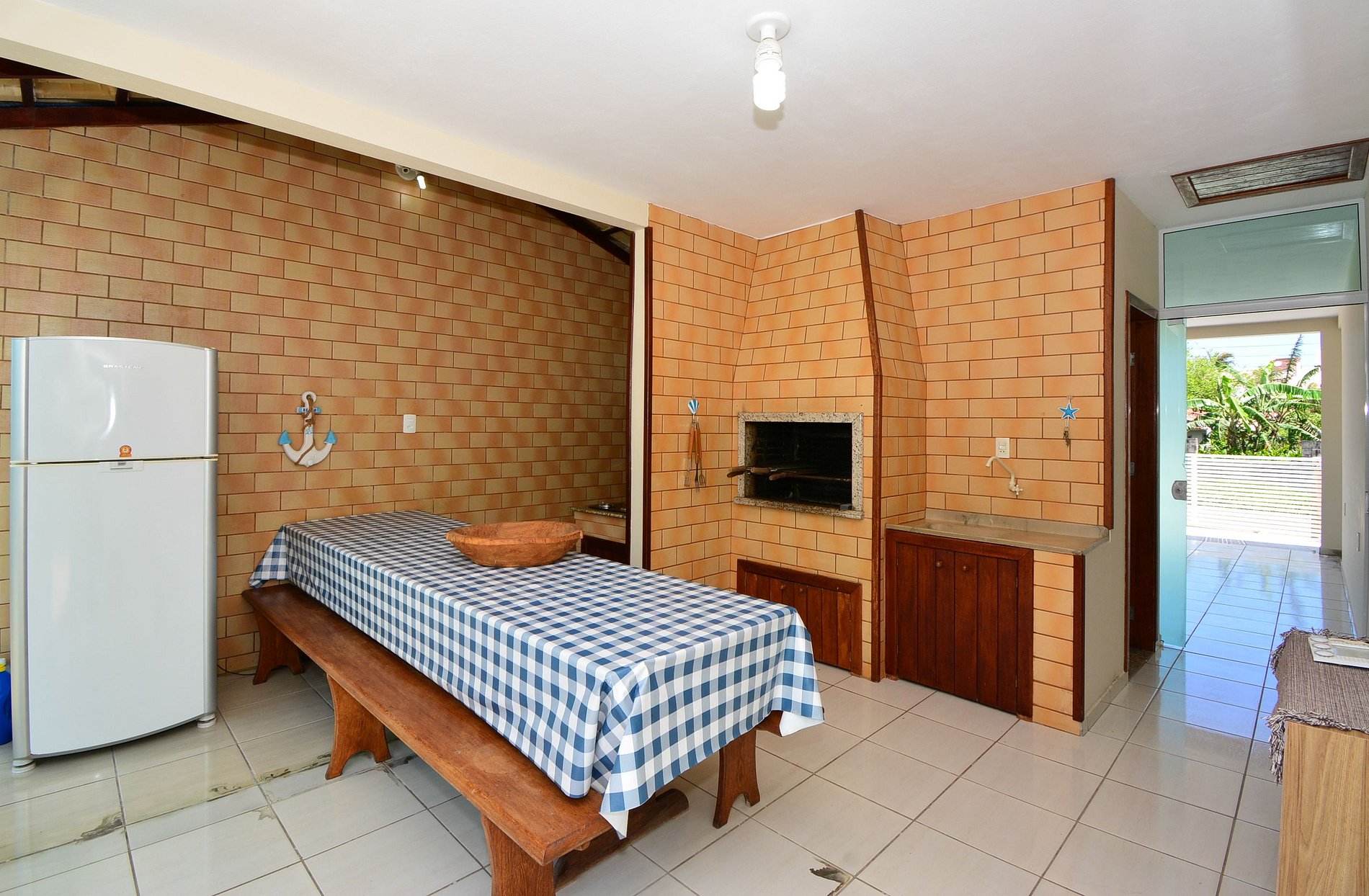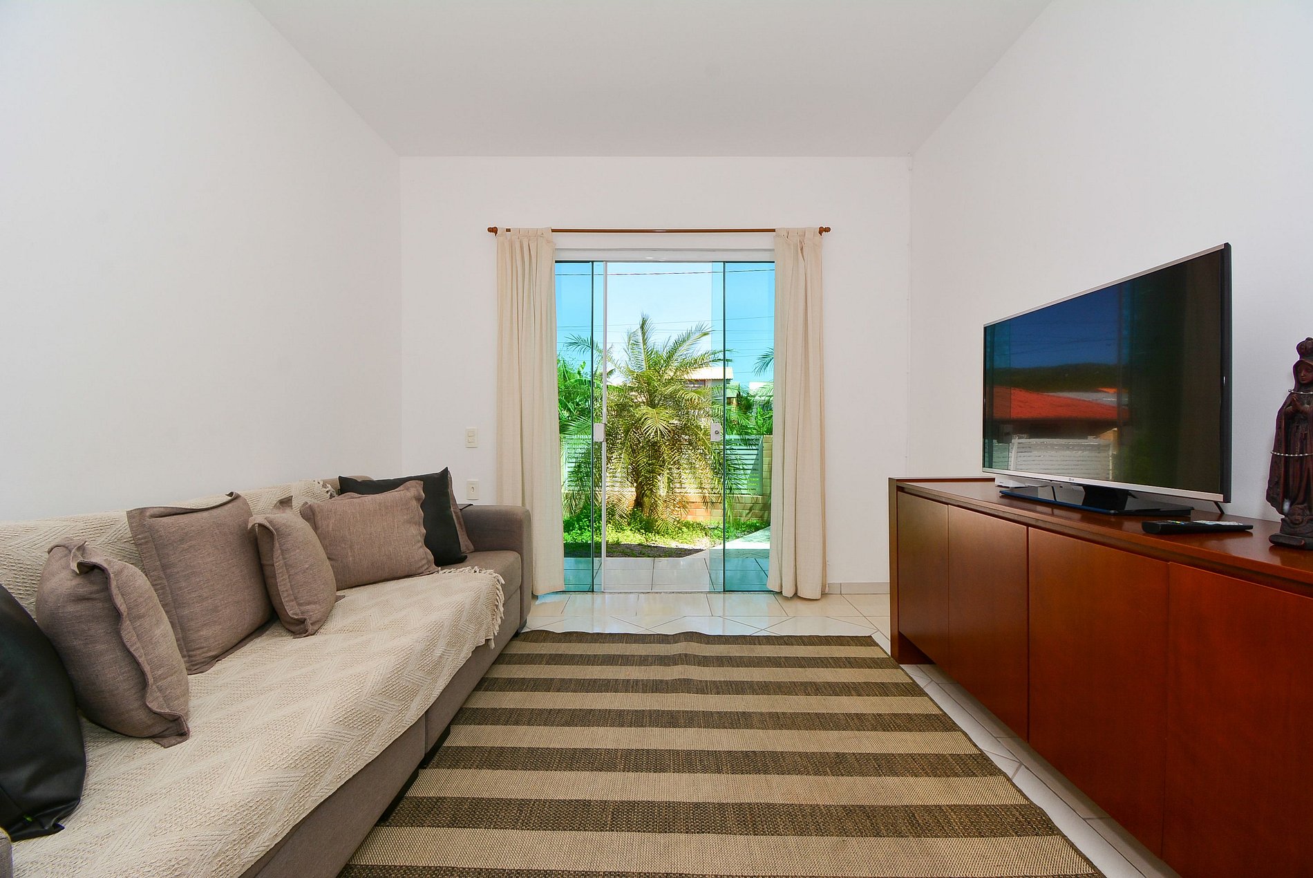 O interior da casa oferece uma sala ampla, ideal para momentos de lazer e convivência, equipada com TV e sofás confortáveis. A cozinha completa possui todas as utensílios necessários, incluindo fogão, geladeira, micro-ondas e utensílios de cozinha para preparar suas refeições.