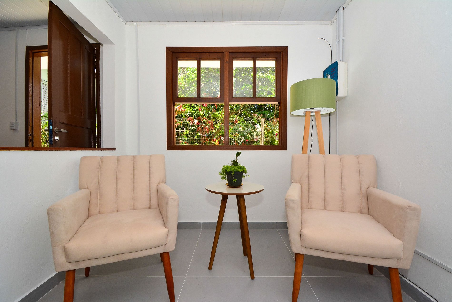 Subindo as escadas, o andar superior apresenta uma sala de descanso e uma suíte aconchegante, garantindo uma experiência relaxante e íntima.