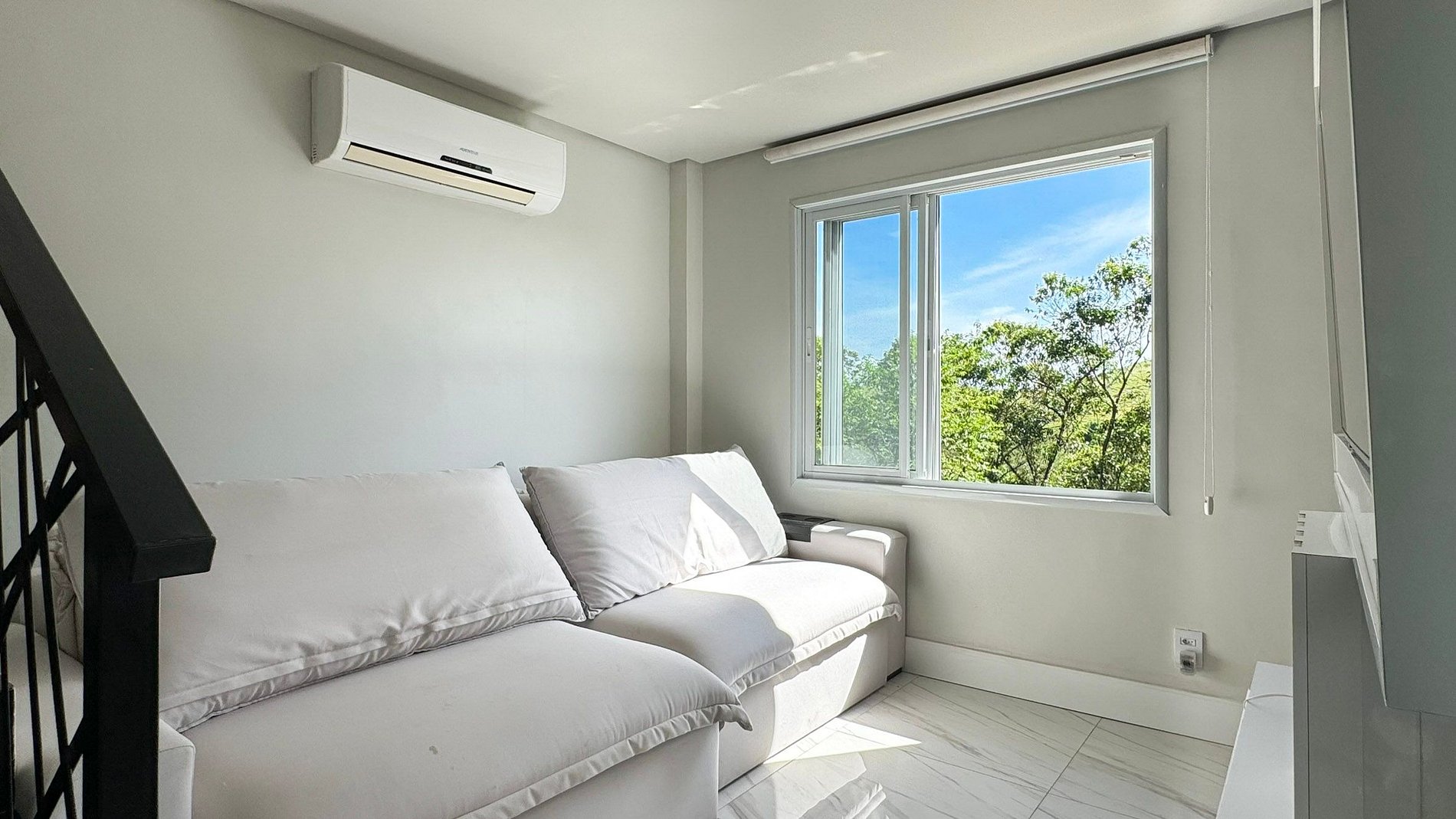 A sala de estar é equipada com um sofá-cama espaçoso e confortável.