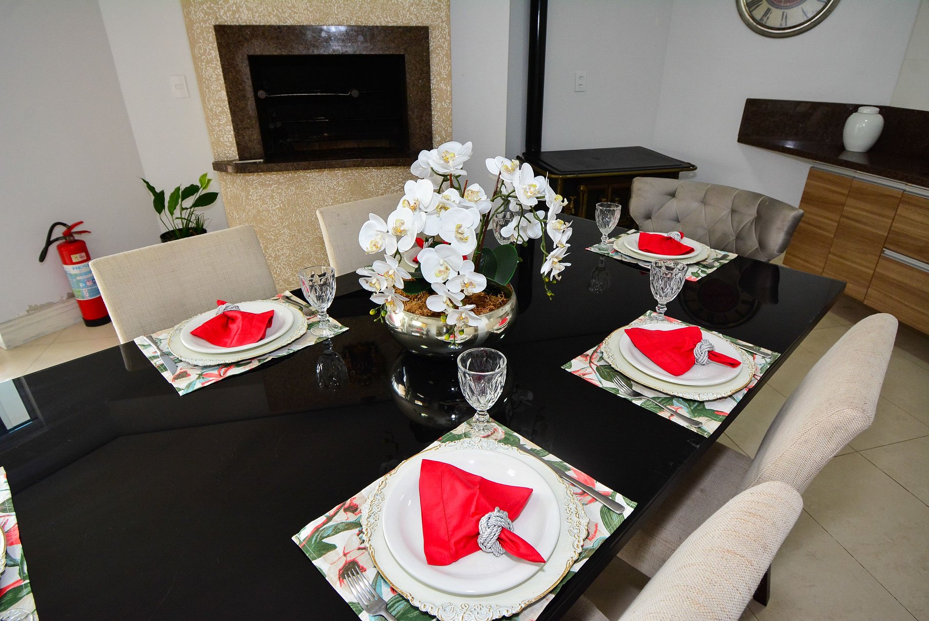 Ao lado, você encontrará uma elegante sala de jantar que também possui uma churrasqueira integrada, tornando-a ideal para refeições em família e reuniões com amigos. A cozinha é ampla e totalmente equipada com todos os utensílios de cozinha e eletrodomésticos necessários, incluindo fogão, forno, geladeira, micro-ondas, liquidificador, cafeteira e tudo que você possa precisar para preparar deliciosas refeições.
