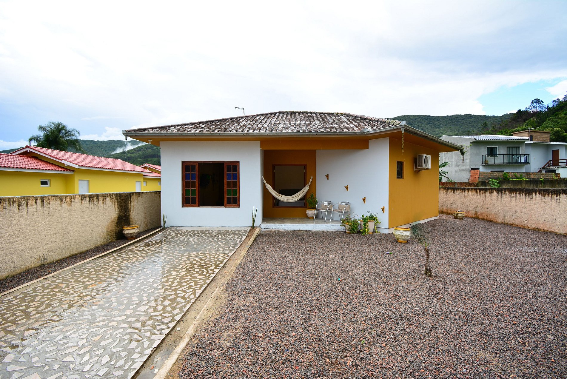 Na varanda, você encontrará uma rede de descanso, perfeita para relaxar. A casa conta com um grande pátio frontal, ideal para estacionar veículos ou para atividades ao ar livre, e um amplo pátio traseiro, com muito espaço para as crianças brincarem.