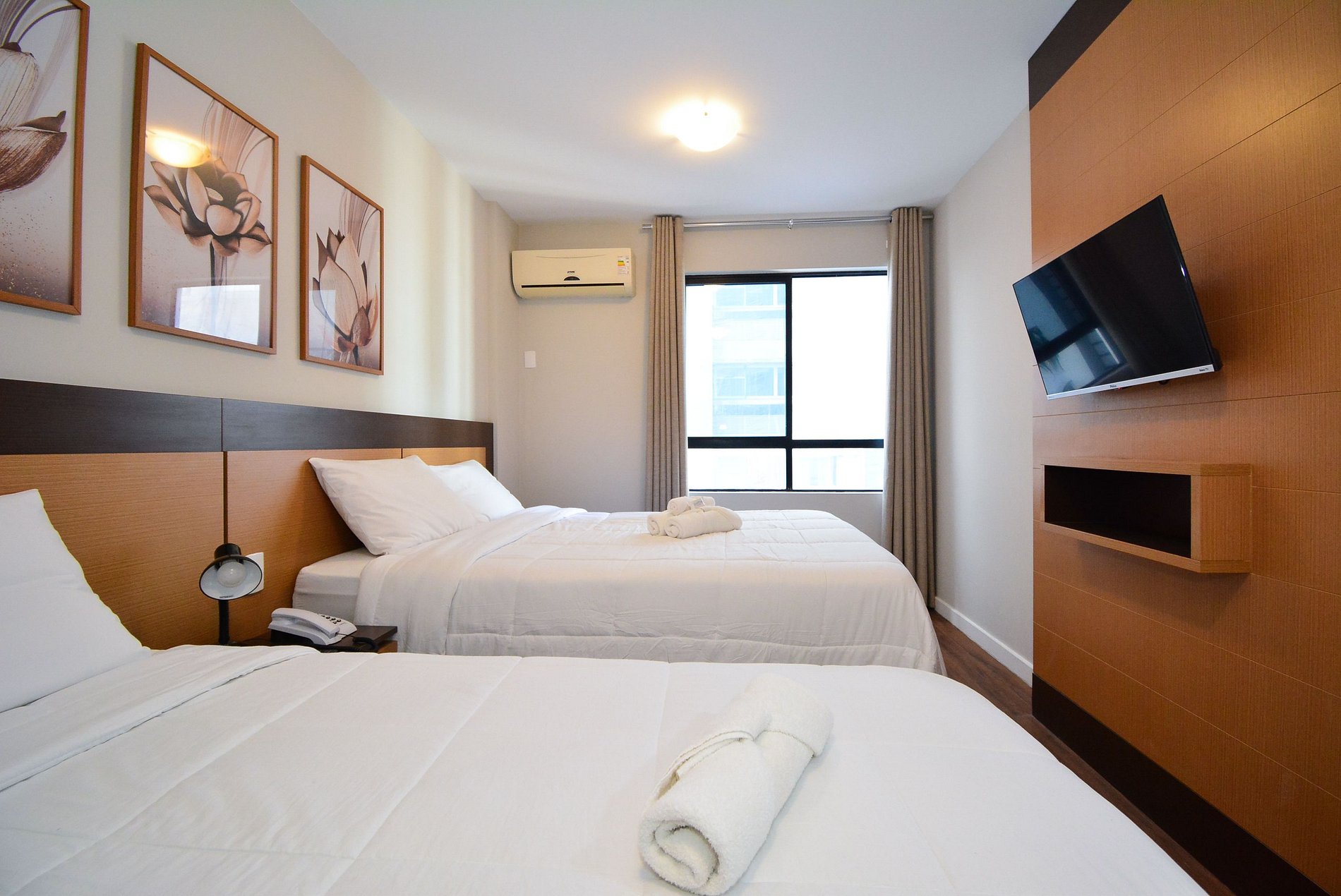 O espaço é amplo, com sala integrada a uma cozinha completa, que dispõe de fogão de indução e utensílios para o preparo de refeições, além de uma ampla janela que proporciona ótima ventilação e luminosidade. A sala conta com um confortável sofá-cama e ar-condicionado para garantir ainda mais comodidade. O flat também conta com um espaço de trabalho, um banheiro funcional e uma vaga de garagem rotativa.