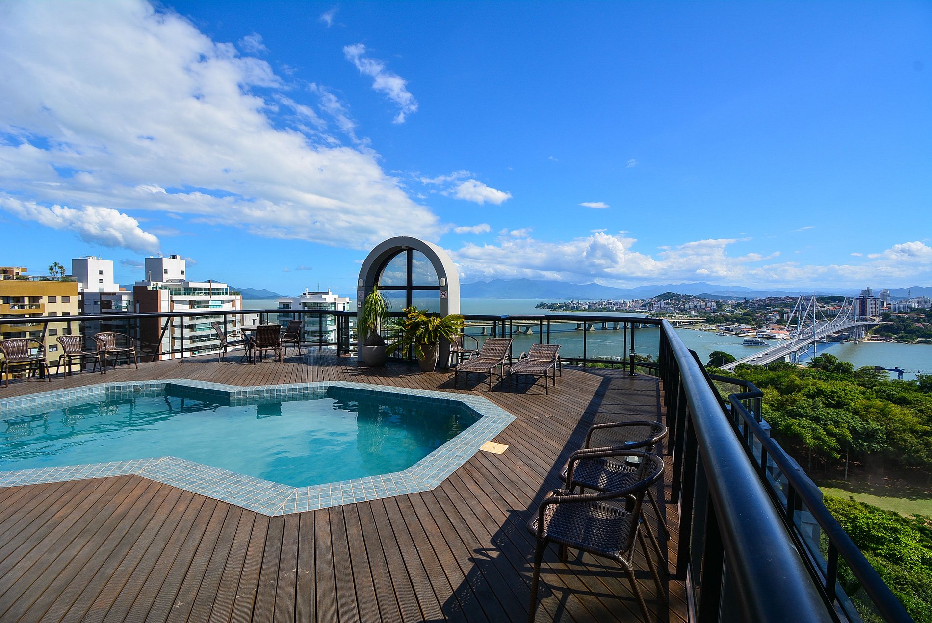 O condomínio oferece excelente infraestrutura, incluindo uma piscina no terraço com vista espetacular para a Ponte Hercílio Luz e o Parque da Luz, academia equipada, lavanderia (paga) e uma loja de conveniência para compras rápidas.