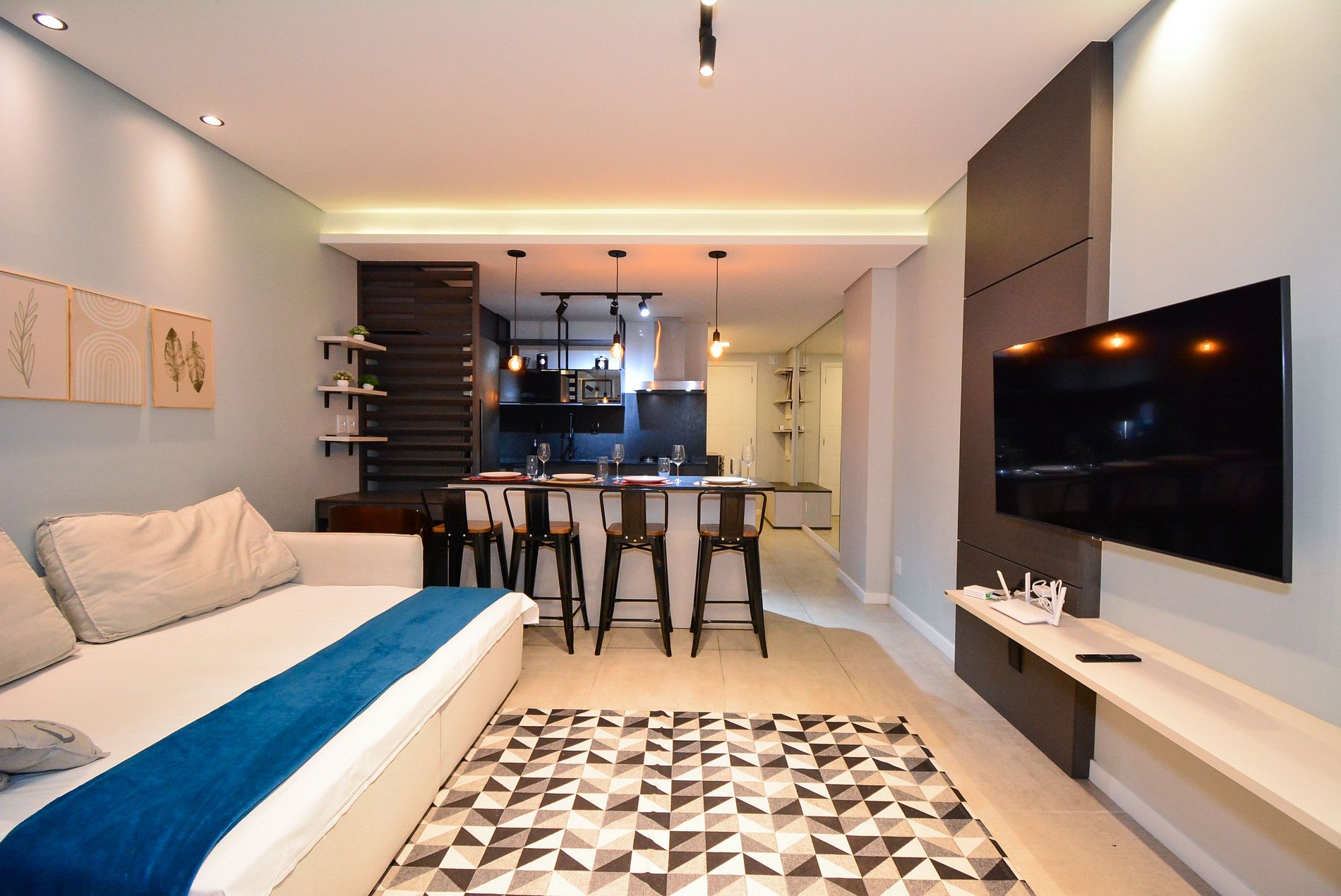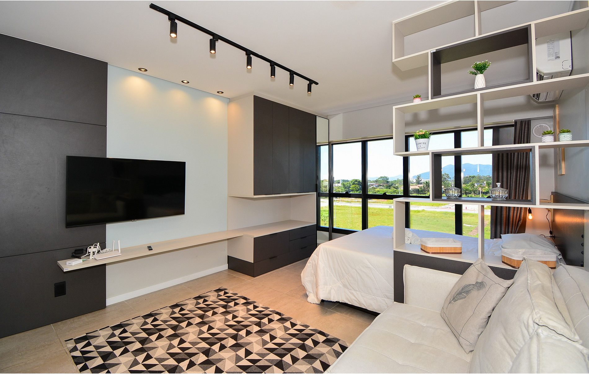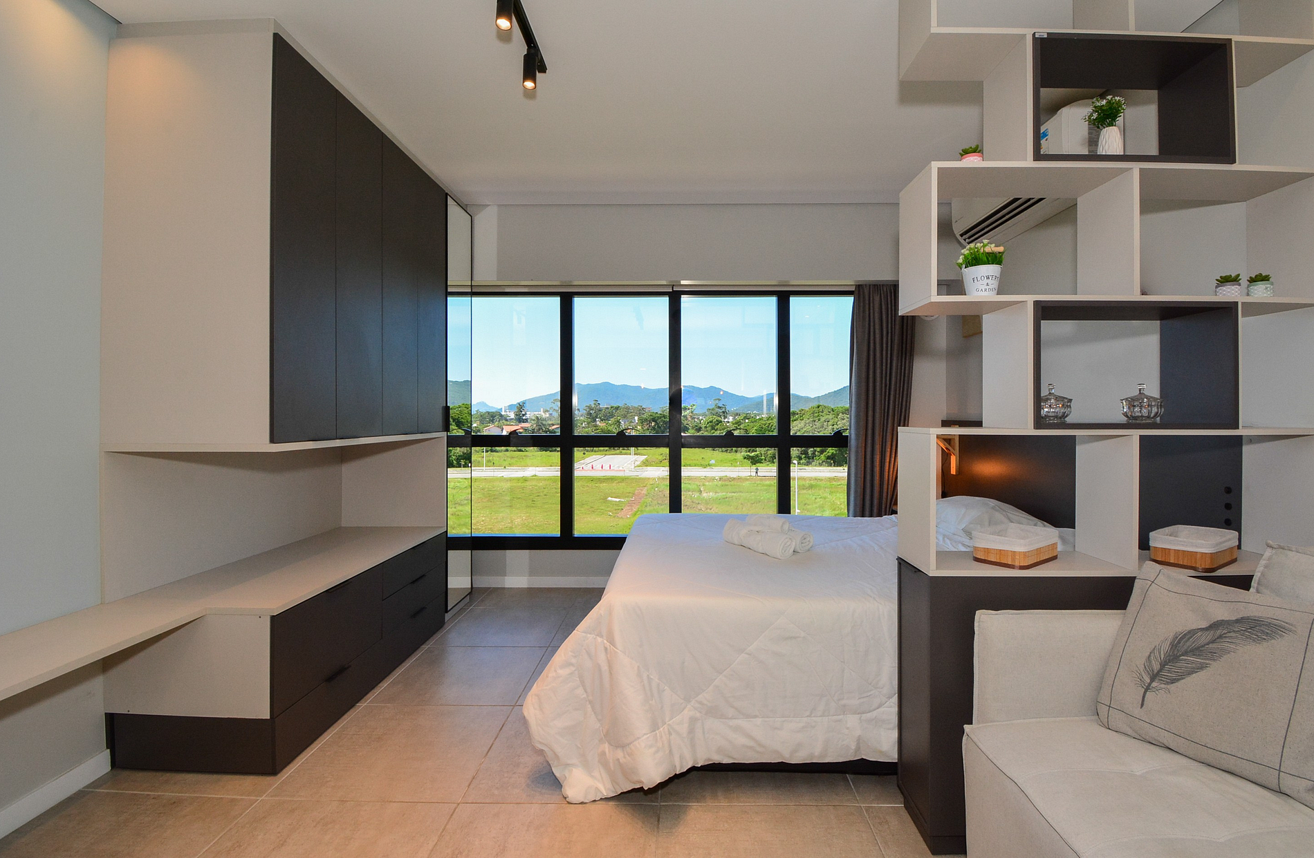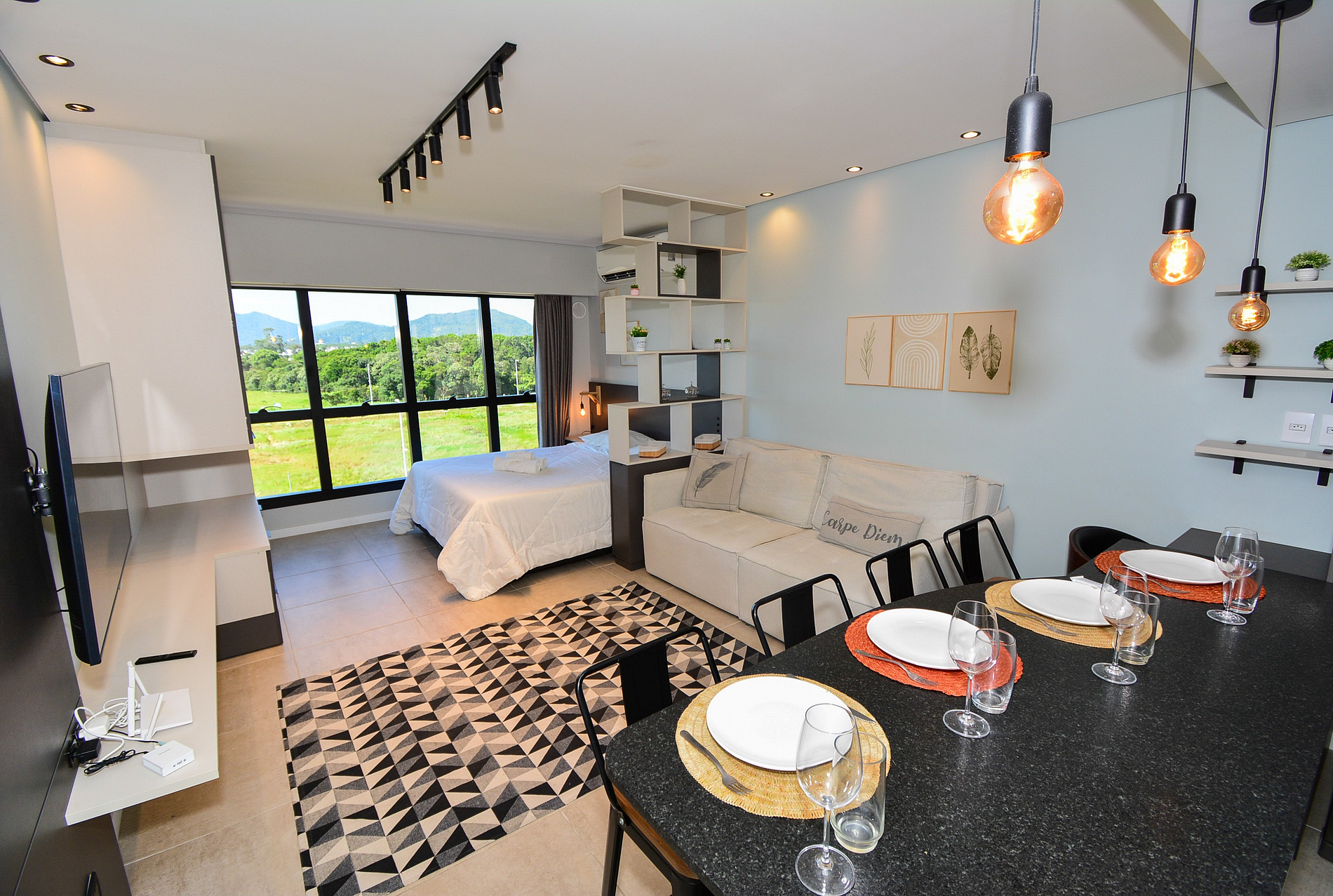 Studio moderno, confortável e totalmente equipado em um empreendimento exclusivo, com piscina de borda infinita, shopping interno e estrutura completa de lazer, conveniência e segurança em Florianópolis.