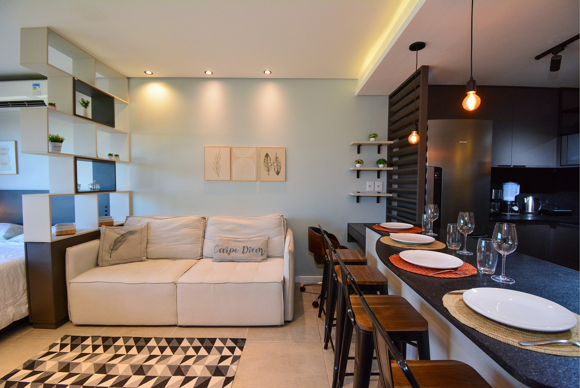O studio foi cuidadosamente planejado para unir conforto e praticidade, acomodando até 4 pessoas.