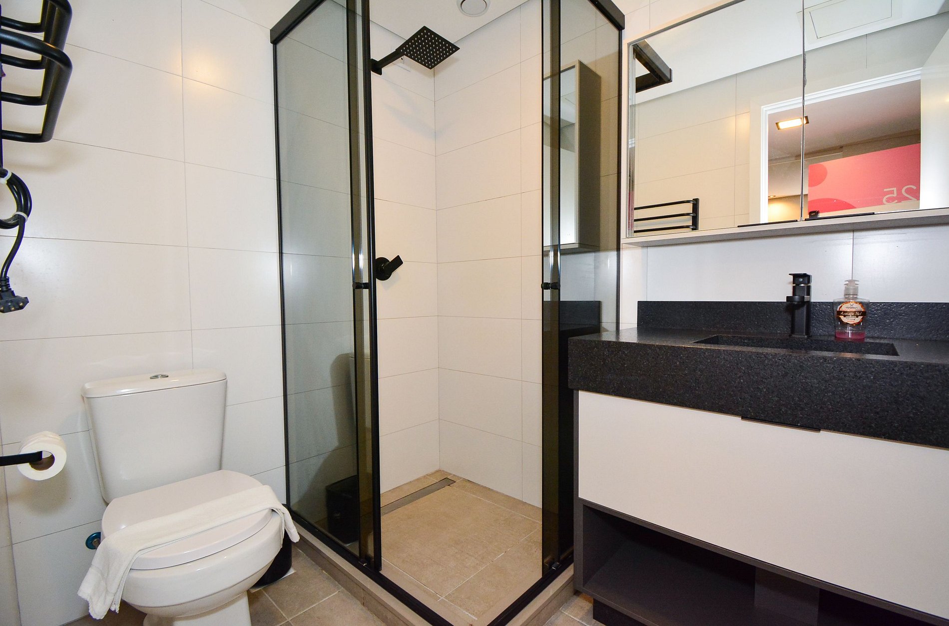 O acesso ao studio é feito por meio de fechadura eletrônica com senha personalizada, enviada antes da chegada, dispensando o uso de chaves físicas e oferecendo ainda mais praticidade.