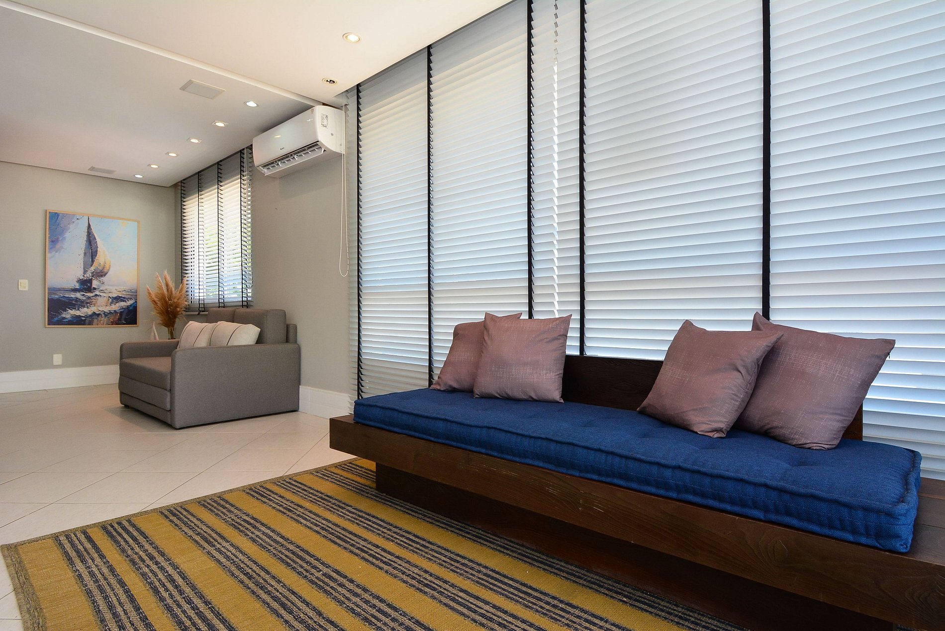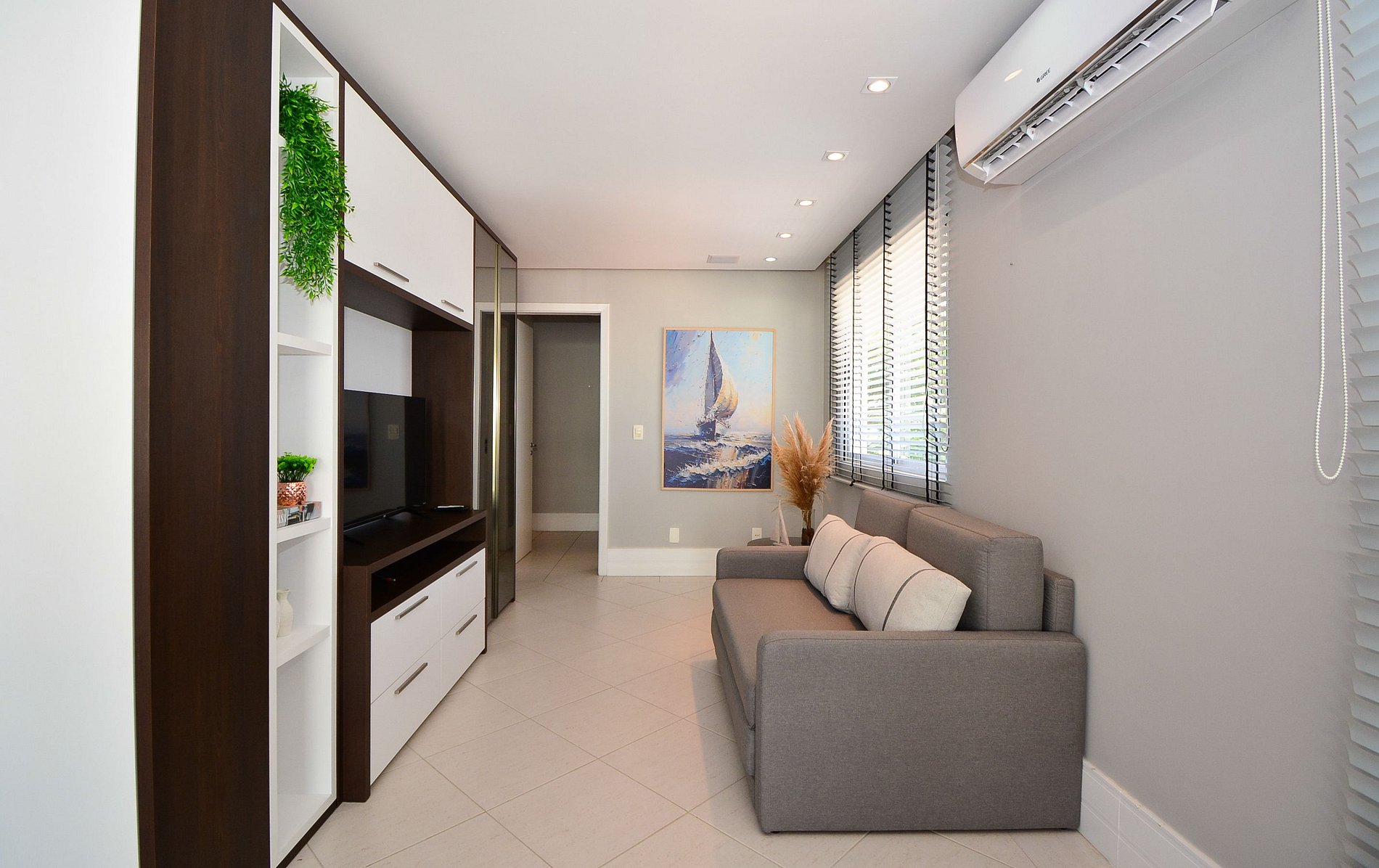 A sala de estar é ampla e convidativa, equipada com TV e dois sofás, sendo um deles sofá-cama, equipada com ar condicionado proporcionando um ambiente aconchegante para descansar após um dia de praia.