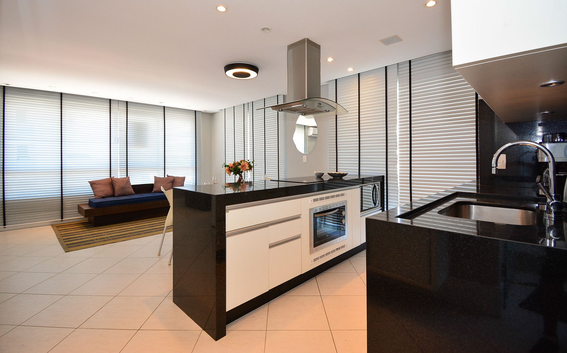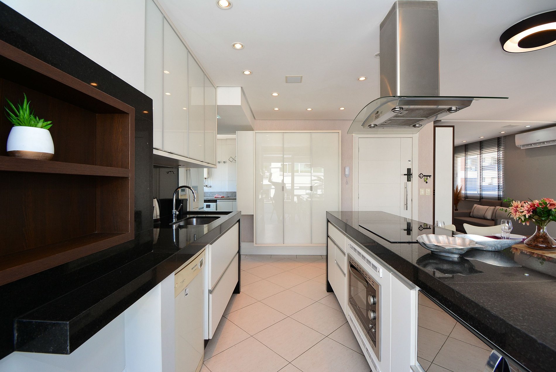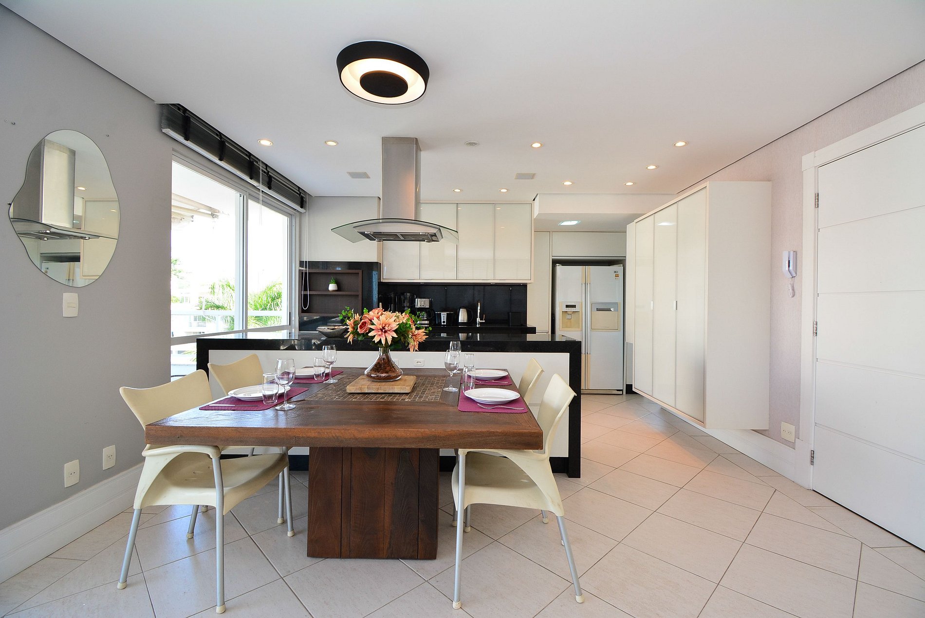 A cozinha moderna e totalmente equipada e com e uma churrasqueira privativa e todos os utensílios e eletrodomésticos necessários para preparar suas refeições com praticidade, além de contar com uma área de serviço com máquina de lavar roupas para maior comodidade.