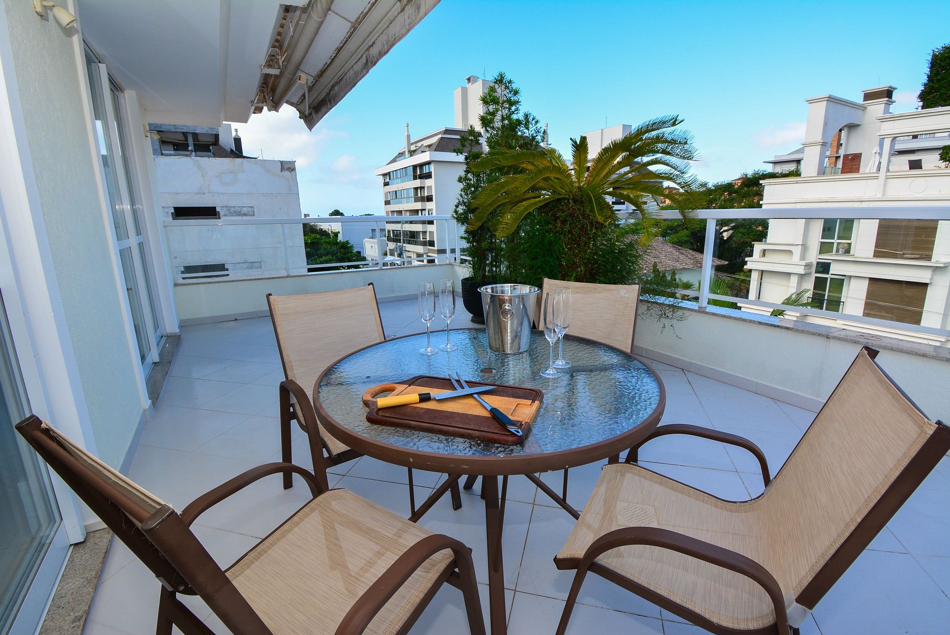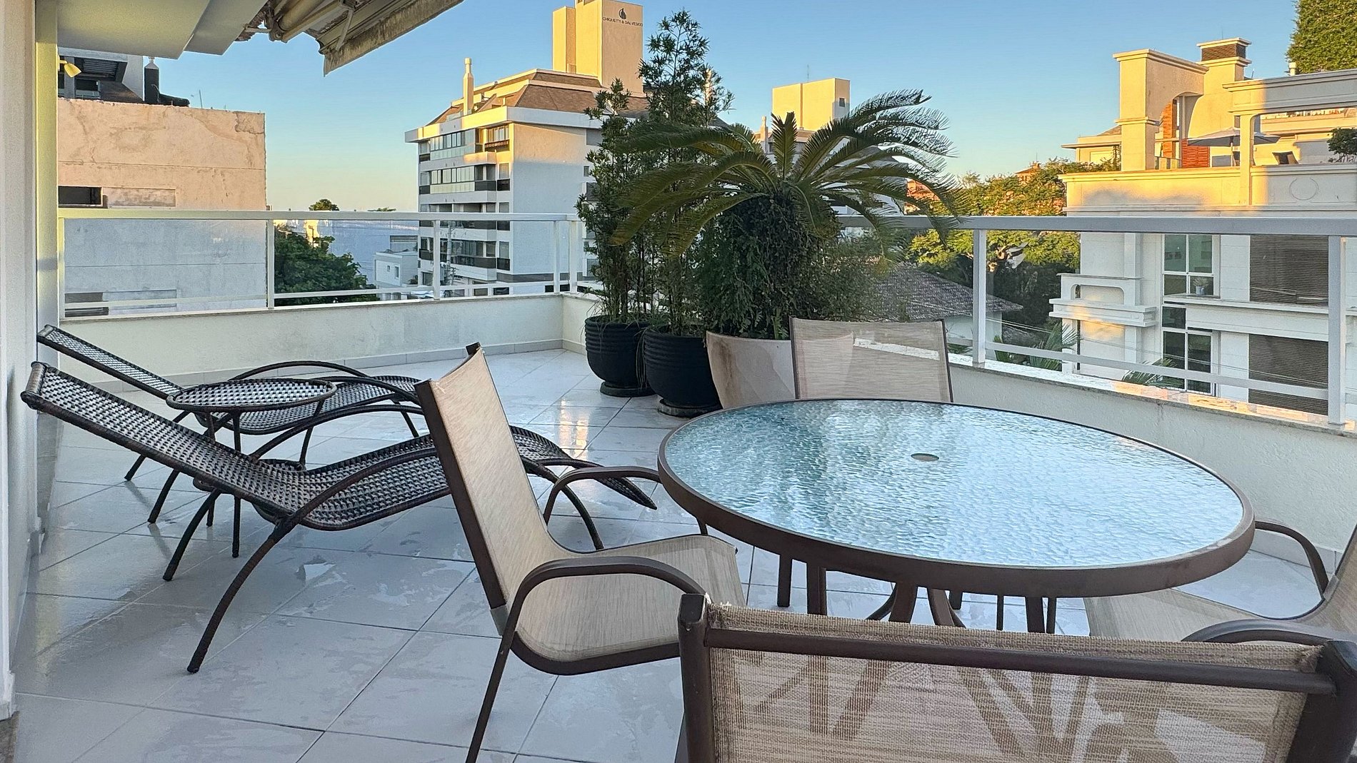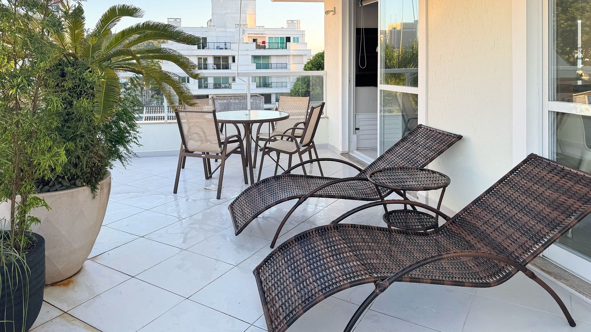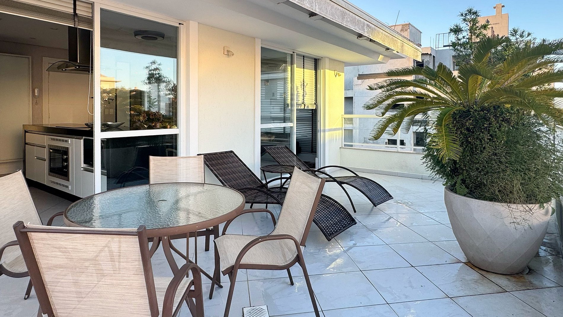 O grande destaque é o terraço privativo, perfeito para momentos ao ar livre, com uma mesa, duas espreguiçadeiras, criando o cenário ideal para refeições ao ar livre ou momentos de relaxamento.