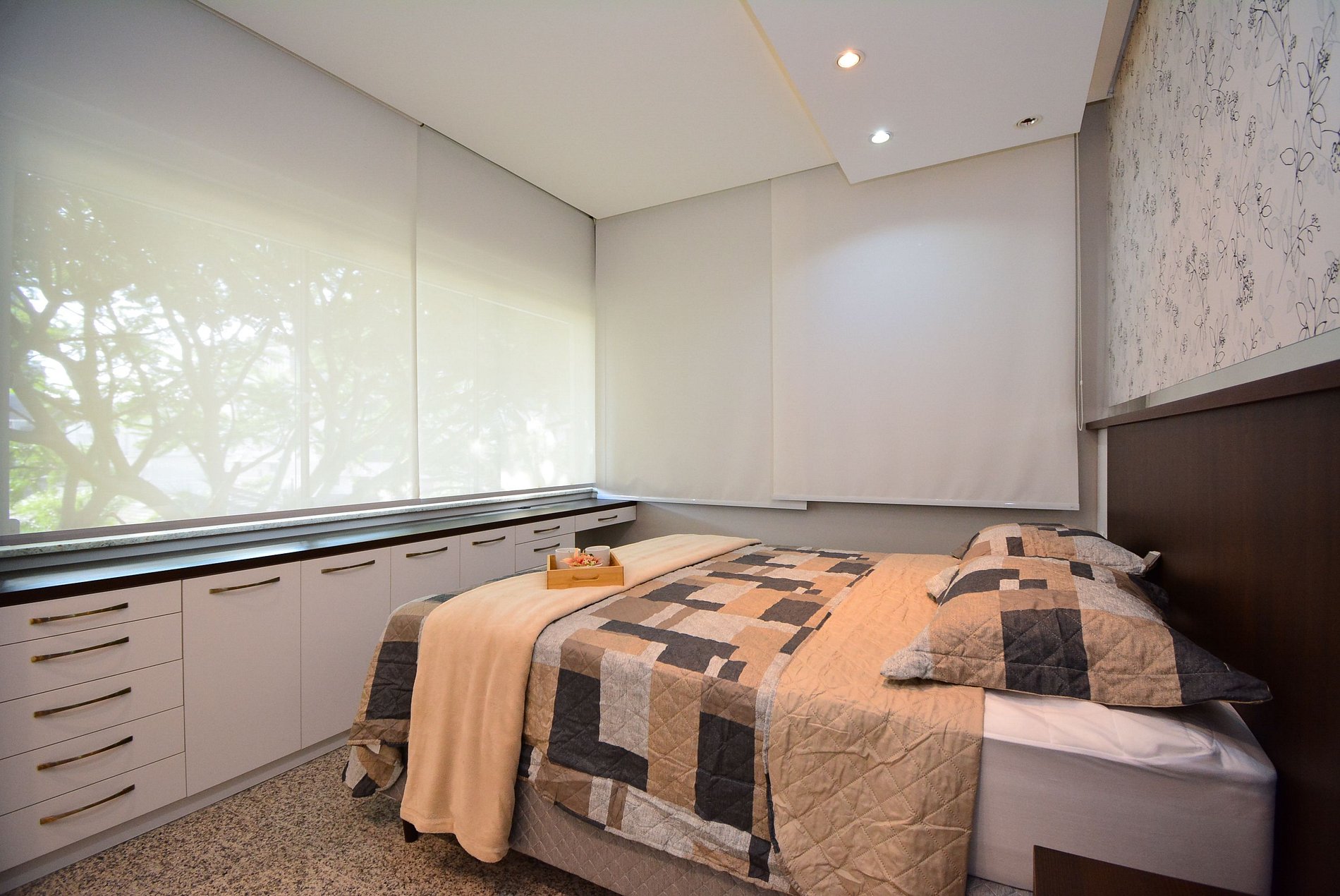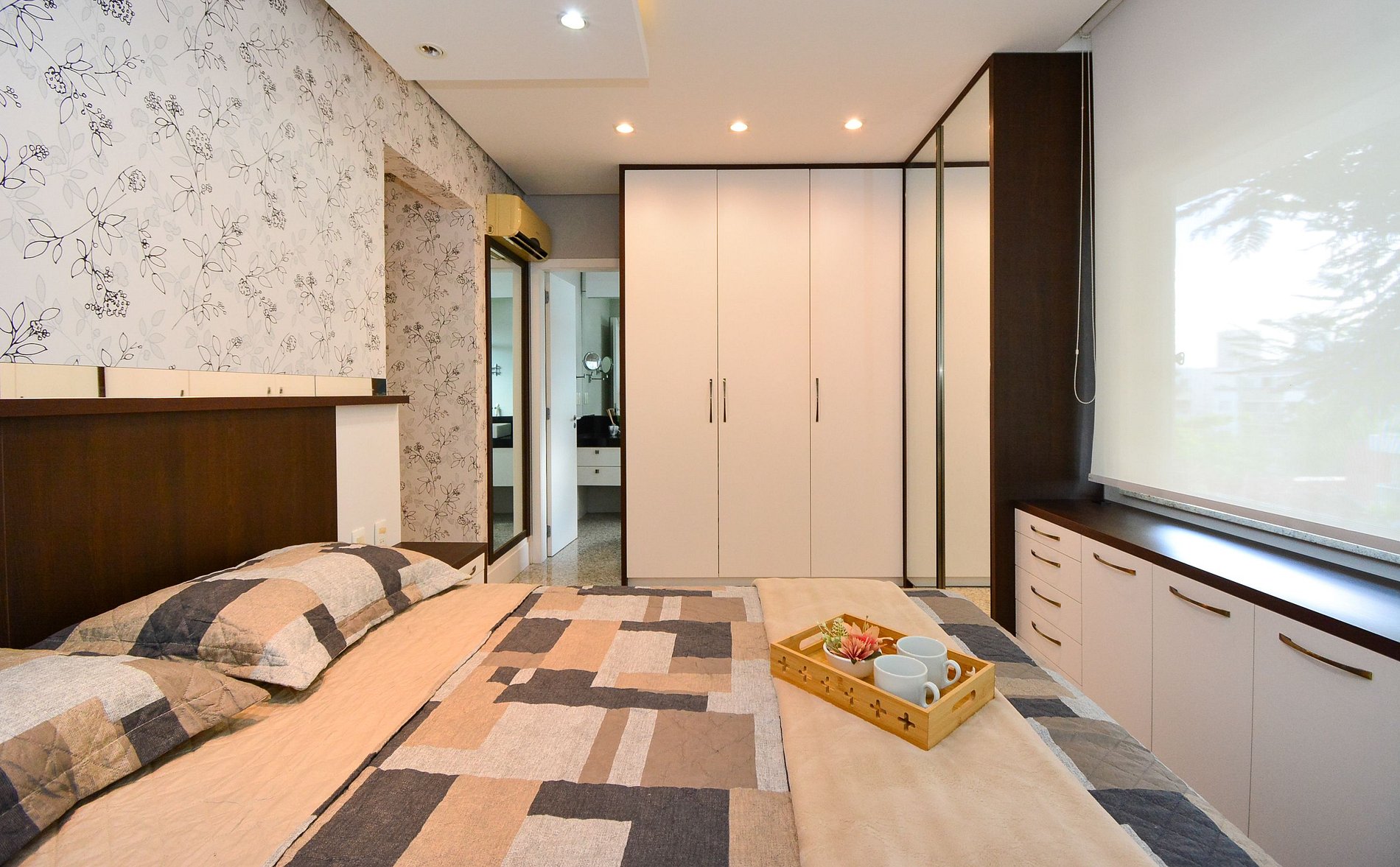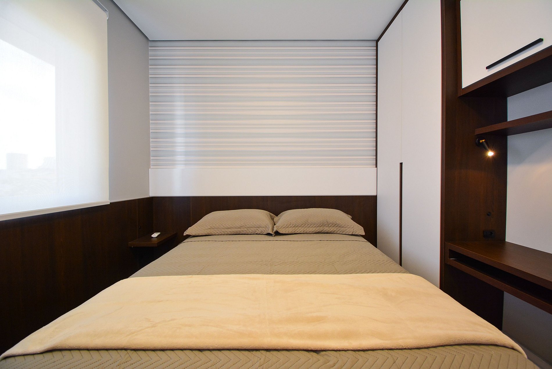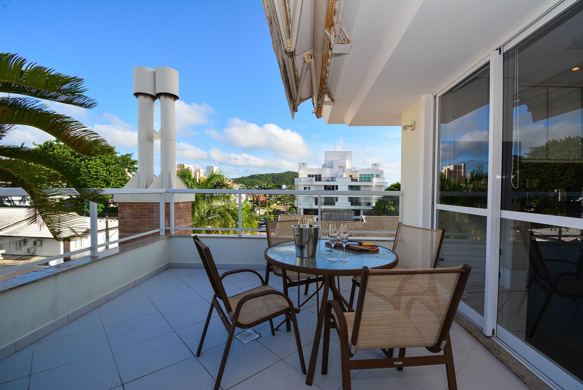 O grande destaque é o terraço privativo, perfeito para momentos ao ar livre, com uma mesa, duas espreguiçadeiras, criando o cenário ideal para refeições ao ar livre ou momentos de relaxamento.