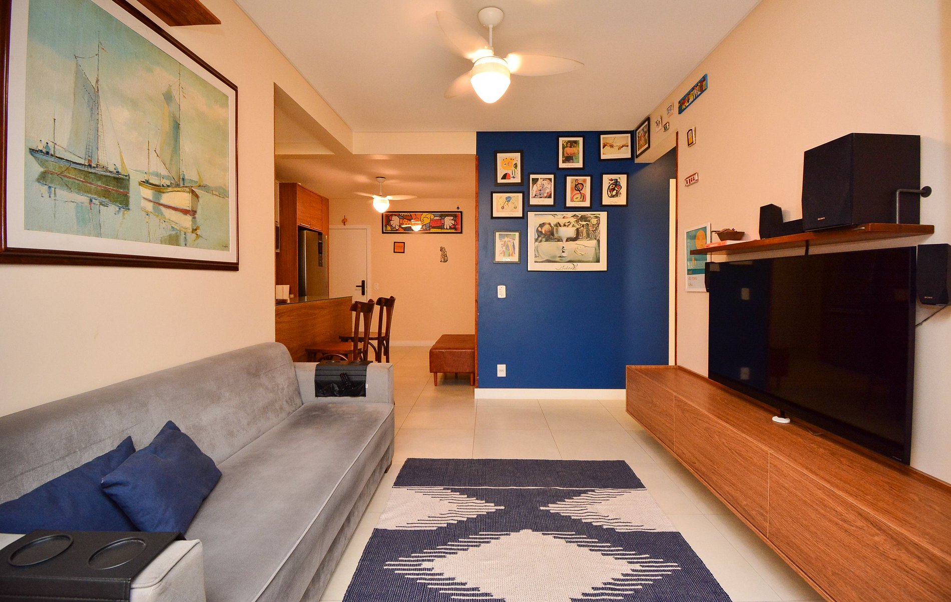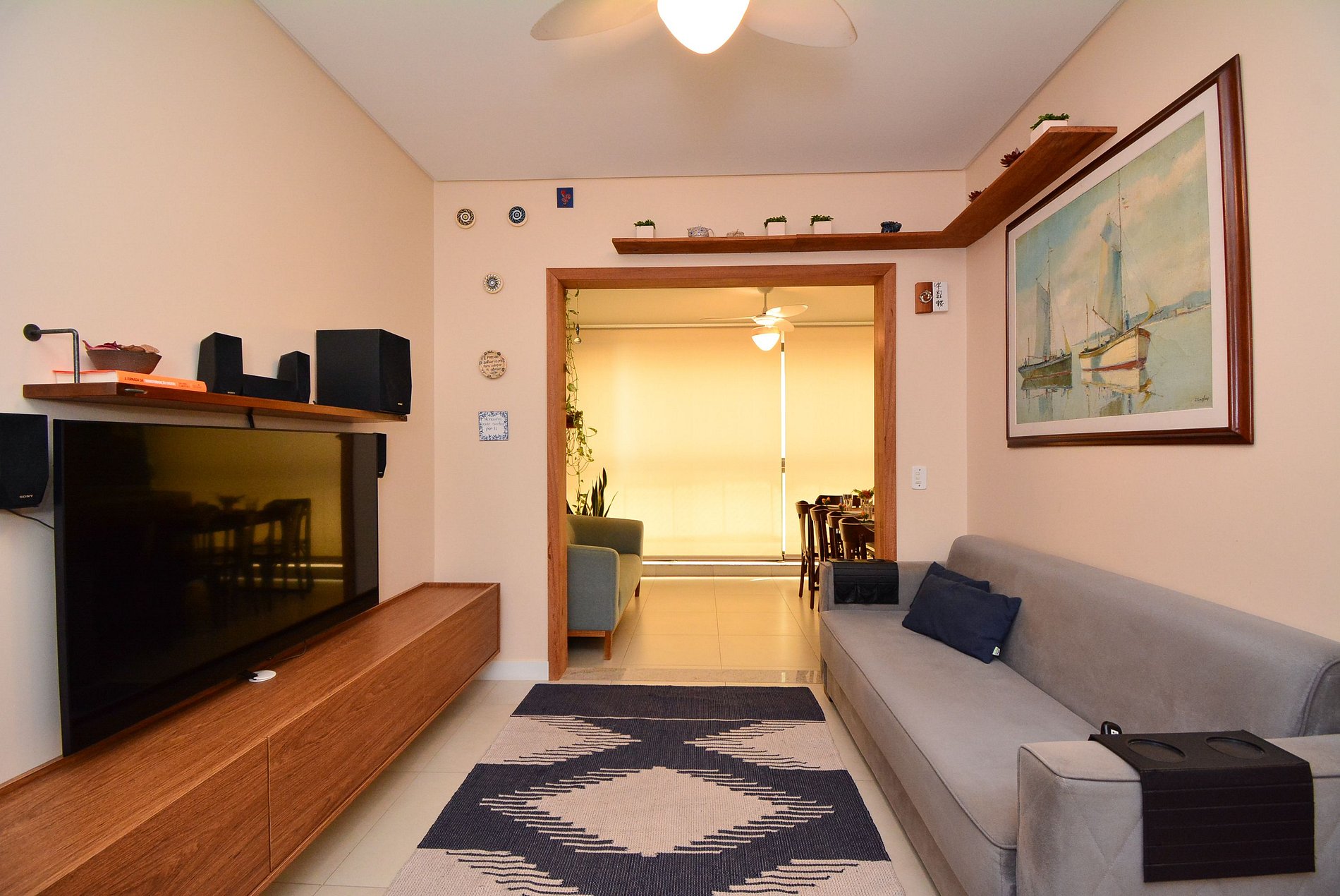 O apartamento é decorado com um estilo aconchegante e funcional, proporcionando um ambiente agradável para os hóspedes. A sala de estar é ampla e bem iluminada, equipada com um sofá confortável e TV, ideal para momentos de descanso. Esse espaço se integra harmoniosamente à sacada, criando uma área social espaçosa e convidativa.