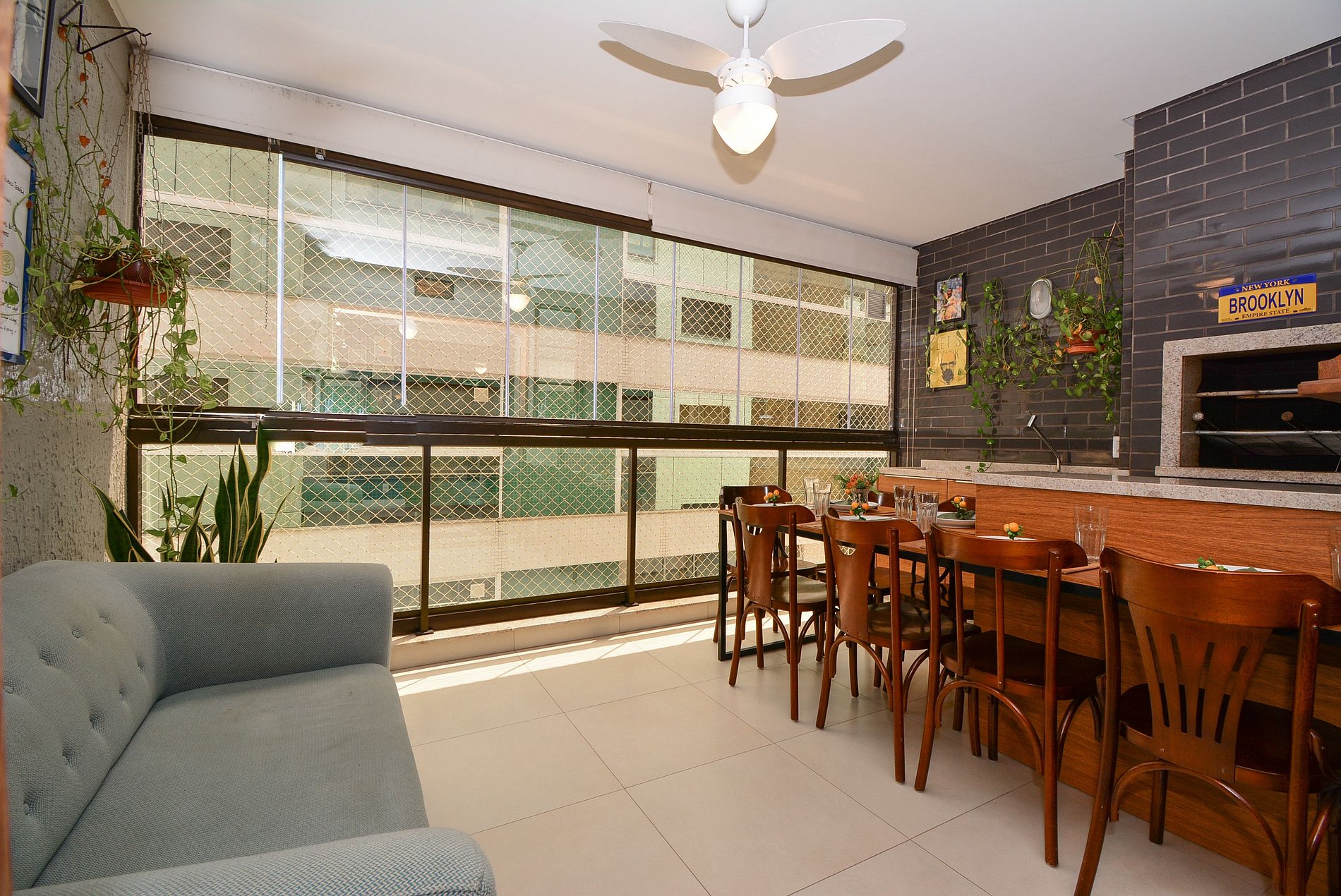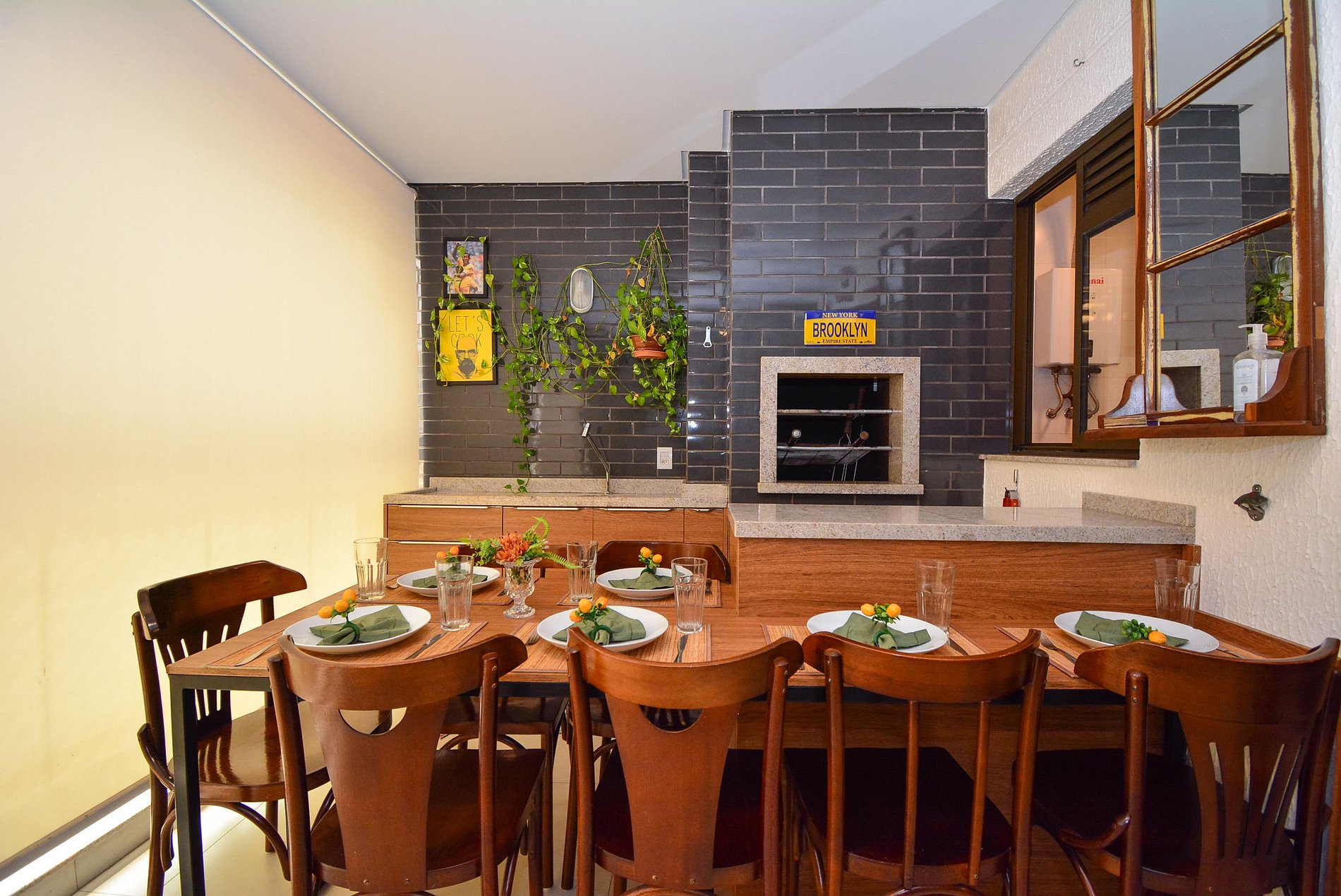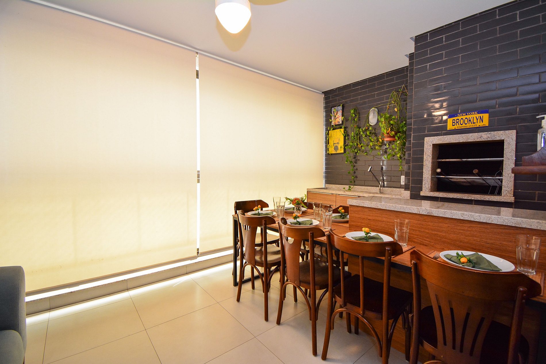 A sacada conta com uma churrasqueira privativa, perfeita para preparar refeições e desfrutar de momentos especiais com a família e amigos. As janelas retráteis permitem a abertura total do ambiente, proporcionando excelente ventilação natural e aproveitamento da luz do dia, tornando o espaço ainda mais agradável. Quando fechadas, garantem conforto térmico e proteção contra vento ou chuva, permitindo que a área seja utilizada em qualquer época do ano. A disposição inteligente desse ambiente possibilita que os hóspedes desfrutem tanto de um espaço aberto e arejado quanto de um local mais reservado e aconchegante, conforme a necessidade.