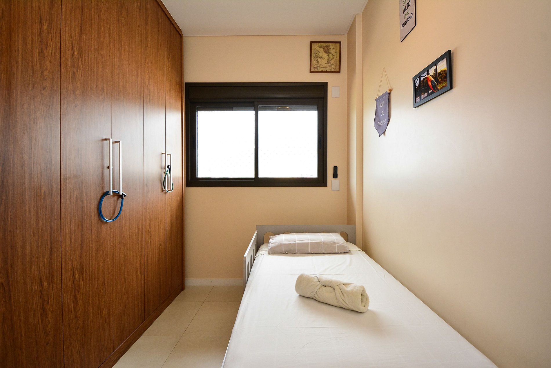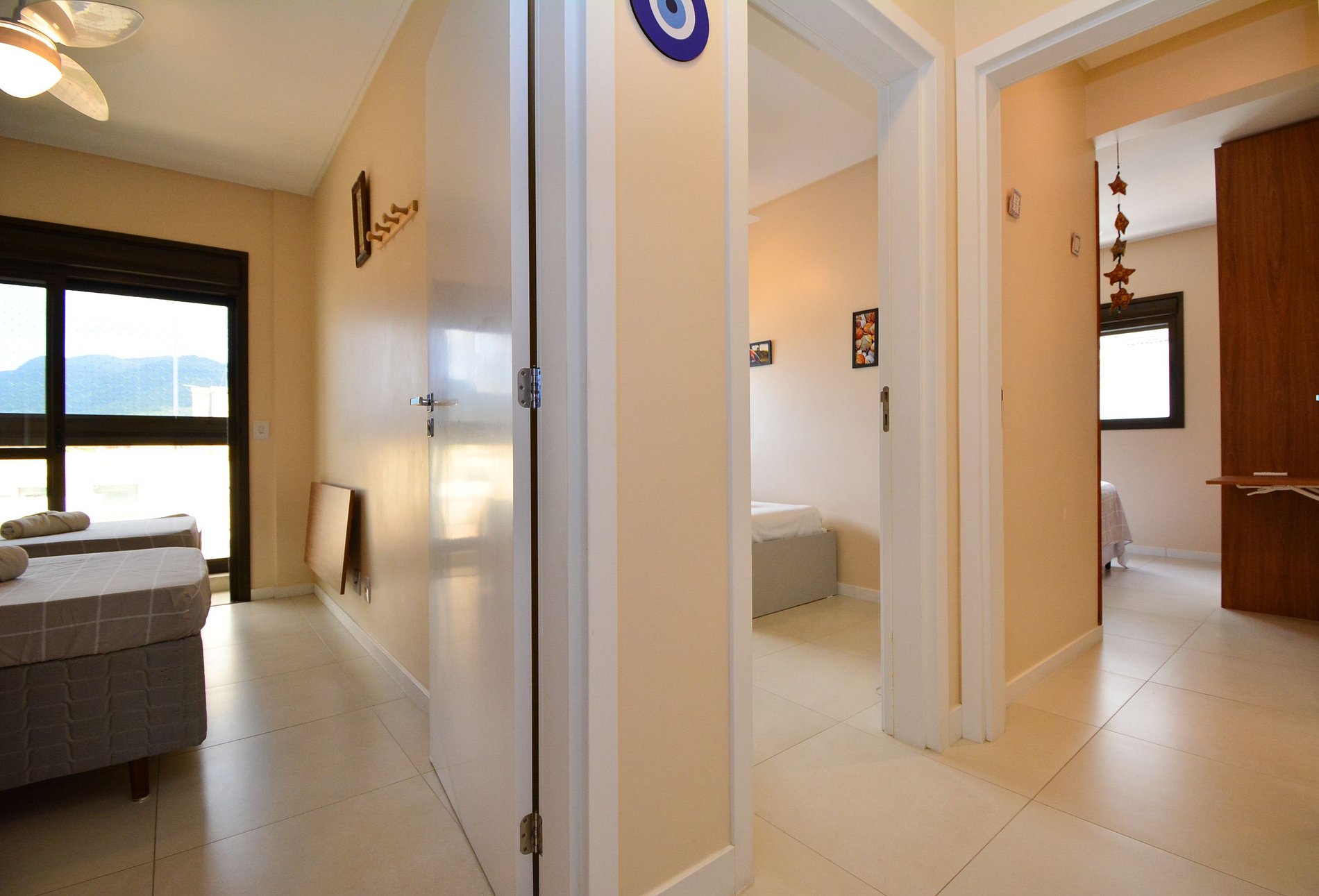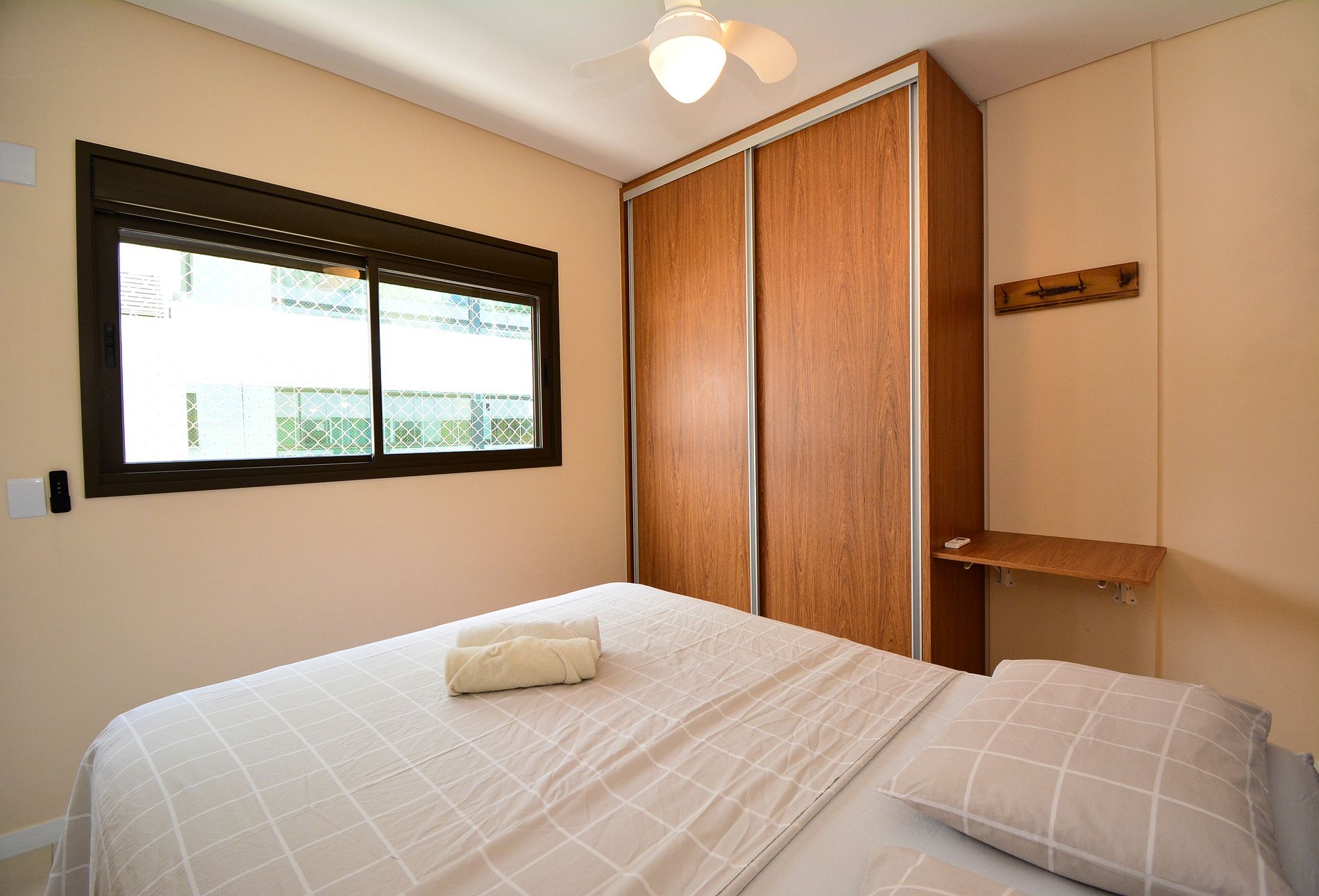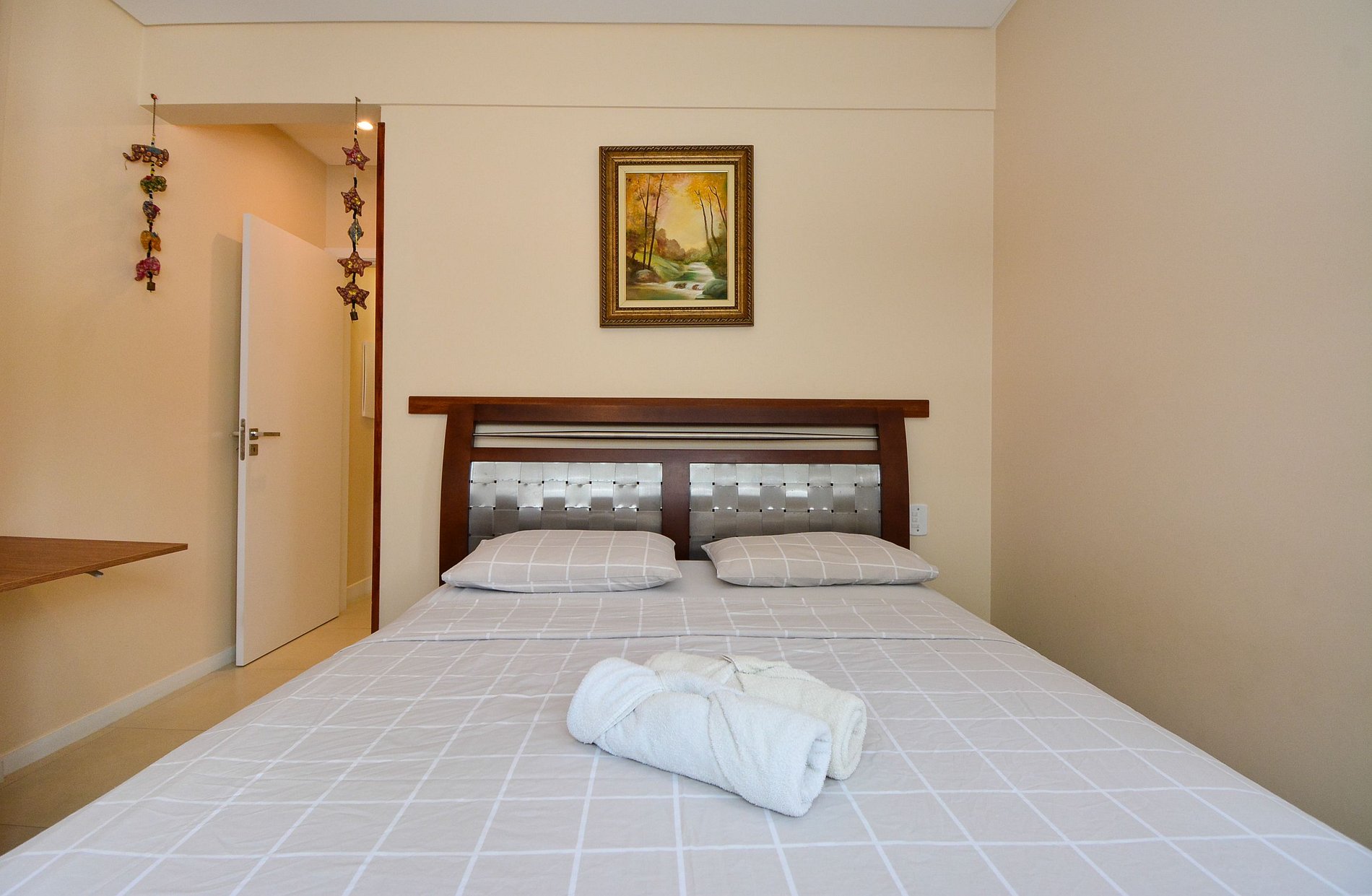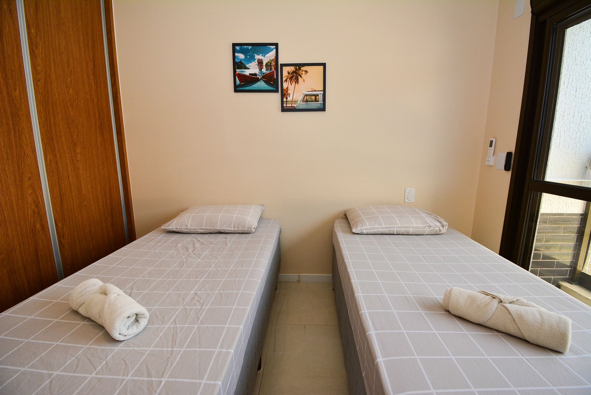 O apartamento possui três quartos bem distribuídos, sendo uma suíte com cama queen e armários, um quarto com duas camas de solteiro que podem ser unidas para formar uma cama de casal e um quarto com uma cama de solteiro e uma cama auxiliar, além de um banheiro social completo. Para maior conforto, todos os quartos possuem ar-condicionado e a sala conta com ventilador de teto. Roupas de cama e banho são fornecidas para todos os hóspedes.