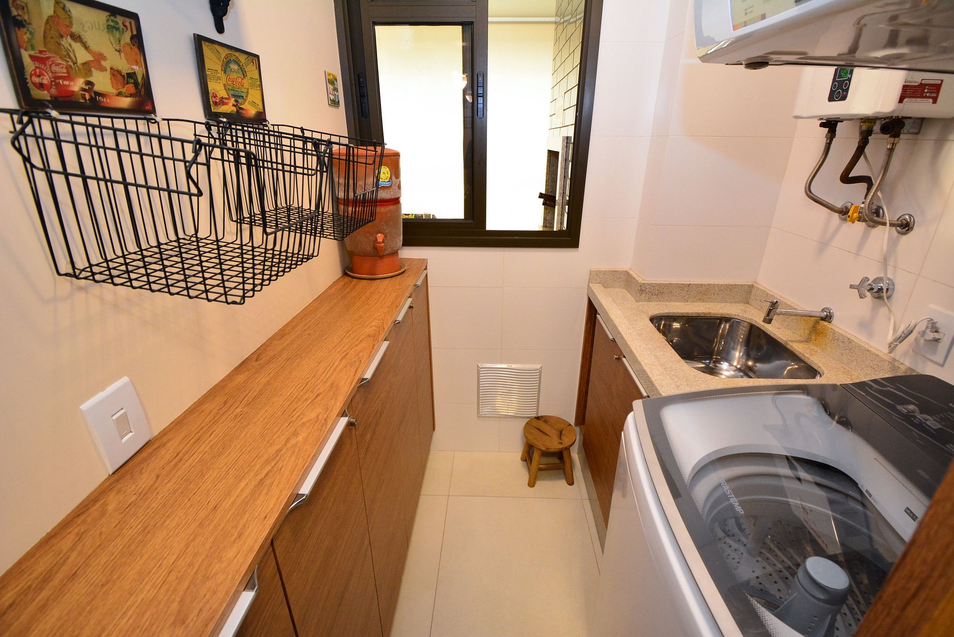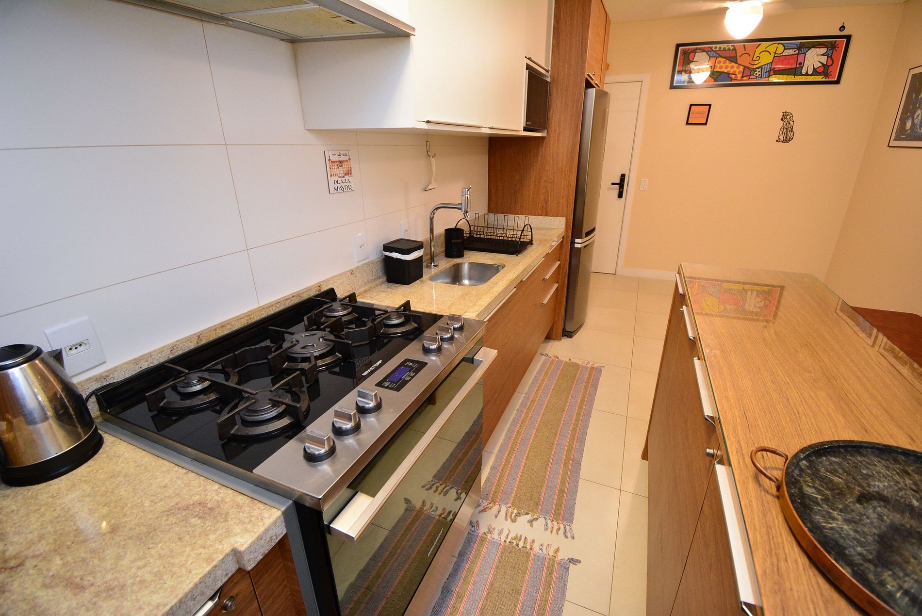 A cozinha é equipada com todos os utensílios necessários, incluindo geladeira, fogão, micro-ondas, louças e demais itens essenciais para preparar refeições com praticidade.