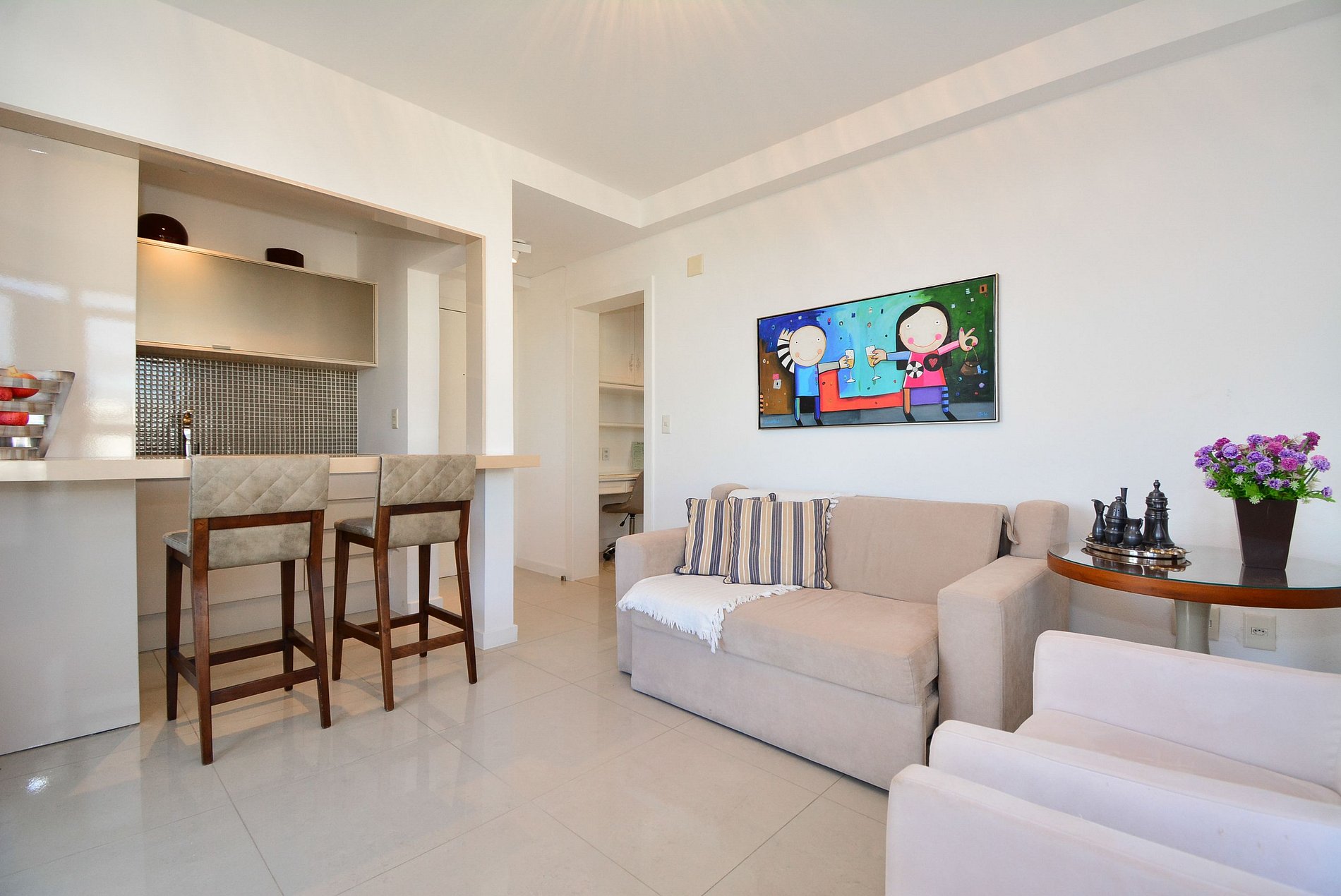 A cozinha equipada, com fogão de indução e utensílios básicos, permite o preparo de refeições práticas e saborosas. A sala de estar confortável e acesso a uma sacada charmosa com cadeiras, perfeita para relaxar e apreciar a vista deslumbrante da Ponte Hercílio Luz. O flat também dispõe de um espaço de trabalho reservado, ideal para quem precisa conciliar lazer e produtividade. O banheiro funcional completa o ambiente com praticidade e conforto.