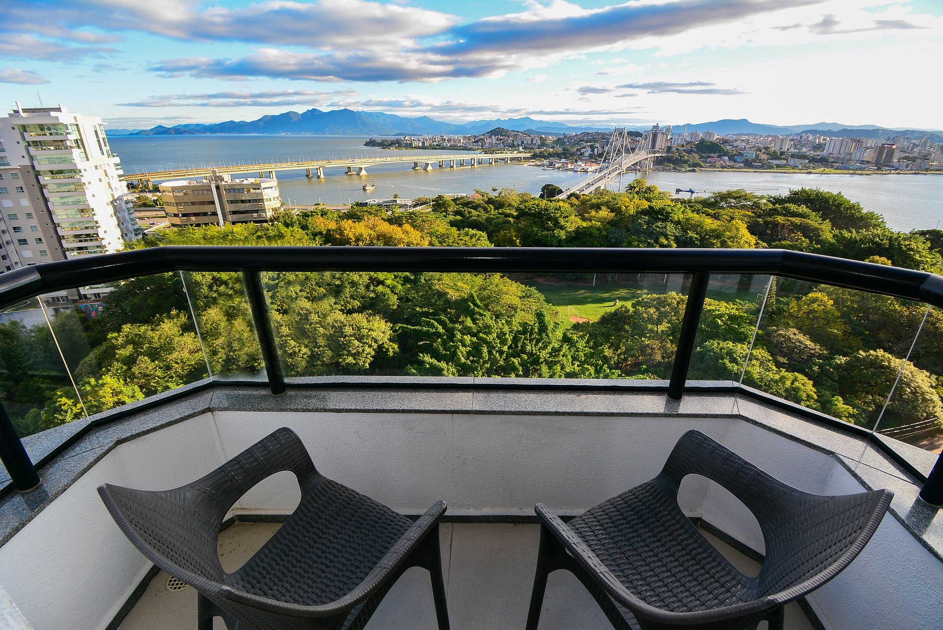 Desfrute do melhor de Florianópolis neste flat encantador com uma vista privilegiada da icônica Ponte Hercílio Luz, localizado no Central Park Flat Residence, em frente ao Parque da Luz e a apenas 4 minutos de caminhada da ponte mais famosa da cidade.