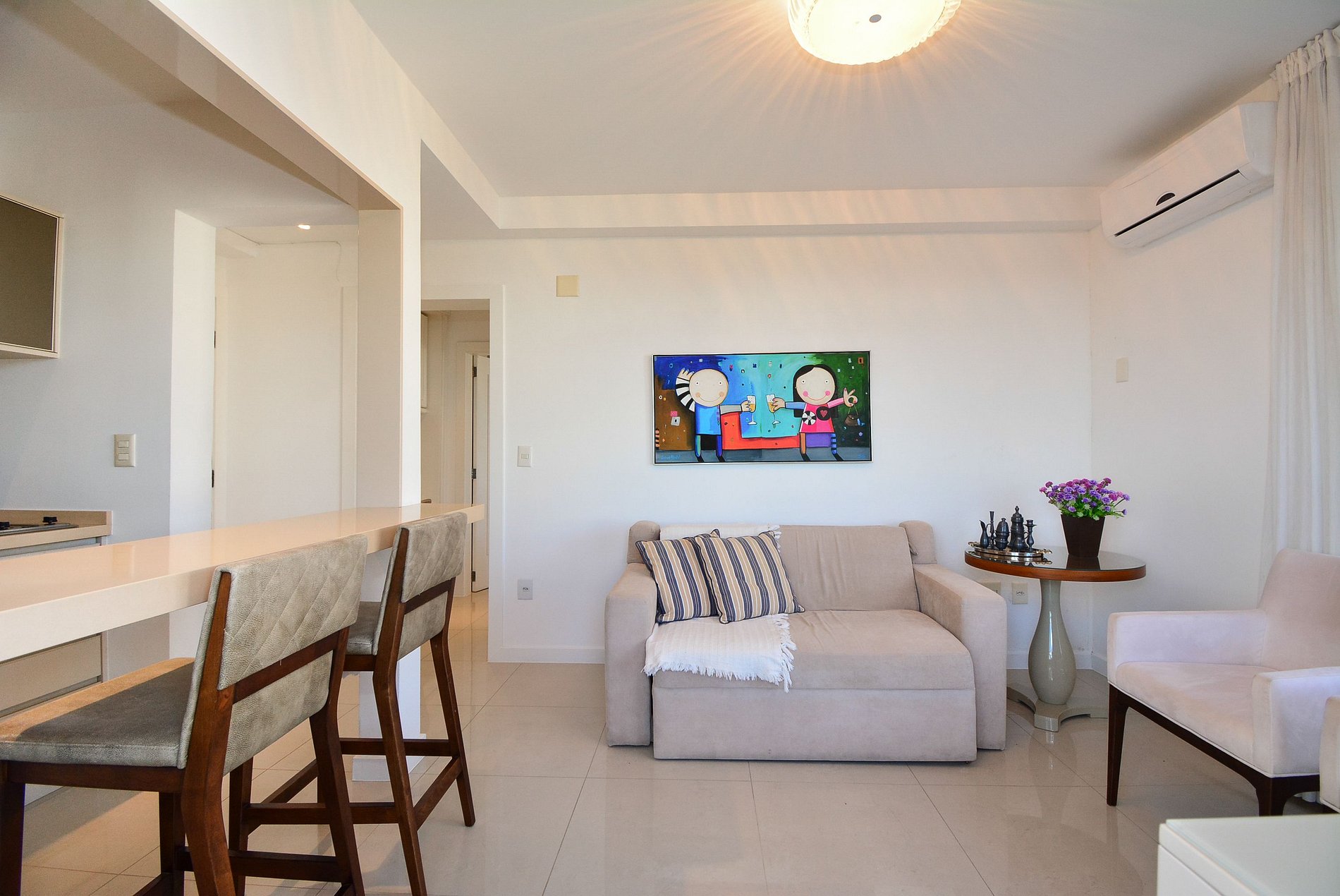 Ideal para até 4 pessoas, o espaço conta com um quarto privativo com cama queen e ar-condicionado, além de uma sala aconchegante com sofá-cama e também ar-condicionado, garantindo conforto em todos os ambientes.