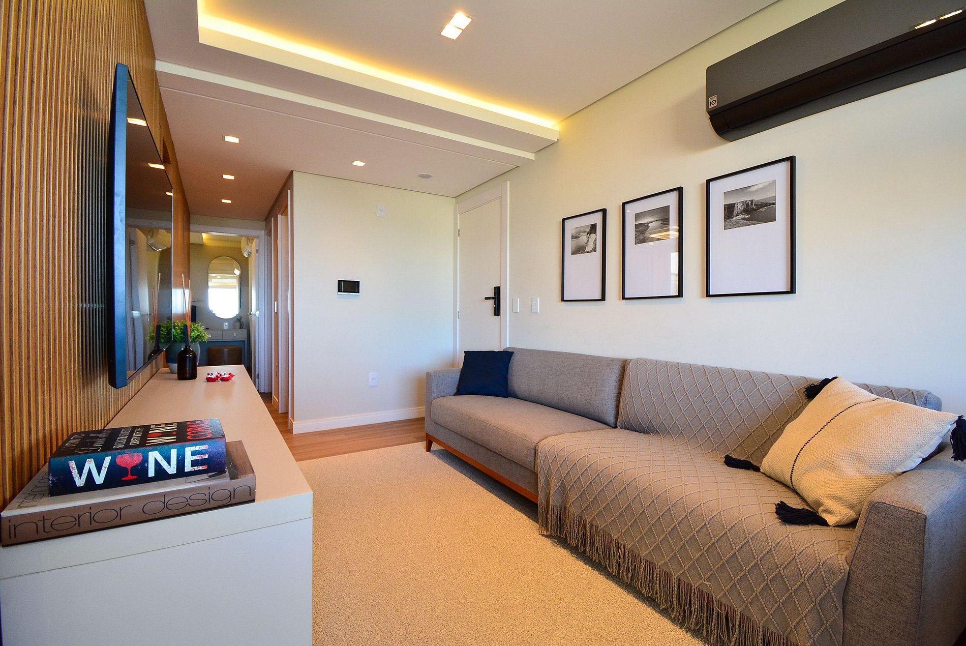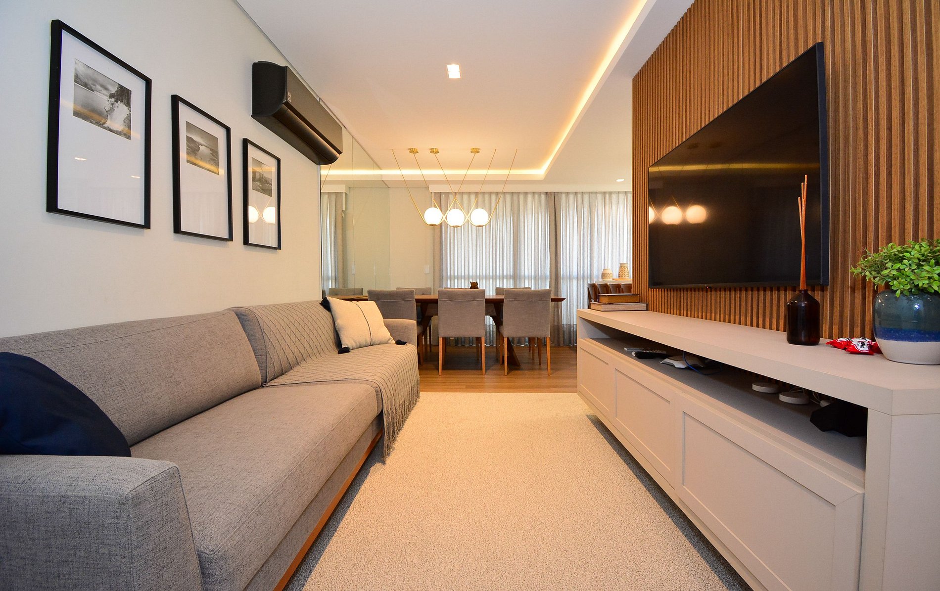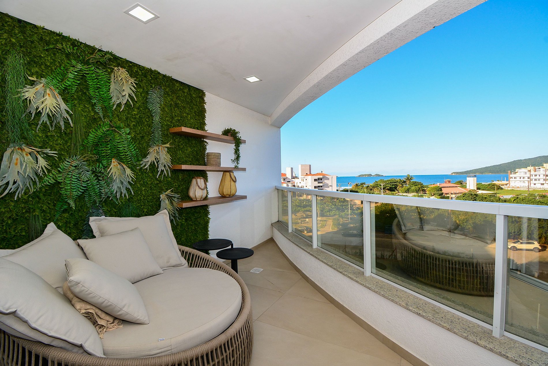 O grande destaque deste apartamento é sua sacada decorada com muito aconchego — um espaço cuidadosamente preparado para relaxar, ler um livro ou simplesmente apreciar a belíssima vista para o mar da Praia dos Ingleses.