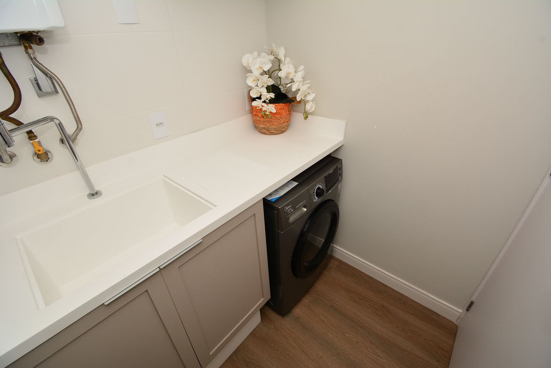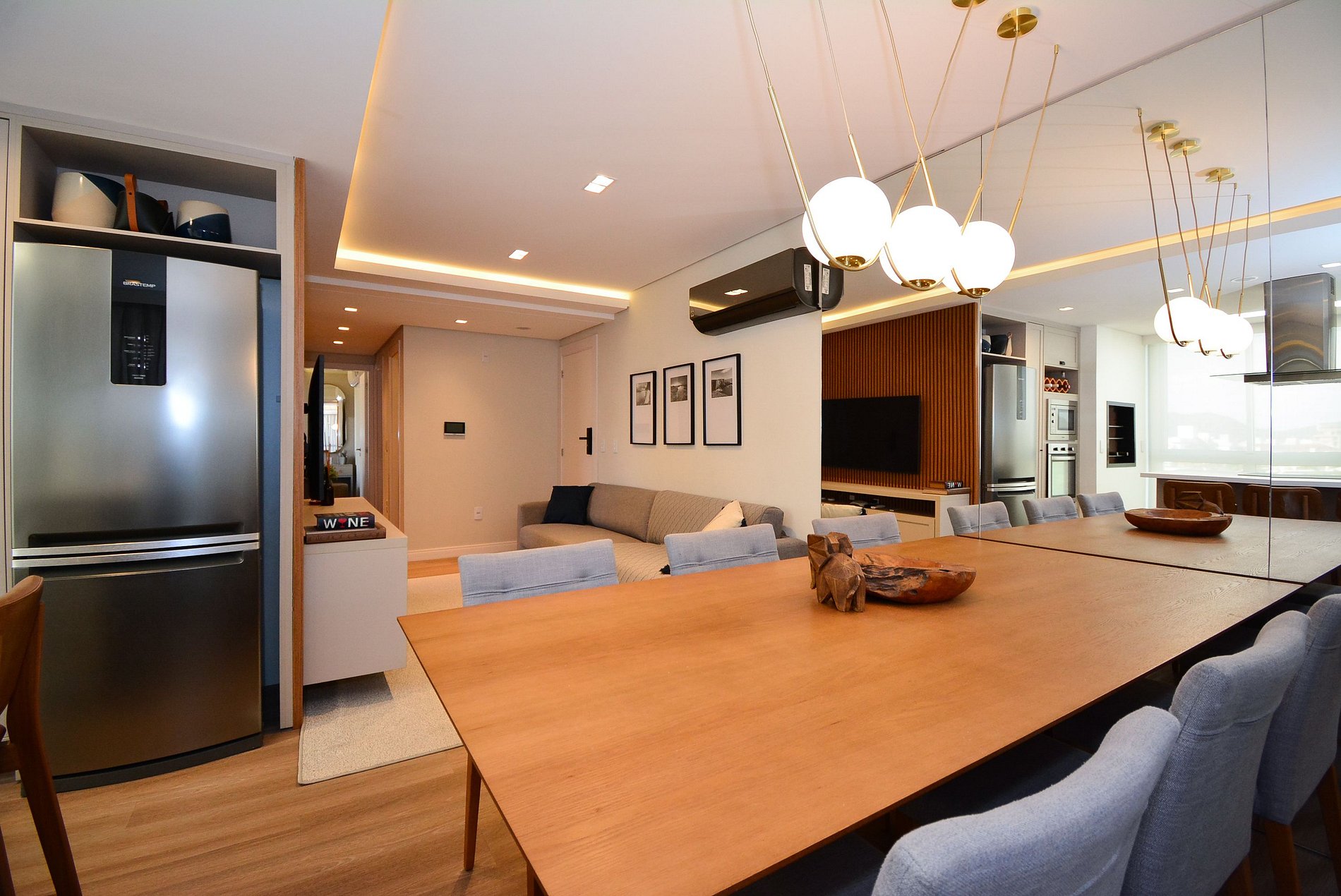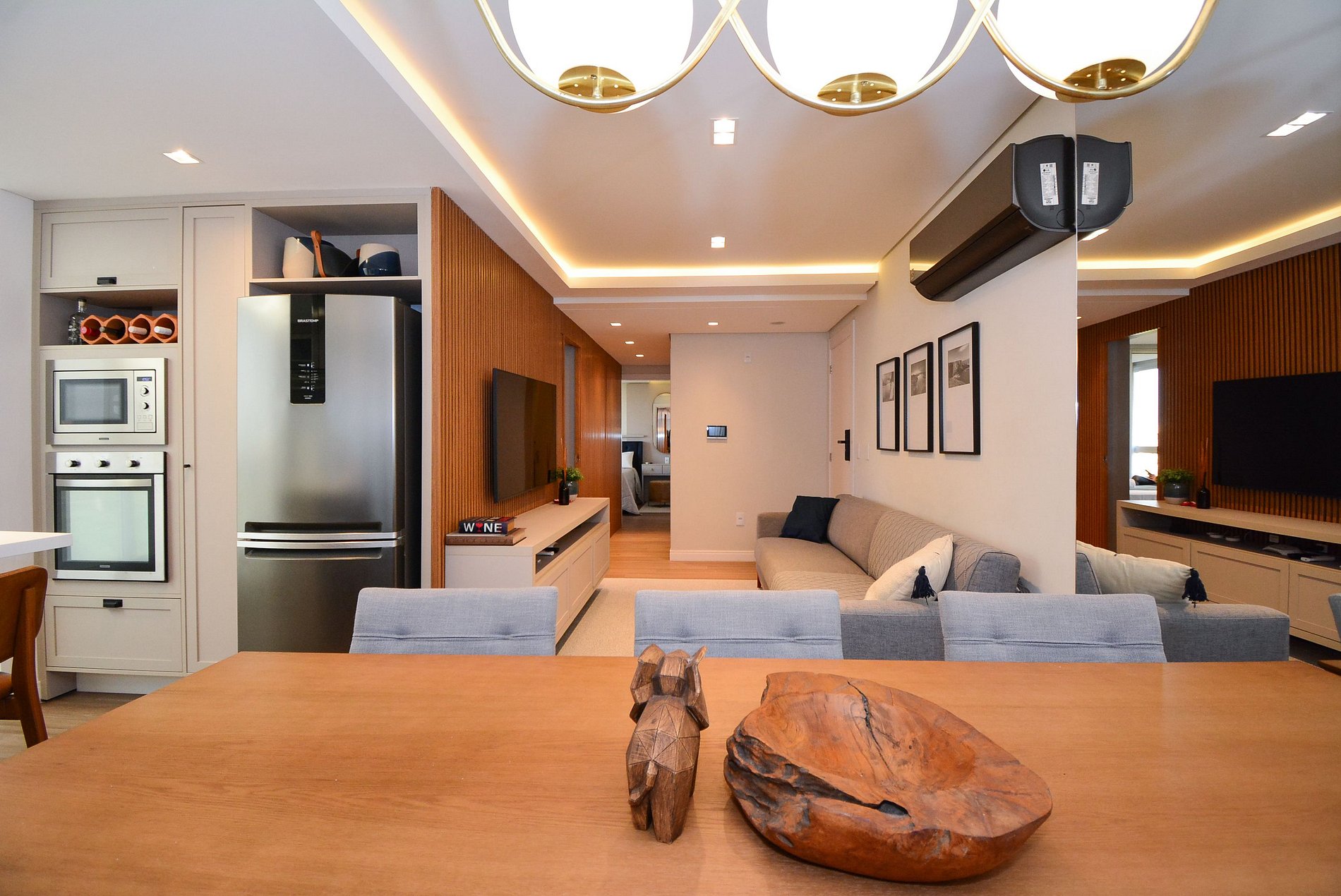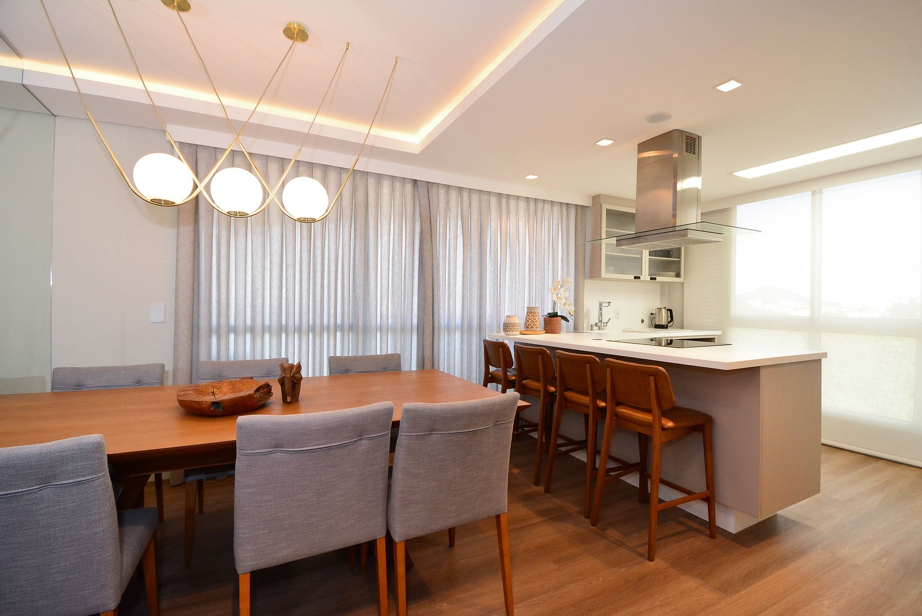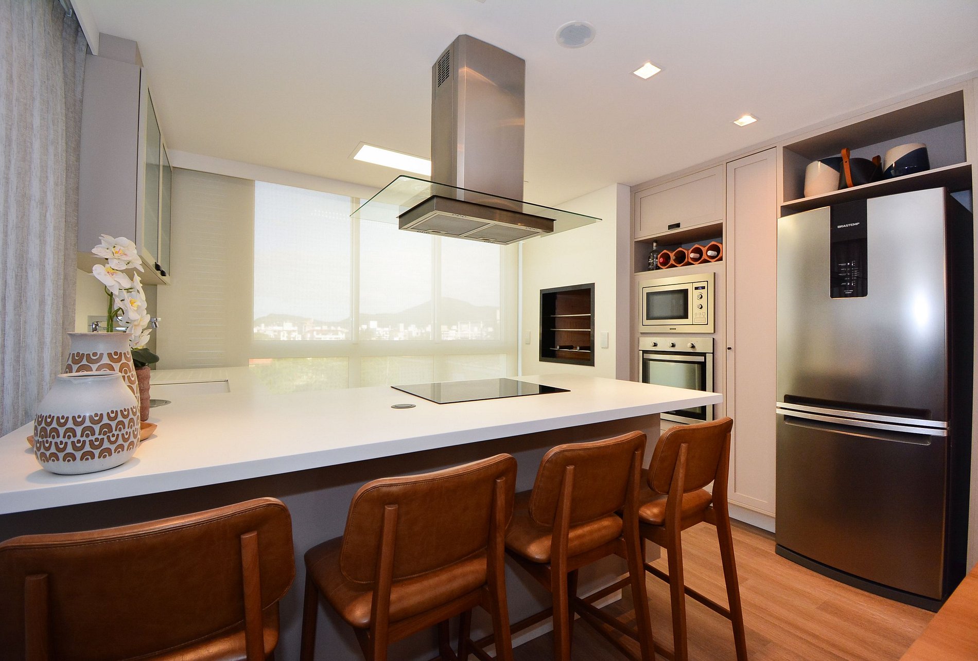A cozinha é super equipada com todos os utensílios necessários para preparar deliciosas refeições e conta ainda com churrasqueira integrada — perfeita para momentos de confraternização. O espaço oferece mesa de jantar, lavabo e lavanderia, garantindo praticidade durante a estadia.
