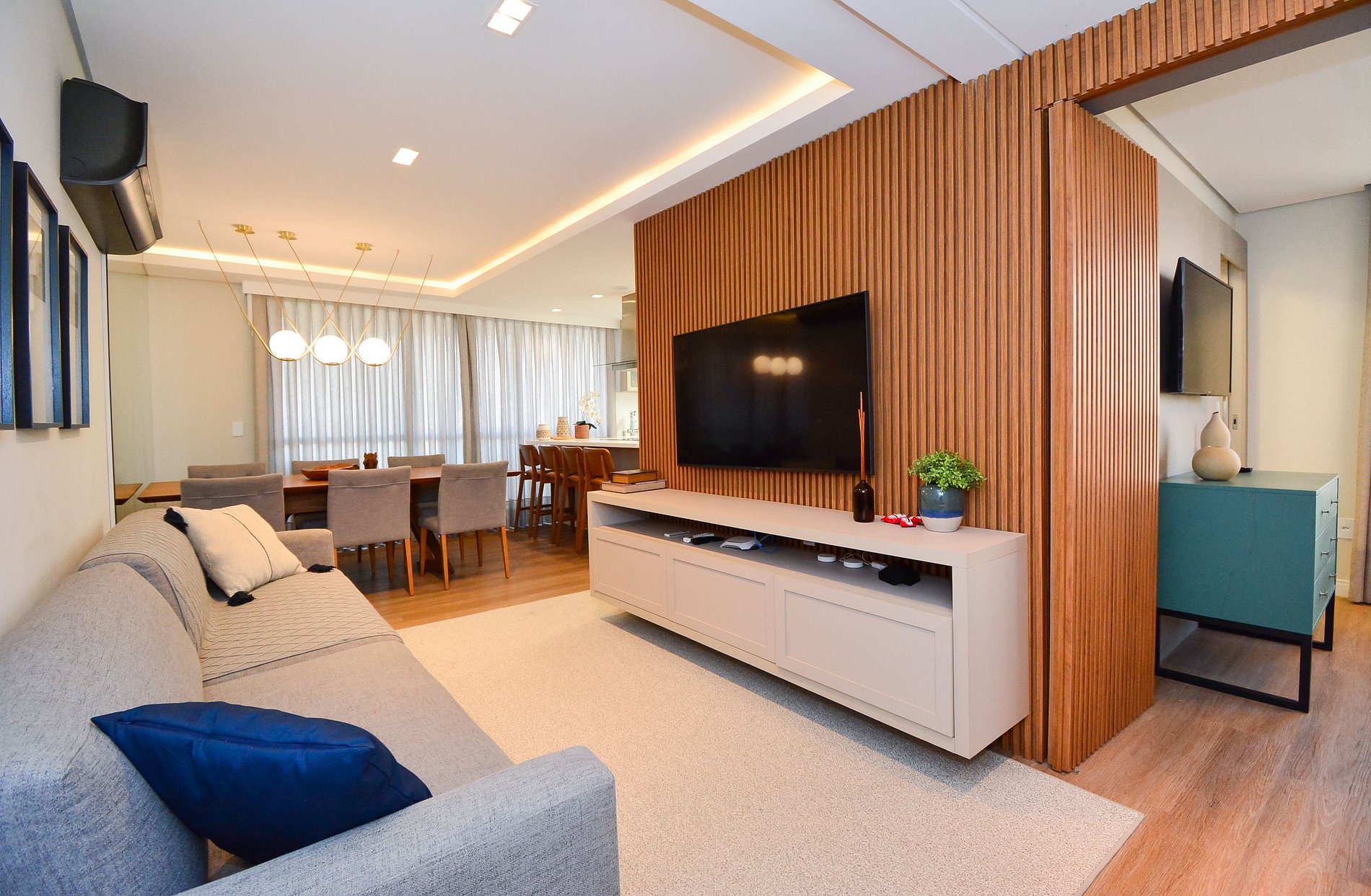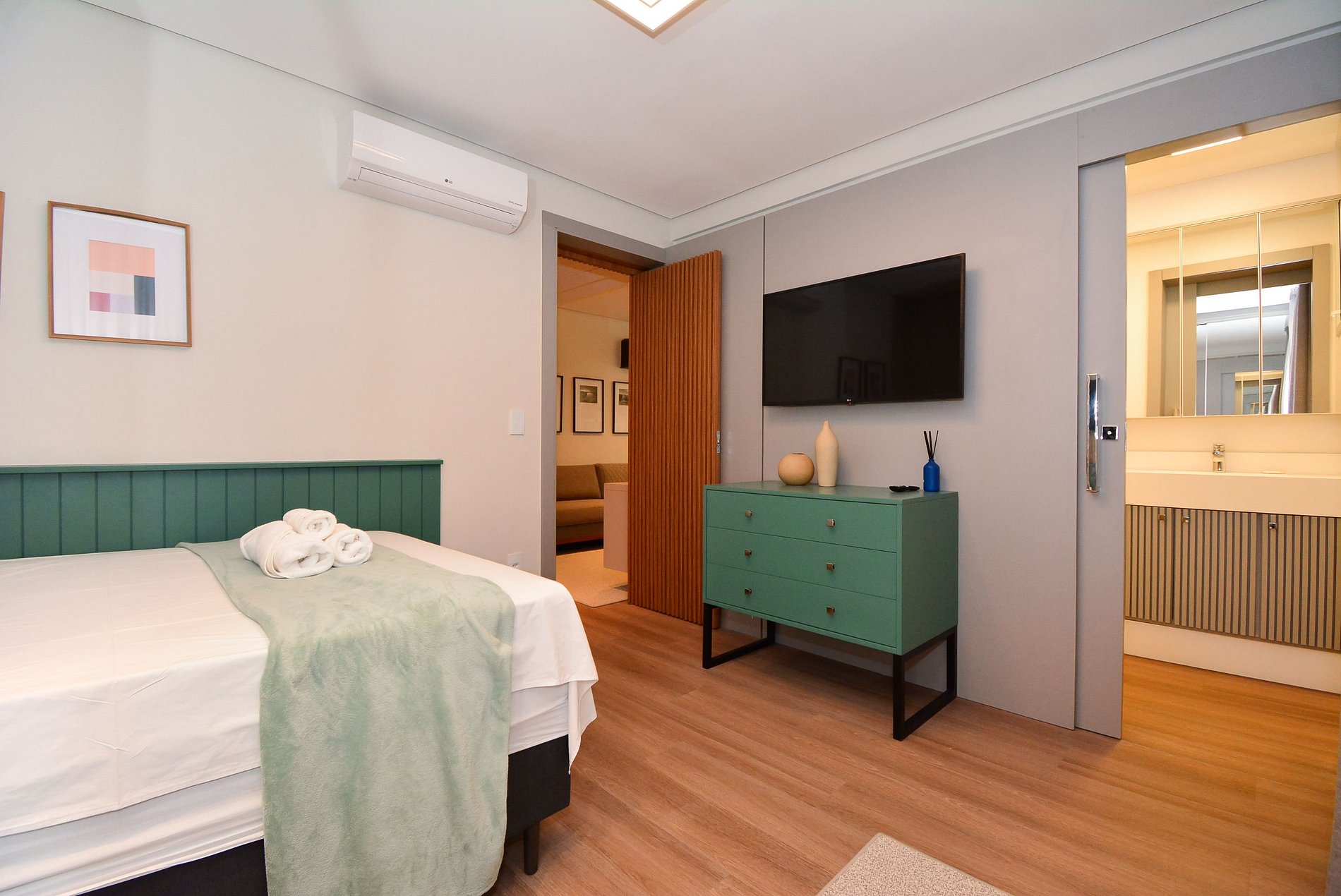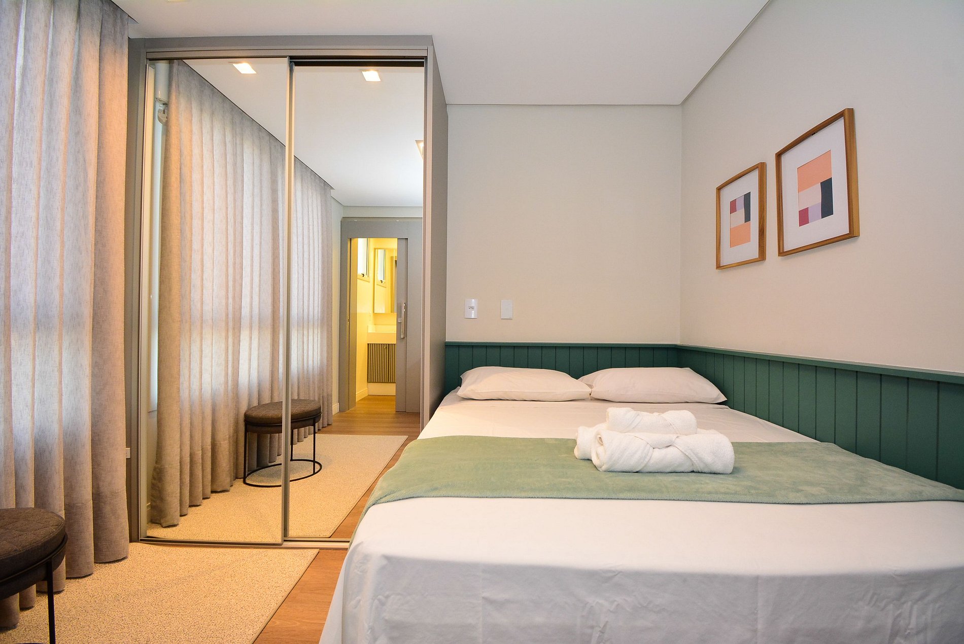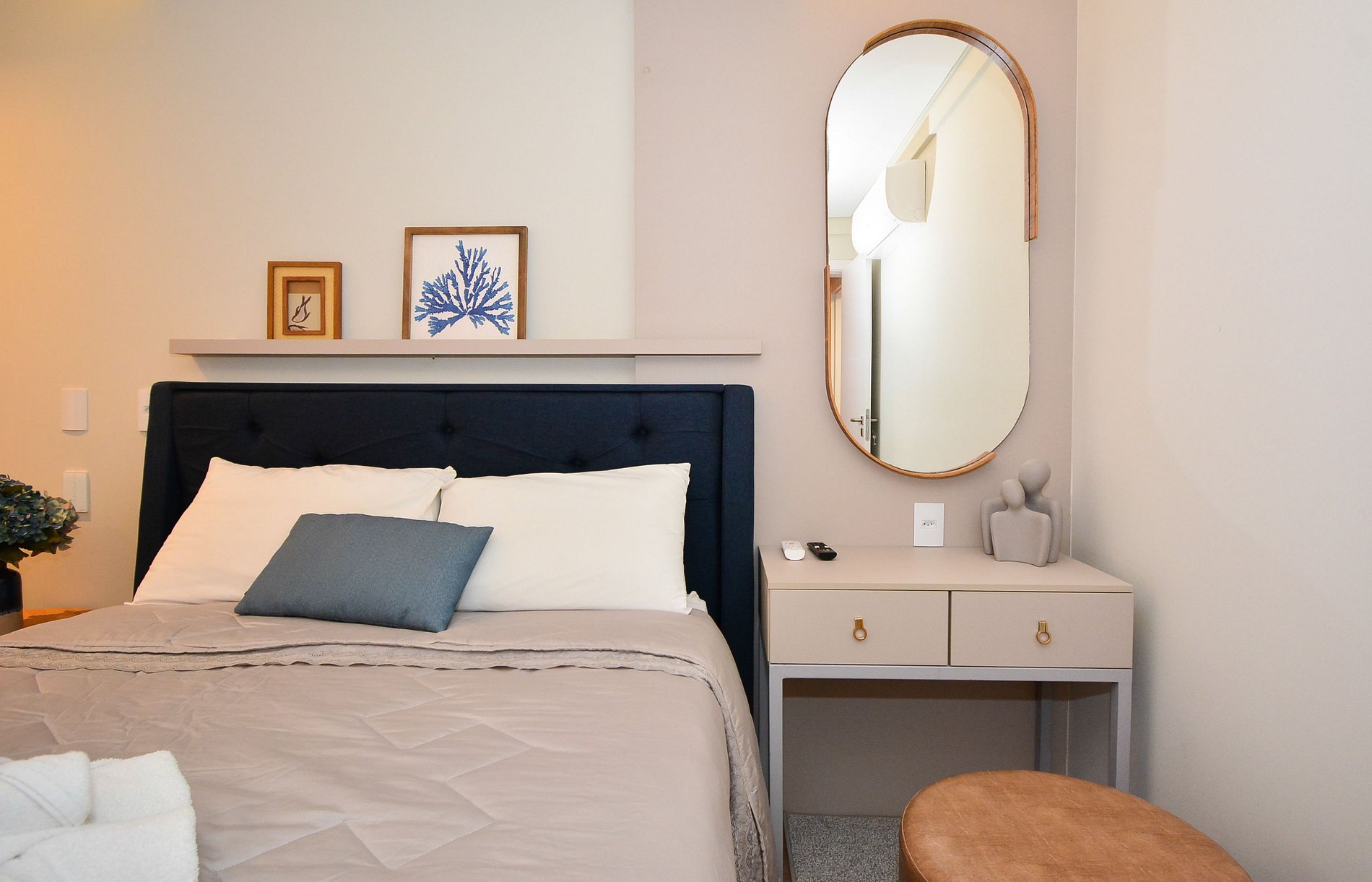 Este elegante apartamento de alto padrão foi cuidadosamente decorado com bom gosto e atenção aos detalhes para oferecer uma experiência única de hospedagem. São duas suítes aconchegantes, ambas com cama de casal, além de um colchão extra de solteiro, acomodando confortavelmente até 5 pessoas.