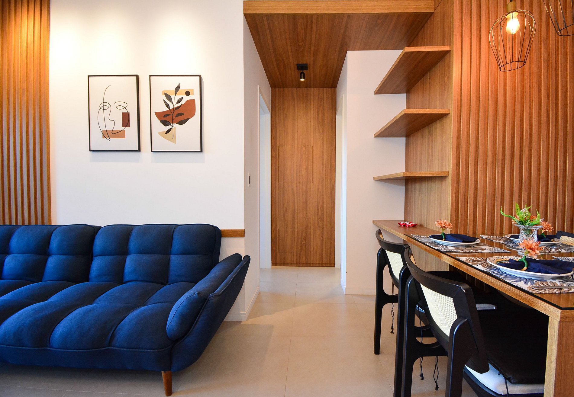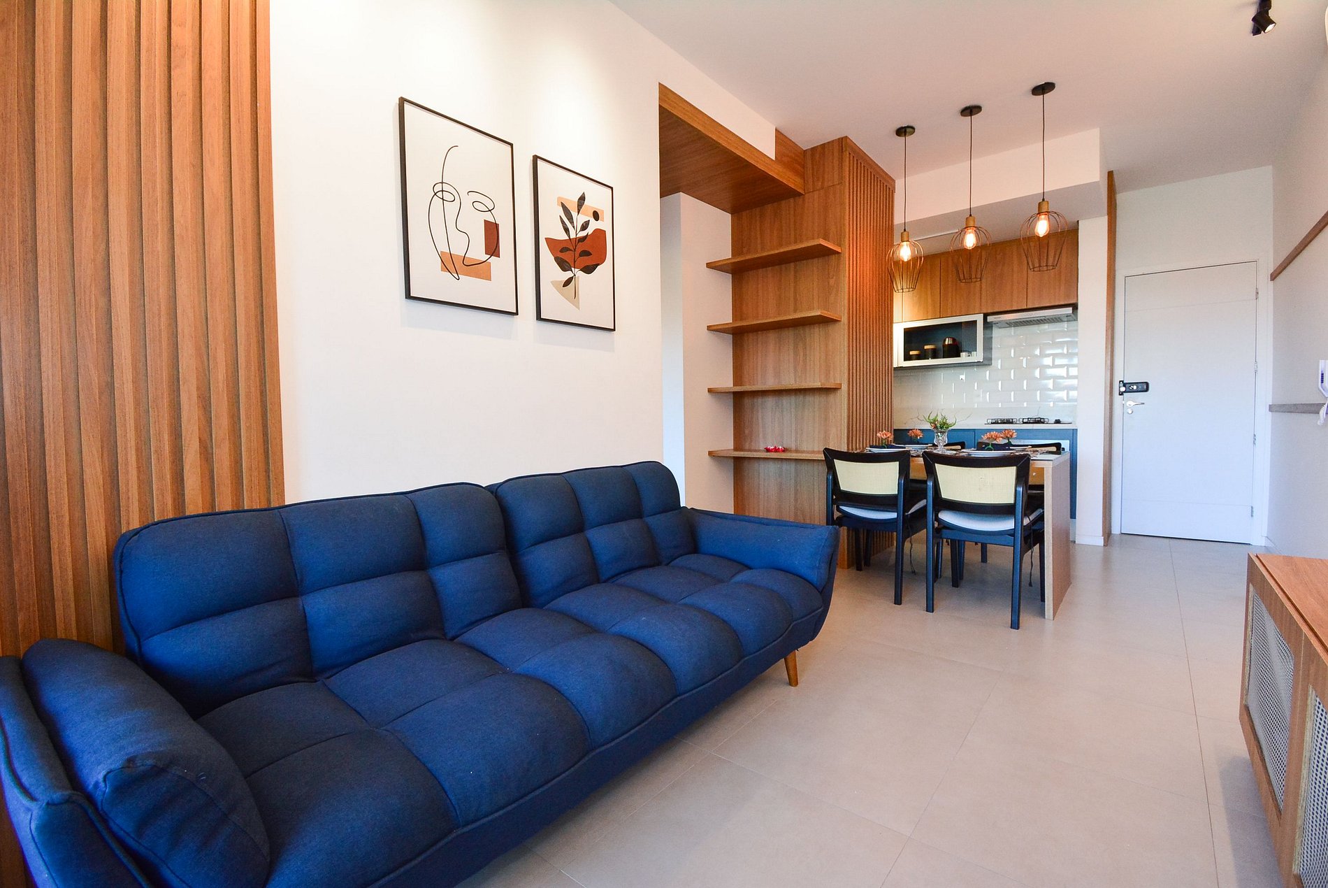 O apartamento acomoda confortavelmente até 3 pessoas, oferecendo um quarto com cama queen e um sofá-cama confortável na sala. A sala de estar é aconchegante e iluminada, perfeita para momentos de relaxamento.