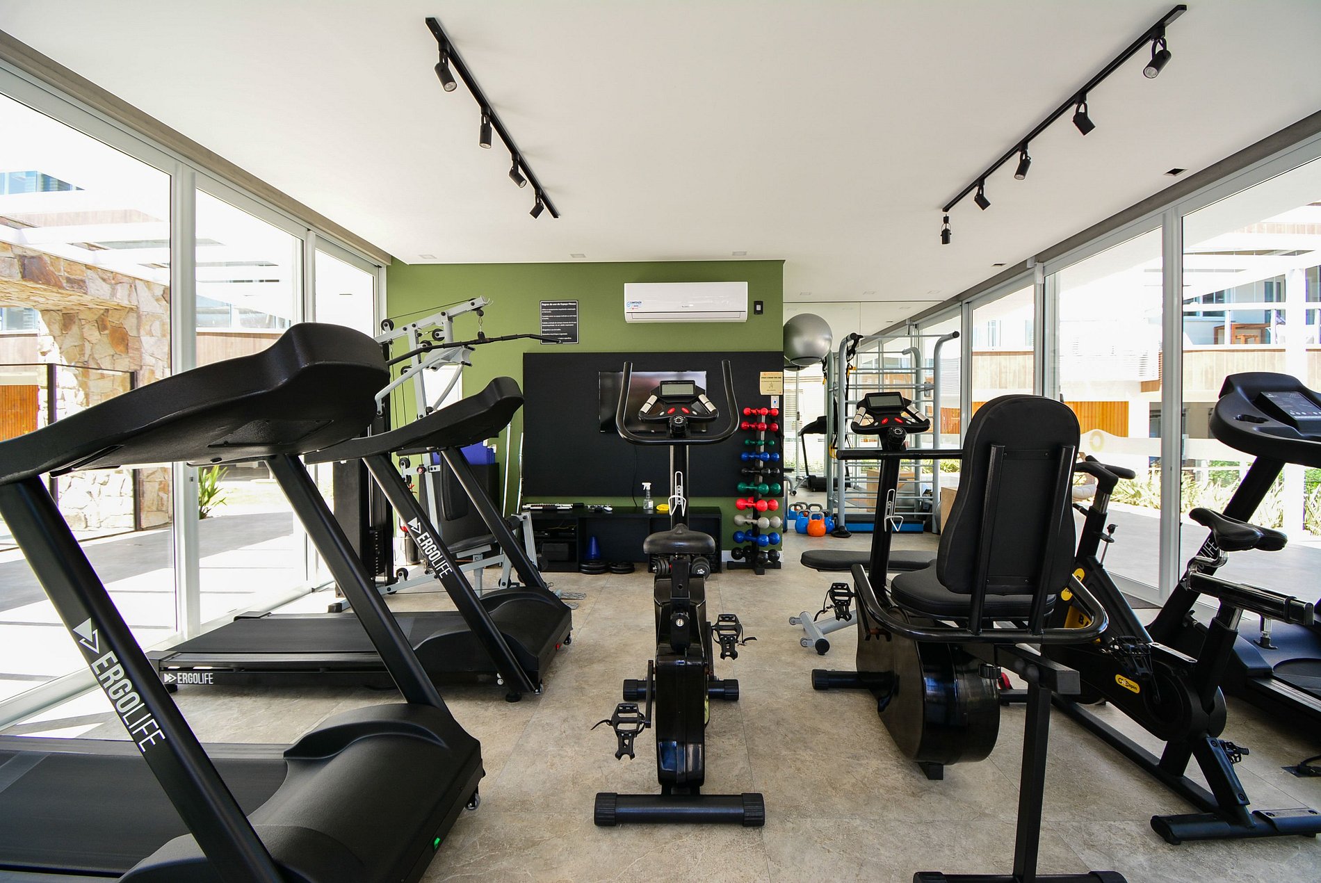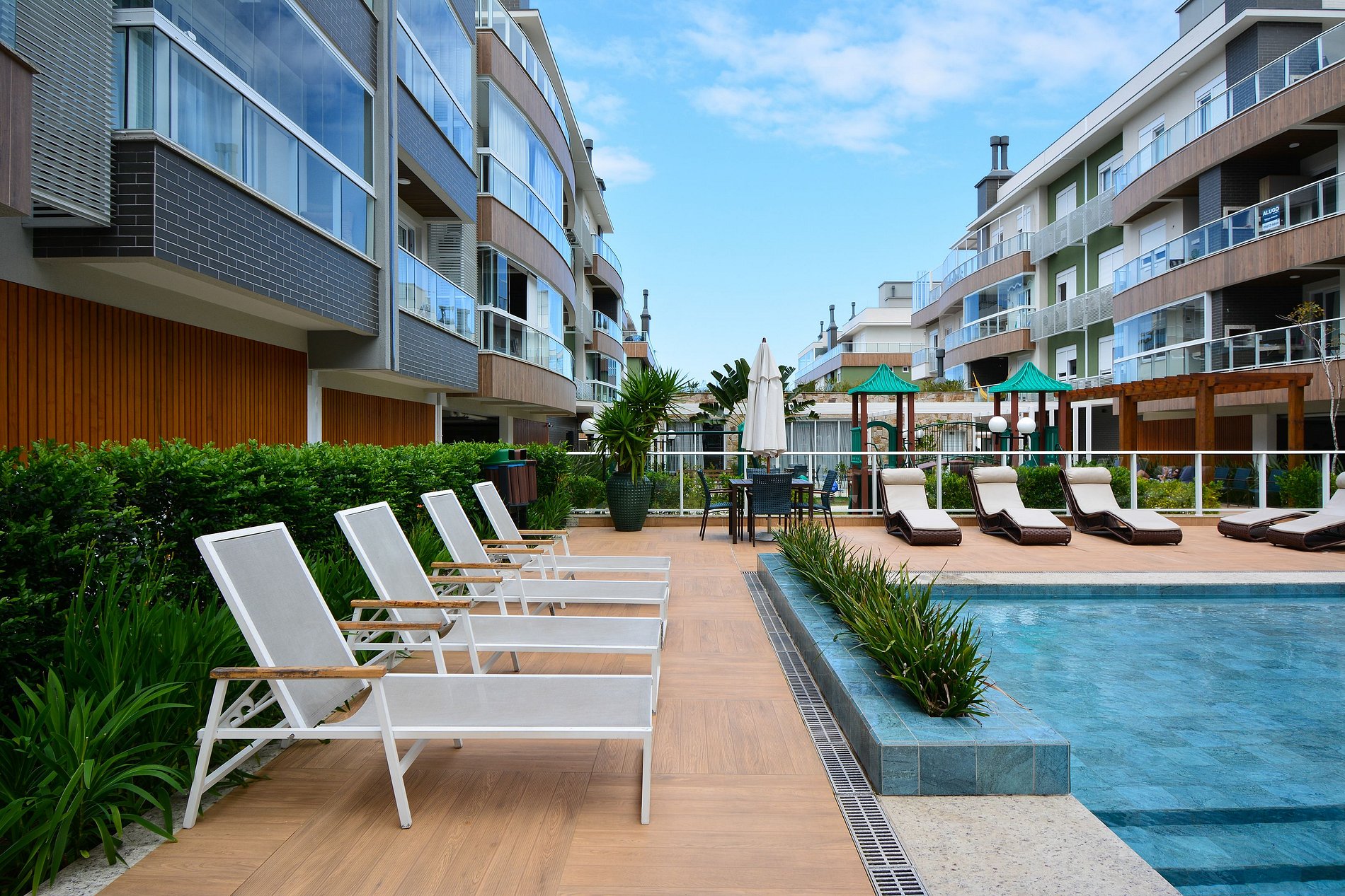 O condomínio Sunclub oferece diversas comodidades, como piscina ao ar livre, piscina aquecida, academia, parque infantil e áreas de descanso com sofás, todas permitidas para uso dos hóspedes.