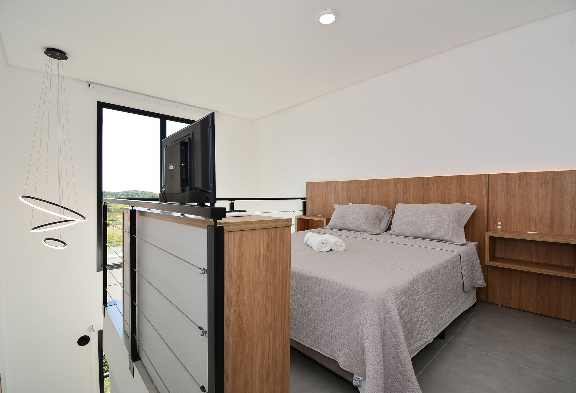 No piso inferior, há um confortável sofá-cama e um banheiro completo. No mezanino, a suíte dispõe de uma cama queen e um segundo banheiro privativo, garantindo comodidade para todos os hóspedes.