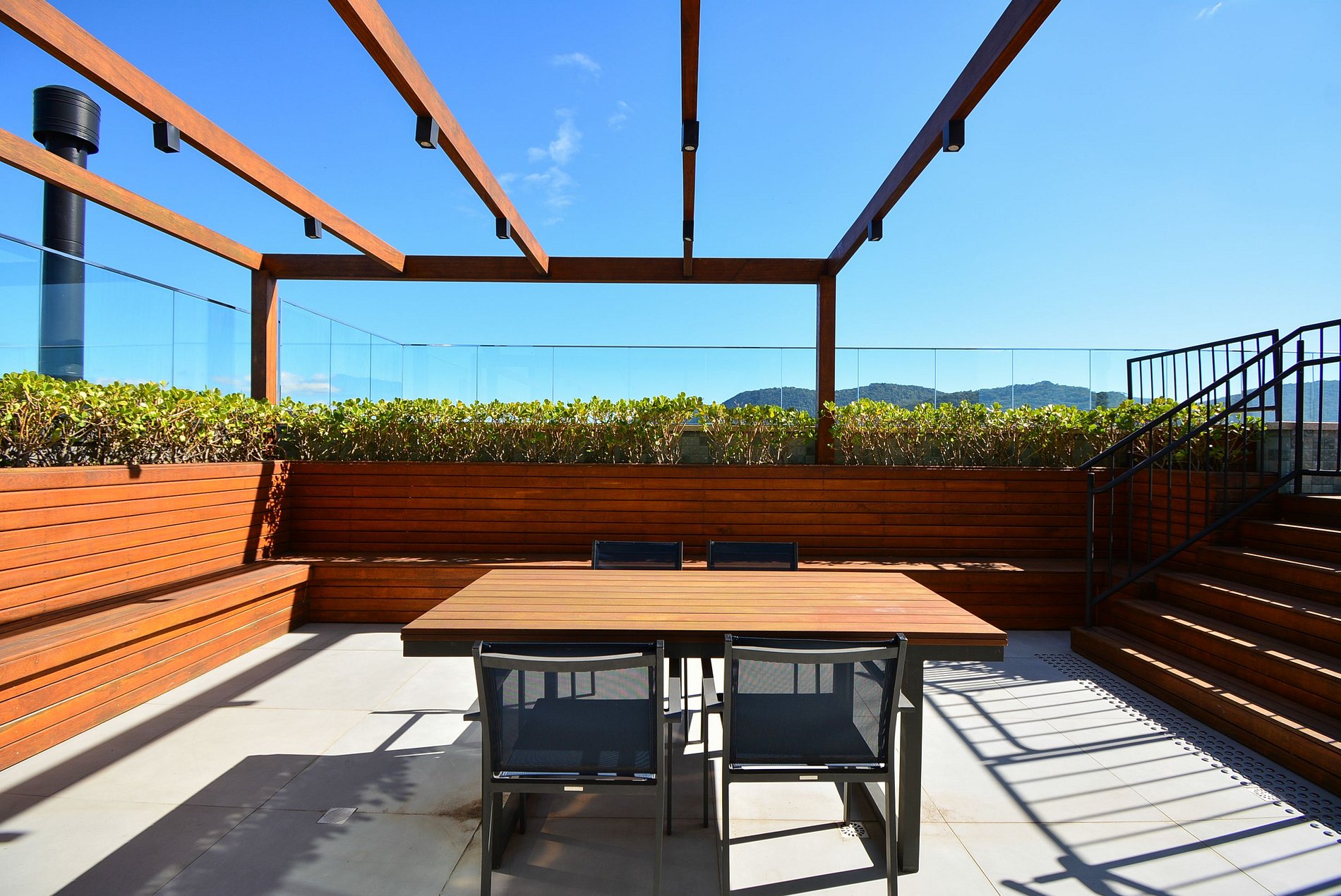 O condomínio, totalmente novo, oferece um espaço exclusivo no terraço com piscina, de onde é possível apreciar uma linda vista para as montanhas e uma vista parcial do mar. Há também uma mesa e um pequeno quiosque no local (mediante reserva prévia para uso).