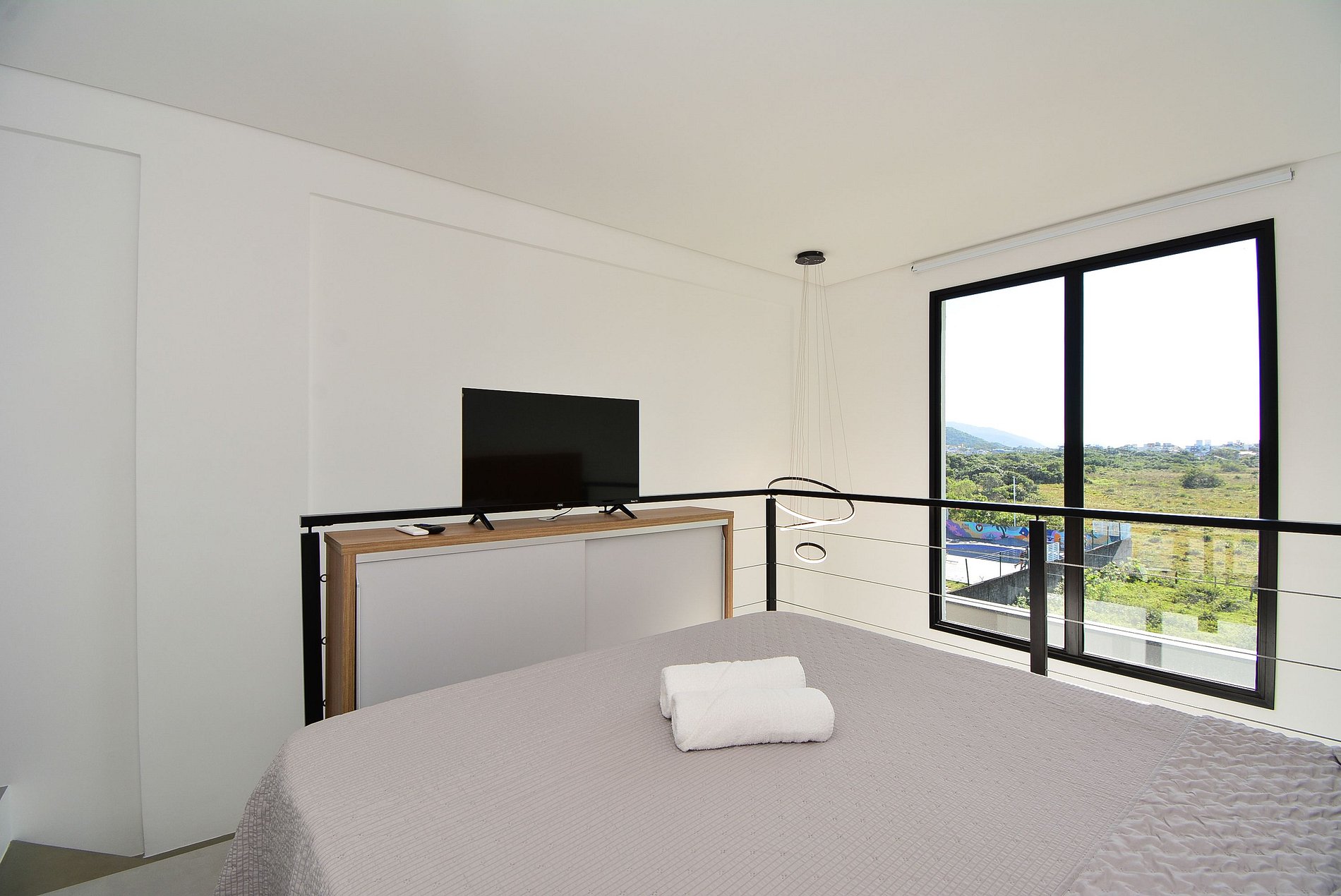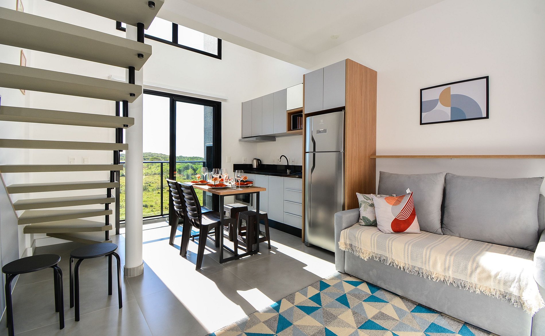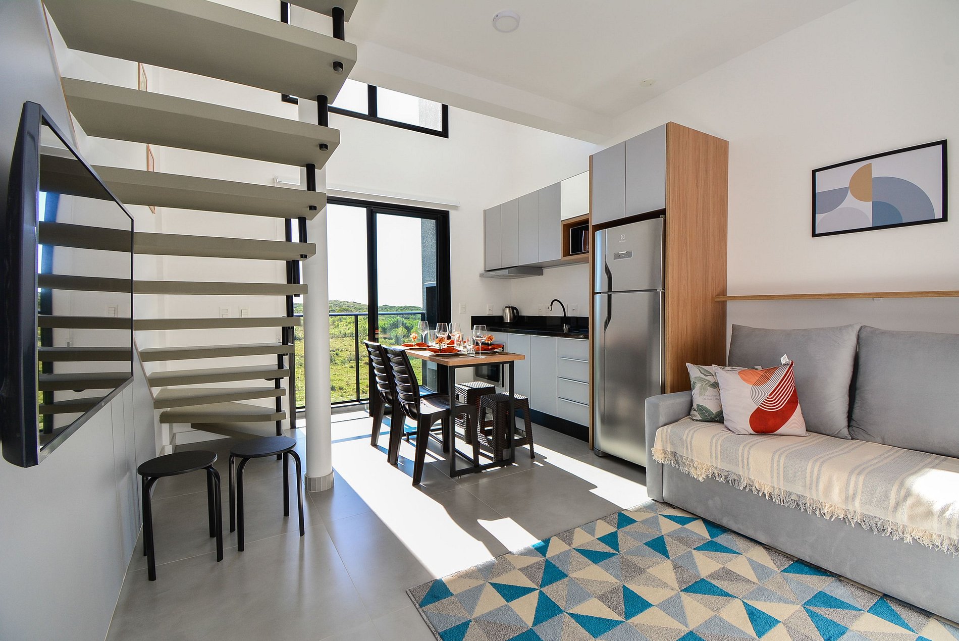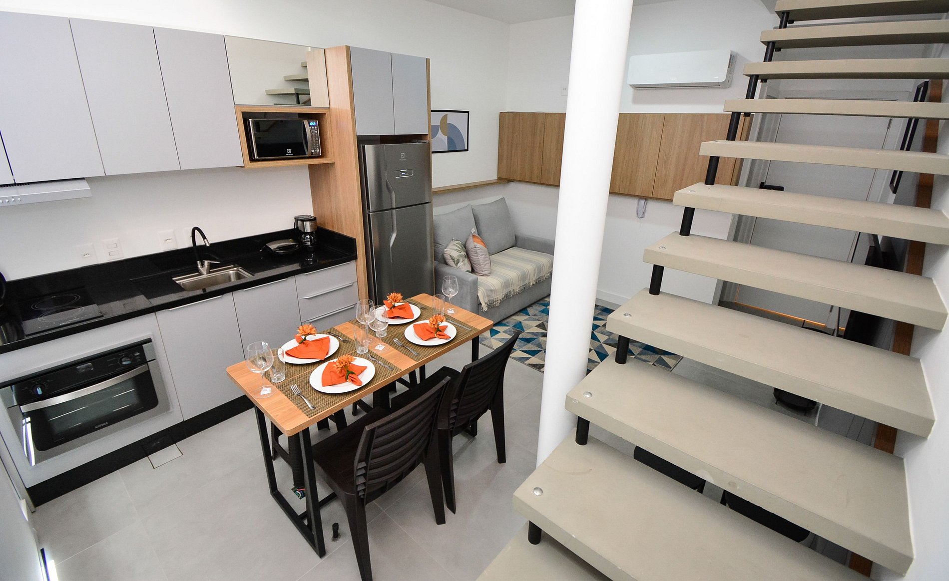 No piso inferior, há um confortável sofá-cama e um banheiro completo. No mezanino, a suíte dispõe de uma cama queen e um segundo banheiro privativo, garantindo comodidade para todos os hóspedes.