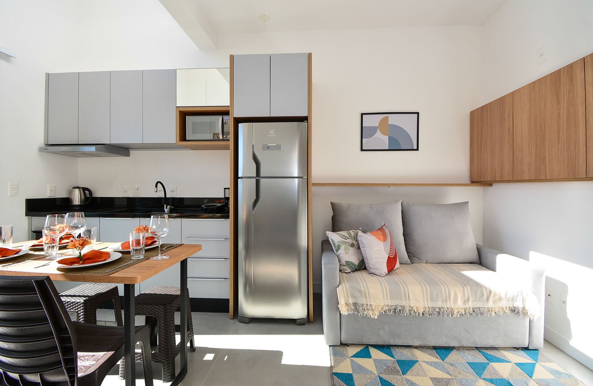 A cozinha é equipada com todos os utensílios necessários para preparar suas refeições, além de uma mesa para 4 pessoas, ideal para momentos de convivência. A sacada com churrasqueira convida a relaxar apreciando a vista para o verde, trazendo ainda mais charme à estadia.