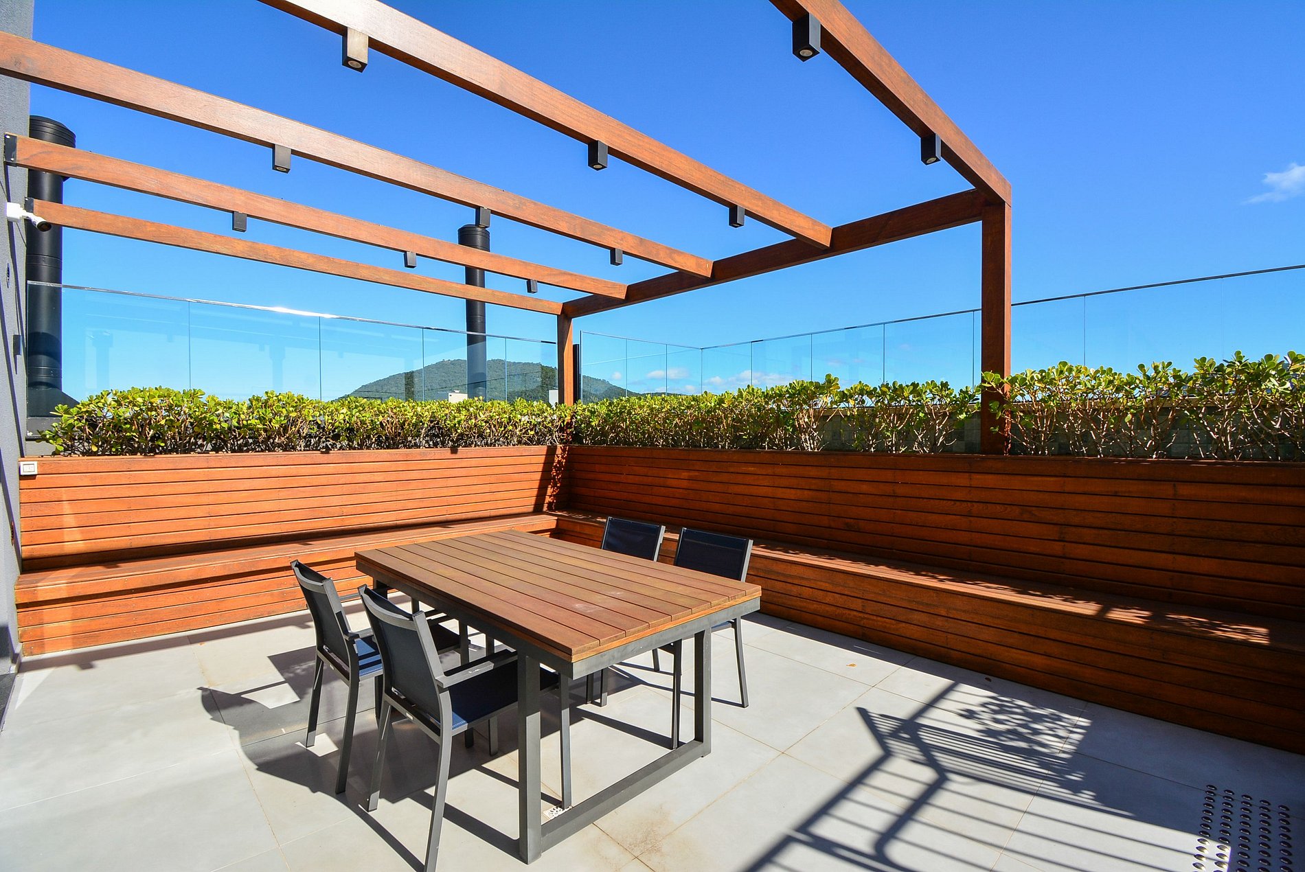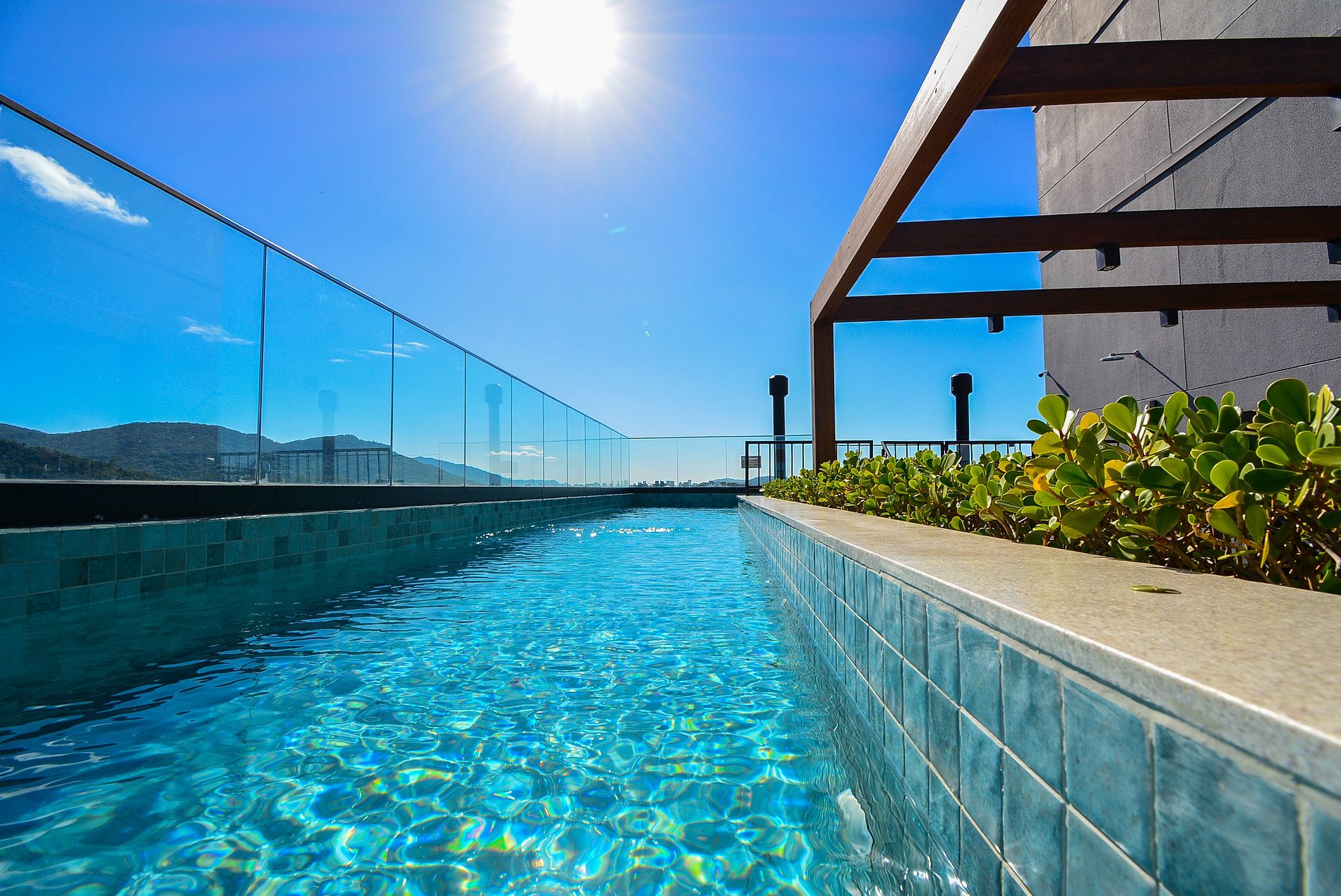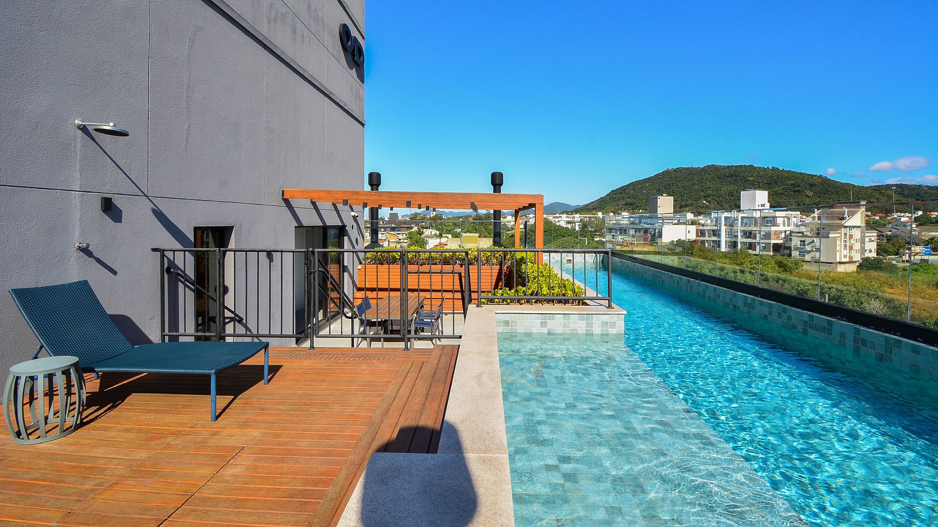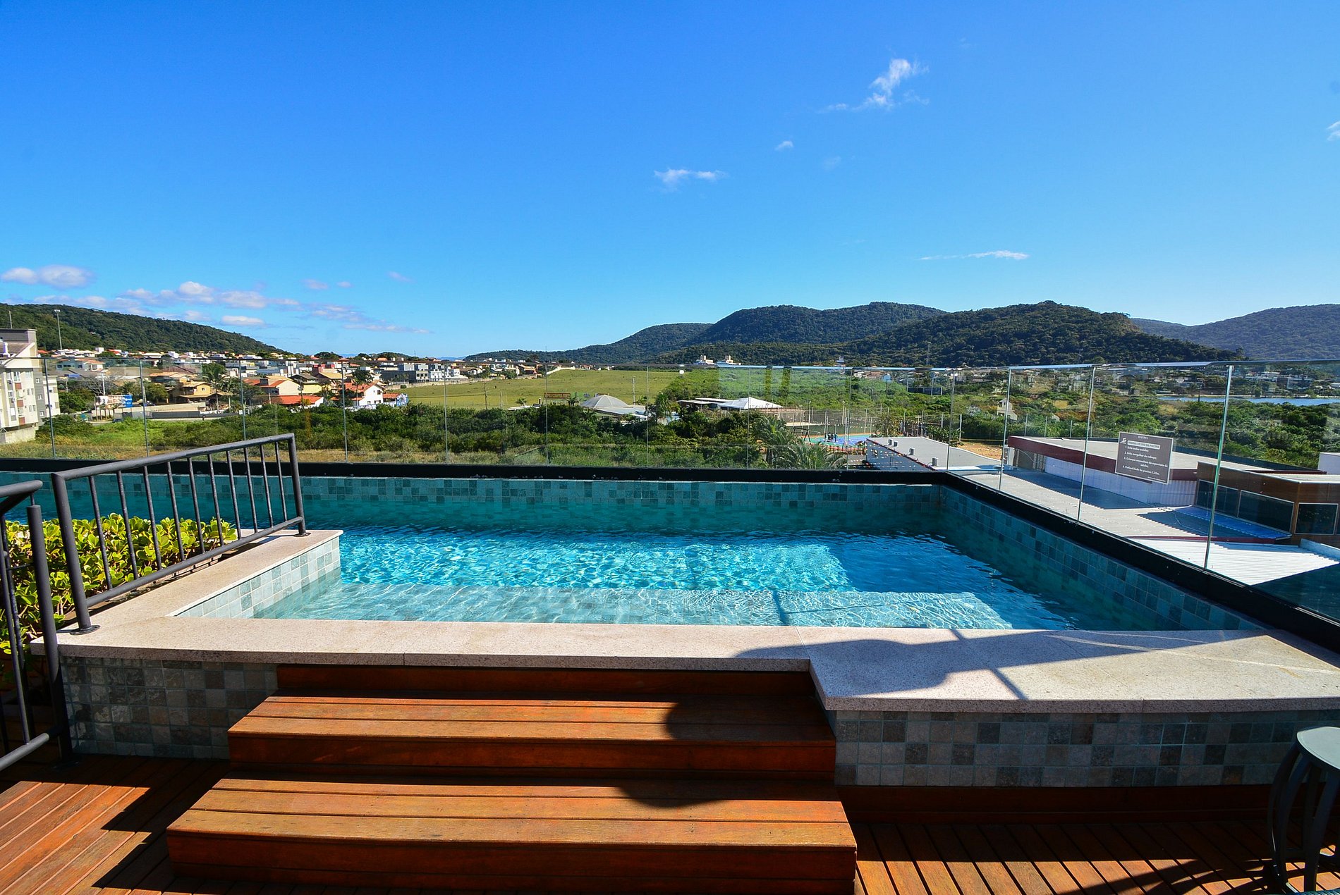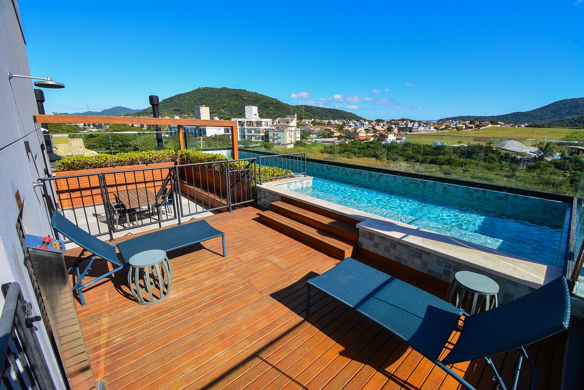 O condomínio, totalmente novo, oferece um espaço exclusivo no terraço com piscina, de onde é possível apreciar uma linda vista para as montanhas e uma vista parcial do mar. Há também uma mesa e um pequeno quiosque no local (mediante reserva prévia para uso).