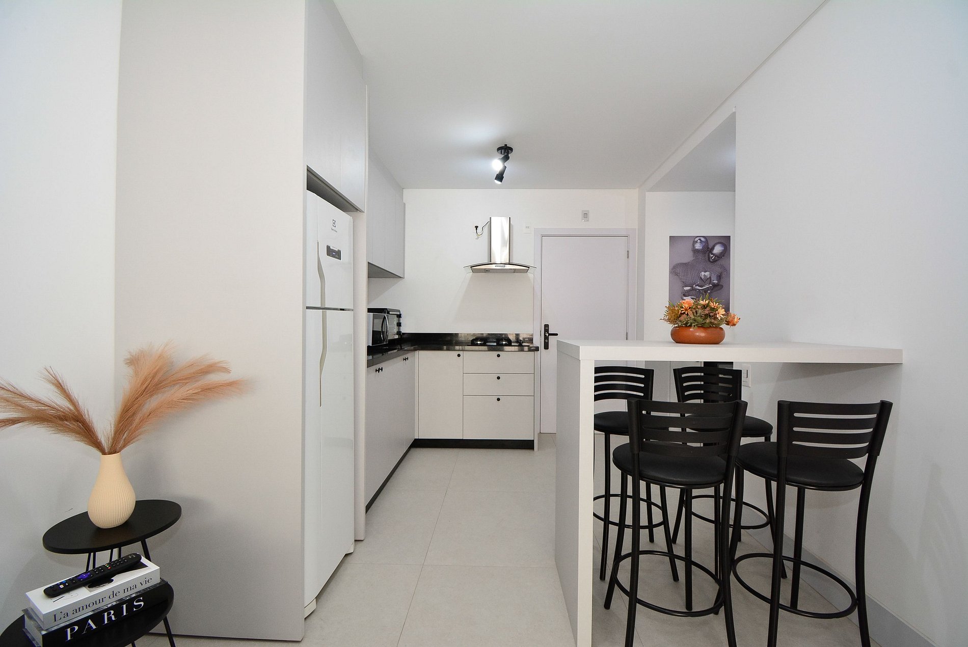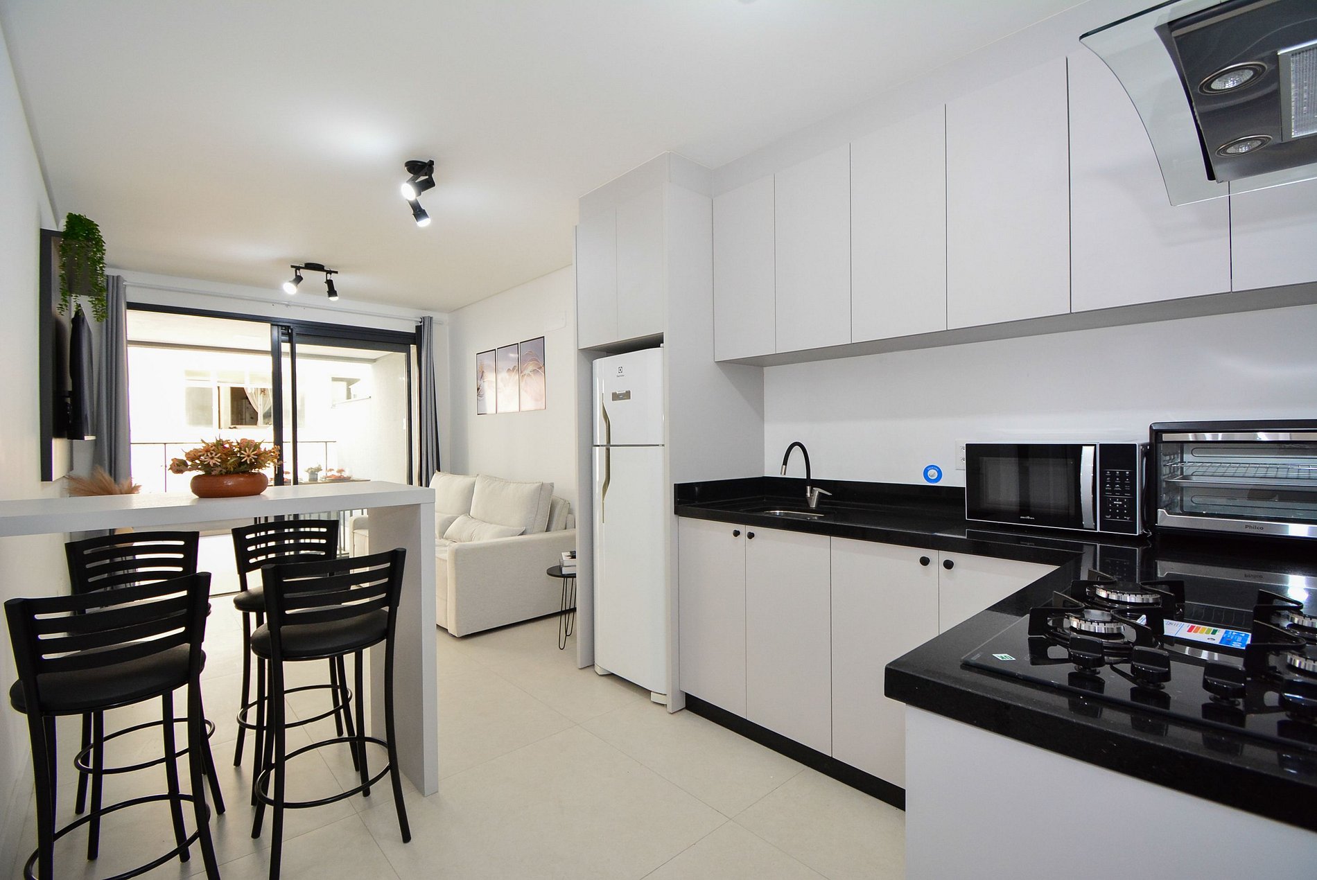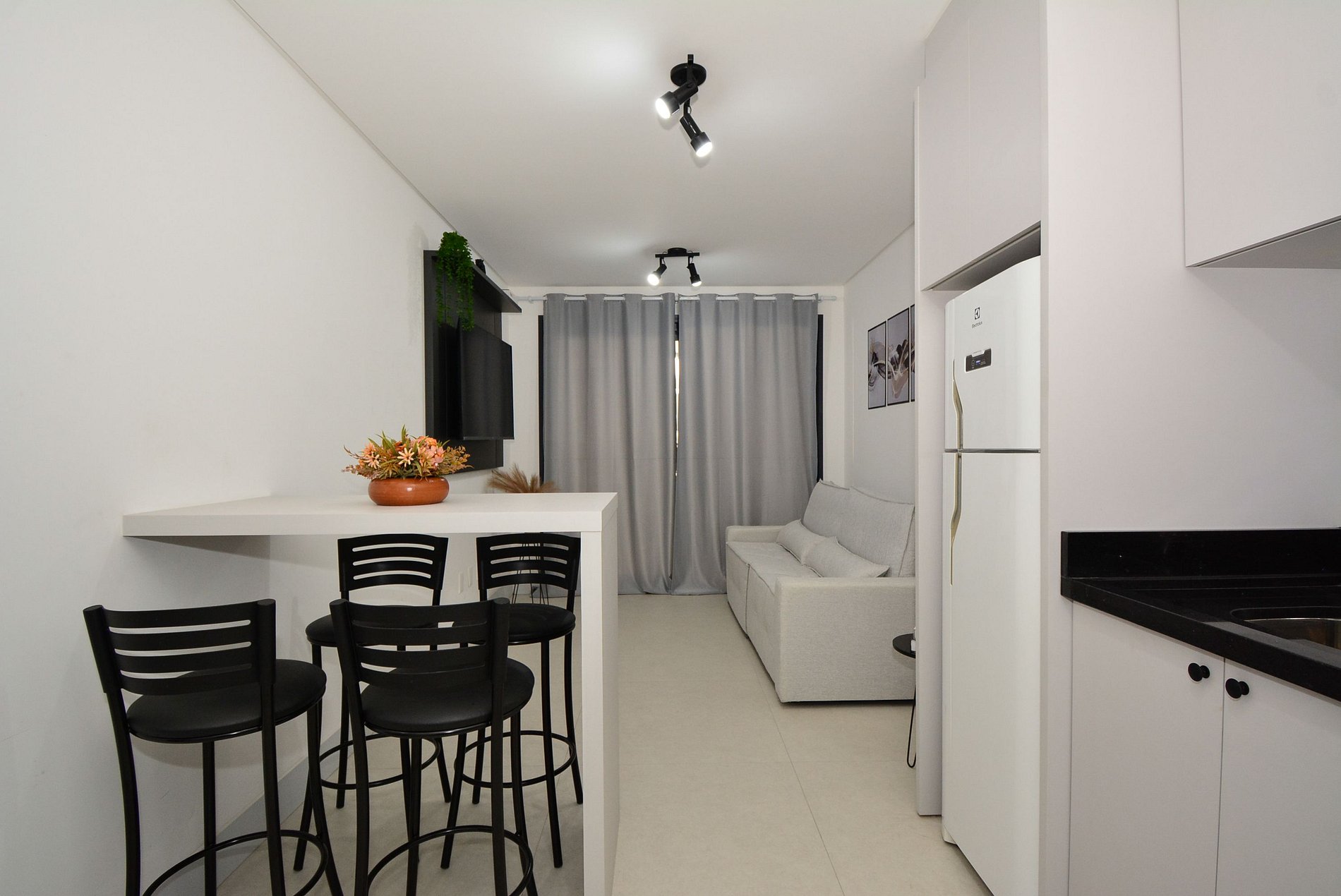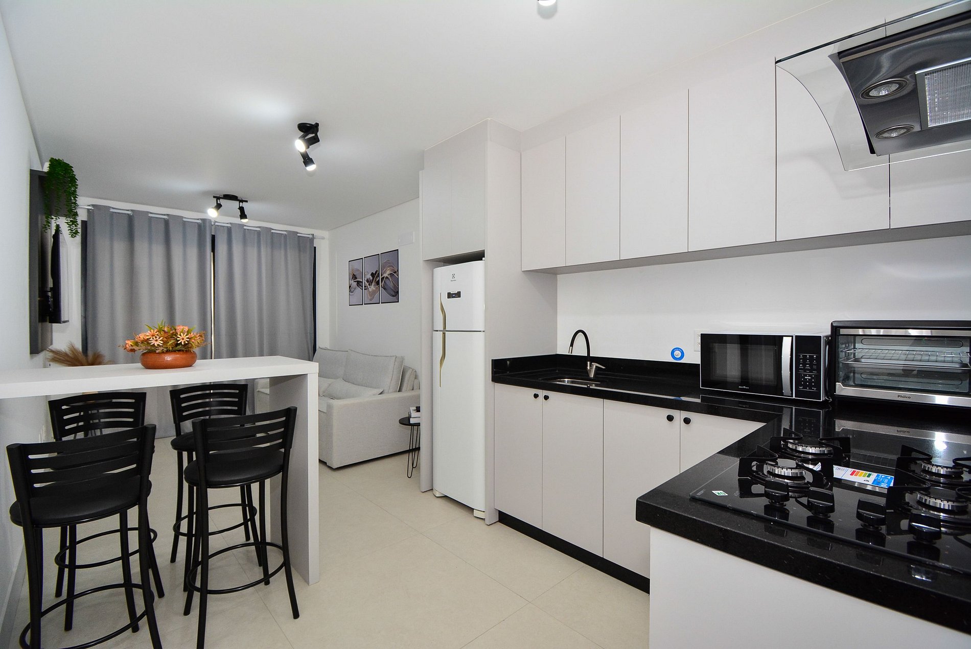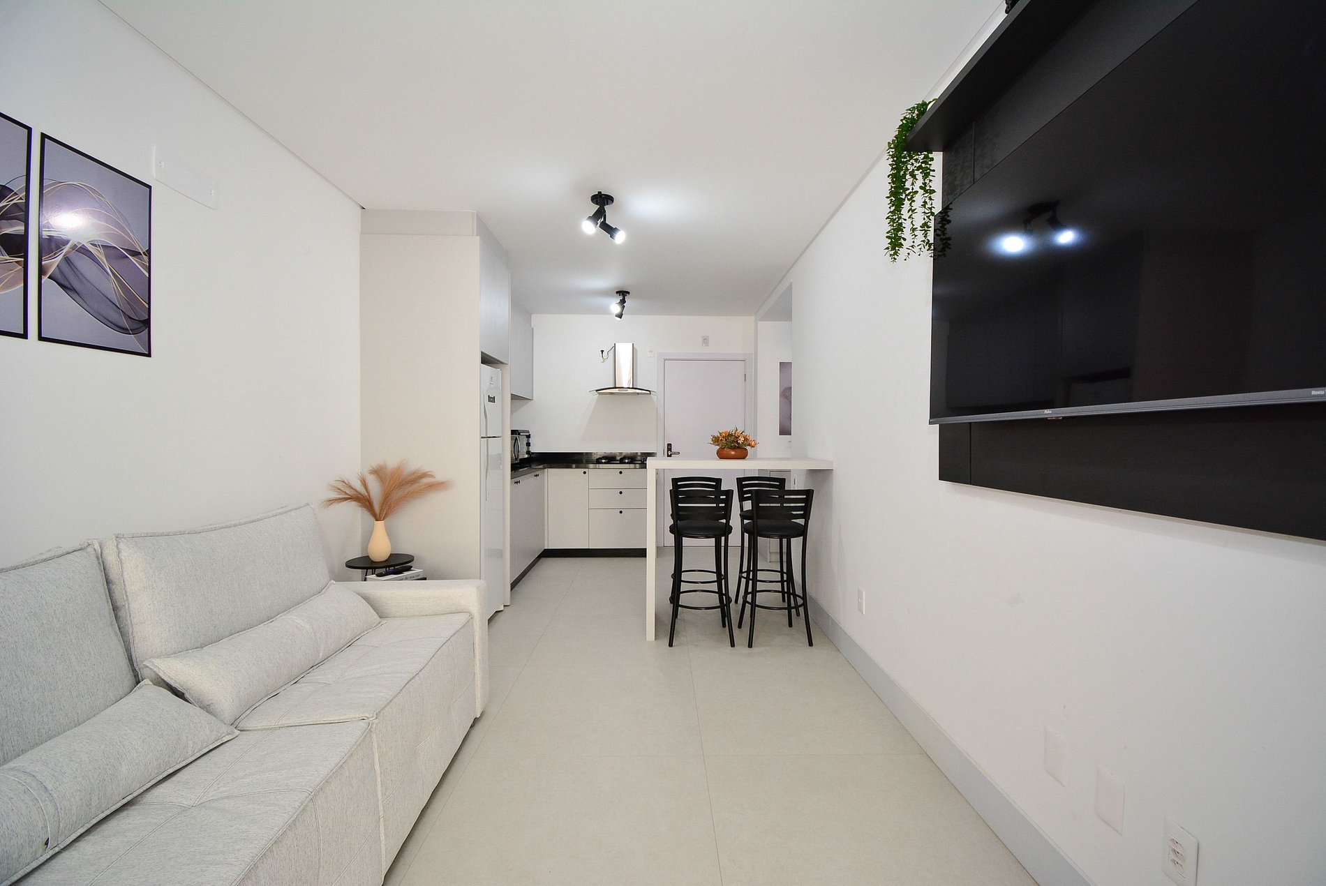 A decoração é moderna e funcional, com uma ampla sacada equipada com mesa, ideal para momentos de confraternização. O espaço é bem distribuído, integrando sala, cozinha e varanda de forma fluida, proporcionando uma experiência acolhedora tanto para lazer quanto para trabalho remoto.