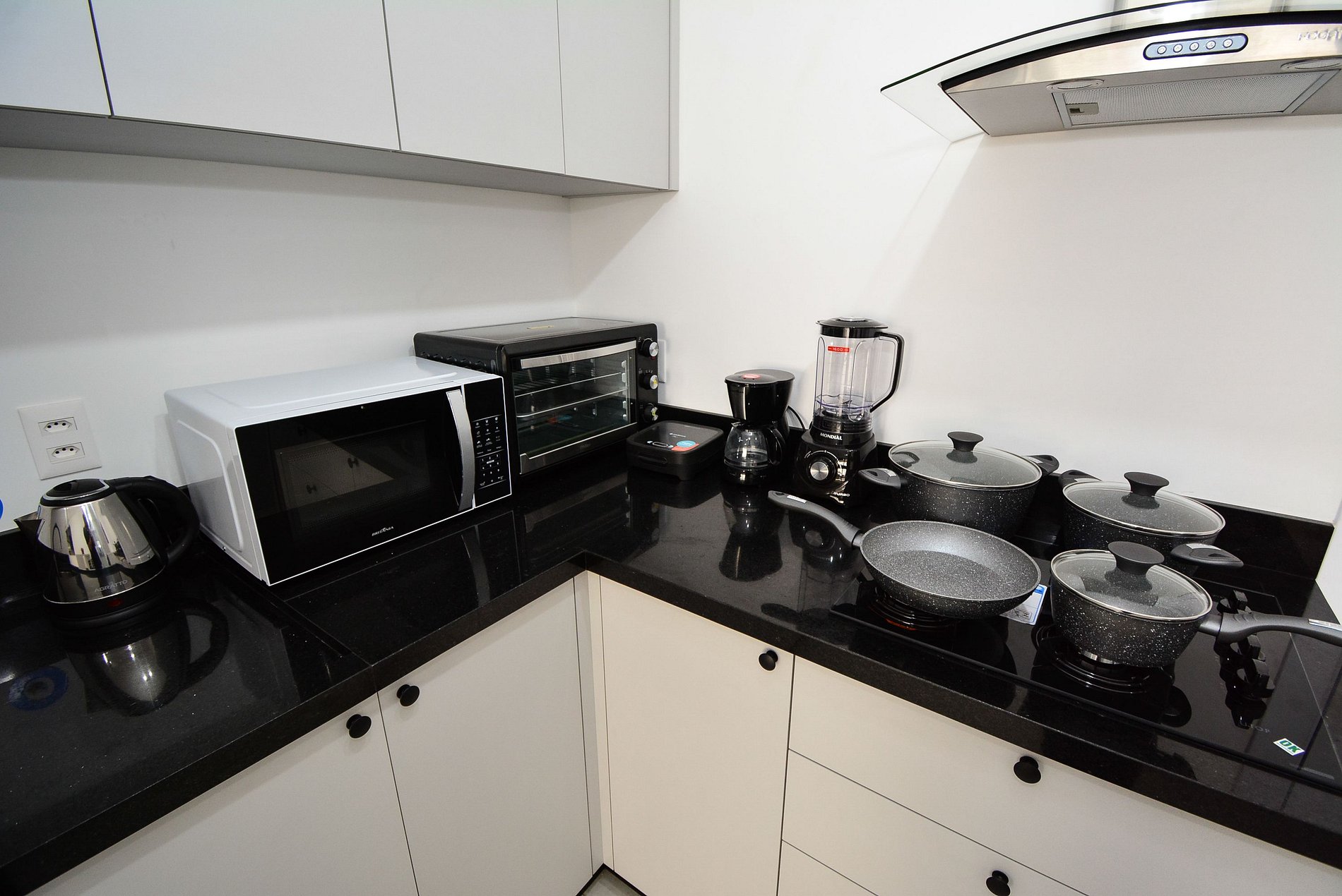 • Cozinha completa com geladeira, fogão, micro-ondas, forno elétrico, cafeteira, chaleira elétrica, sanduicheira, liquidificador, panelas, pratos, copos, taças, talheres e utensílios diversos