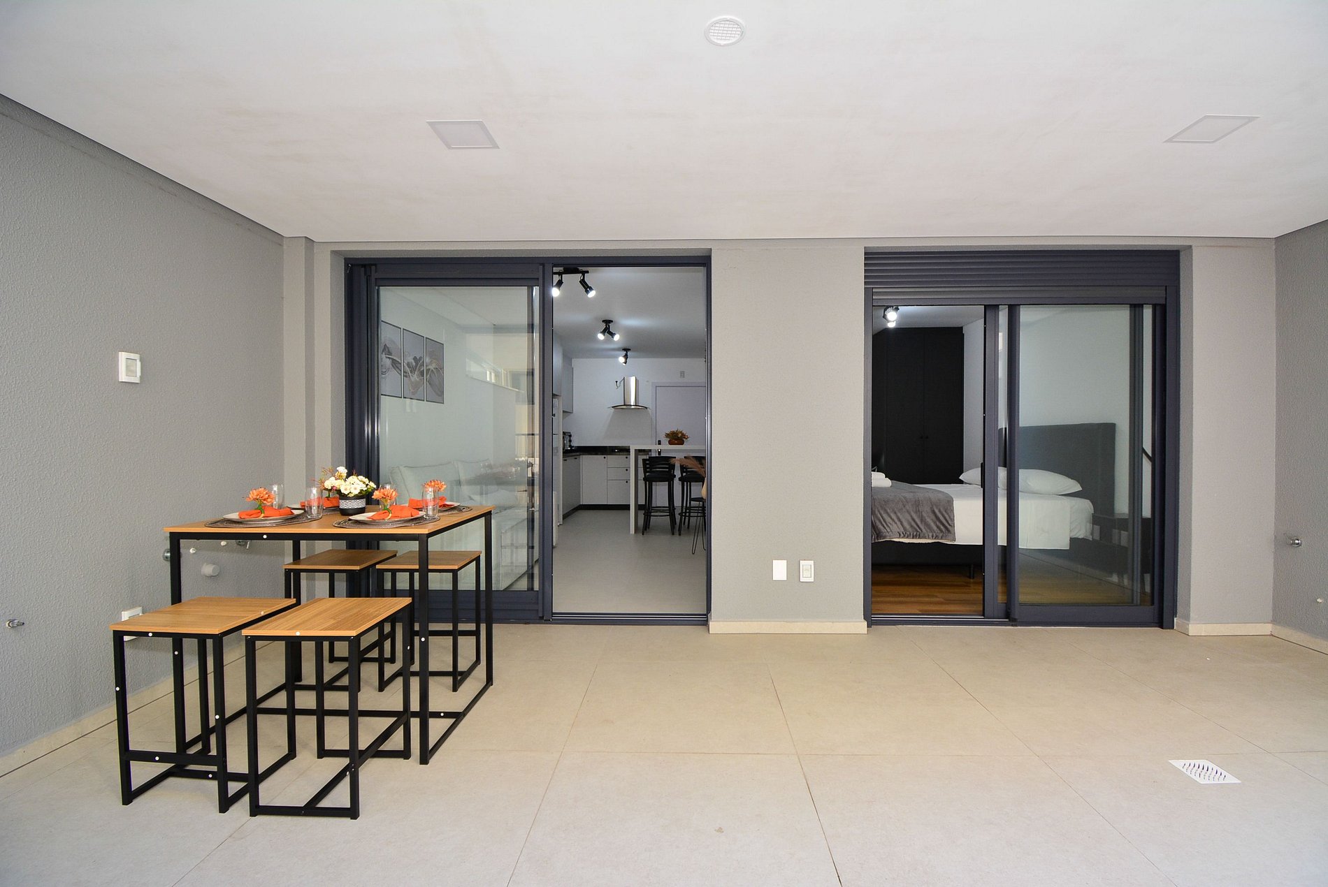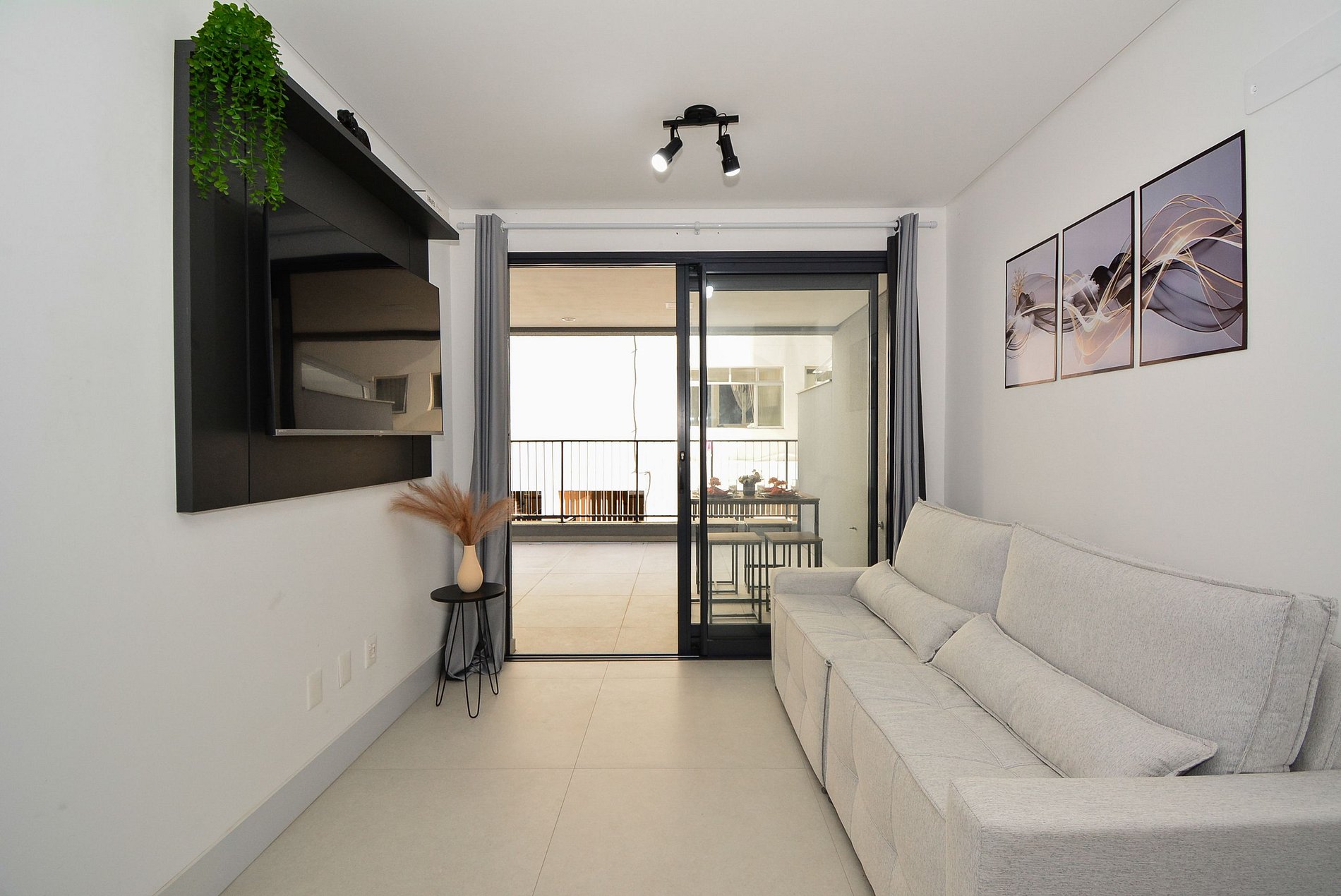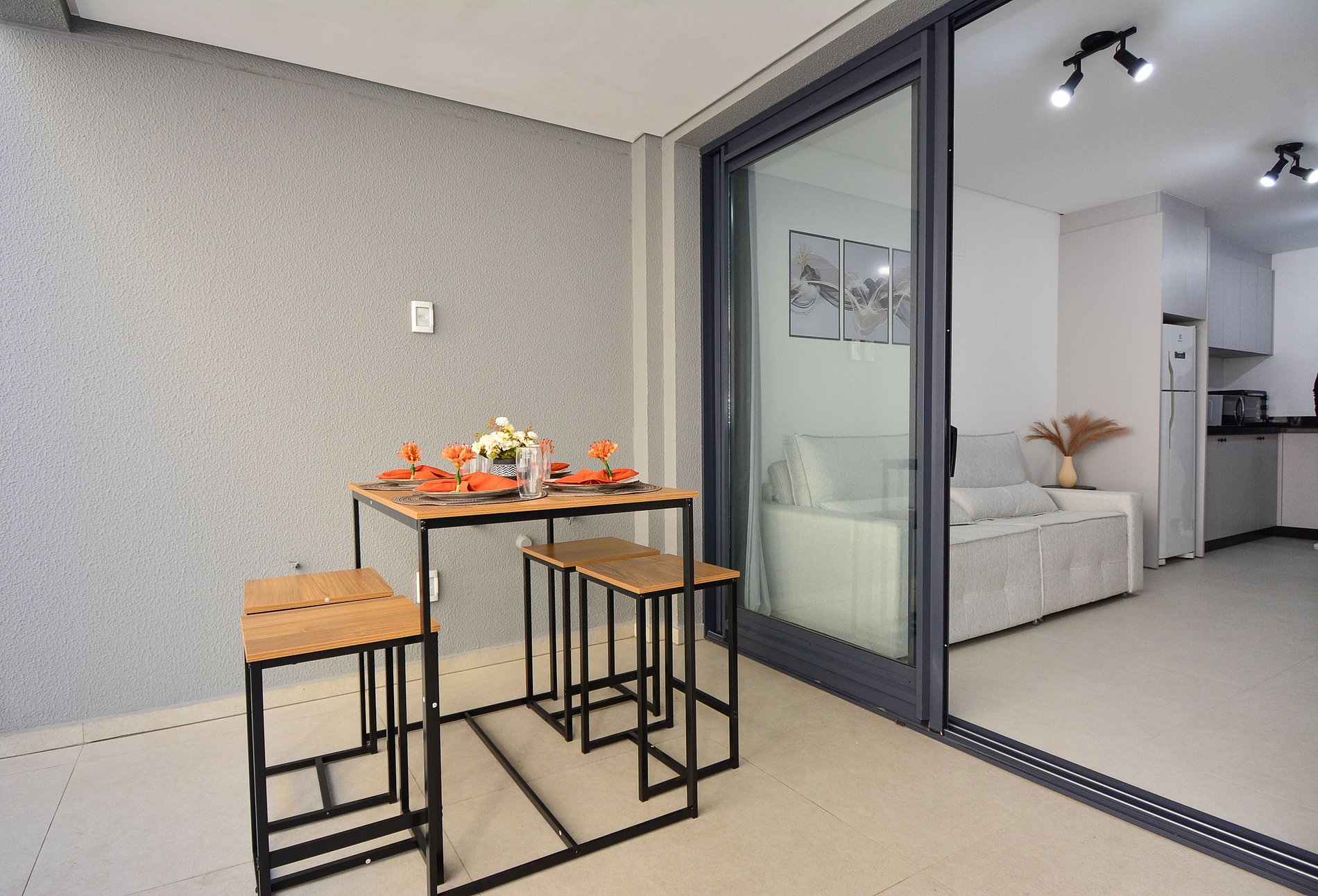 A decoração é moderna e funcional, com uma ampla sacada equipada com mesa, ideal para momentos de confraternização. O espaço é bem distribuído, integrando sala, cozinha e varanda de forma fluida, proporcionando uma experiência acolhedora tanto para lazer quanto para trabalho remoto.