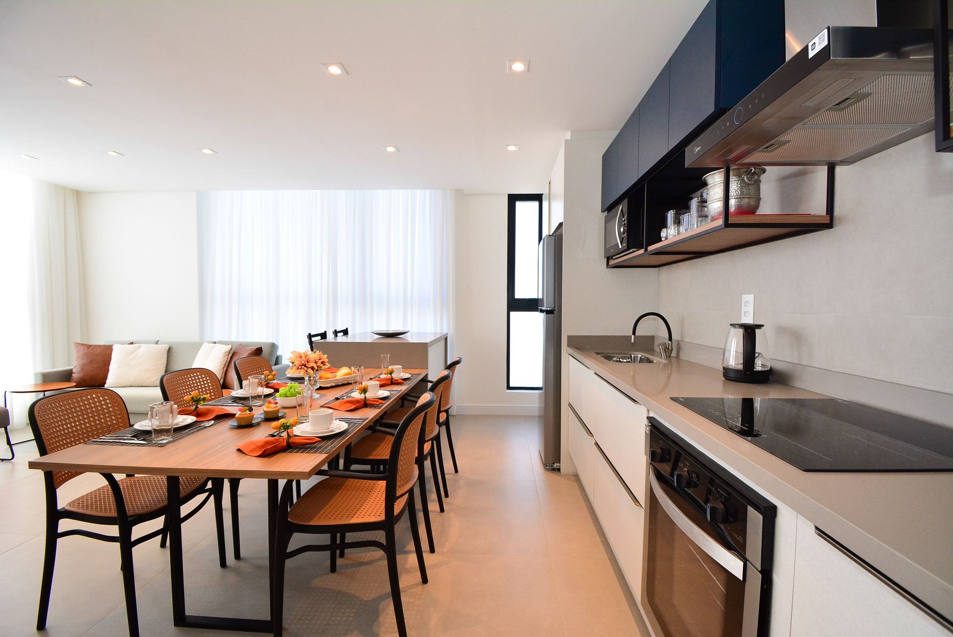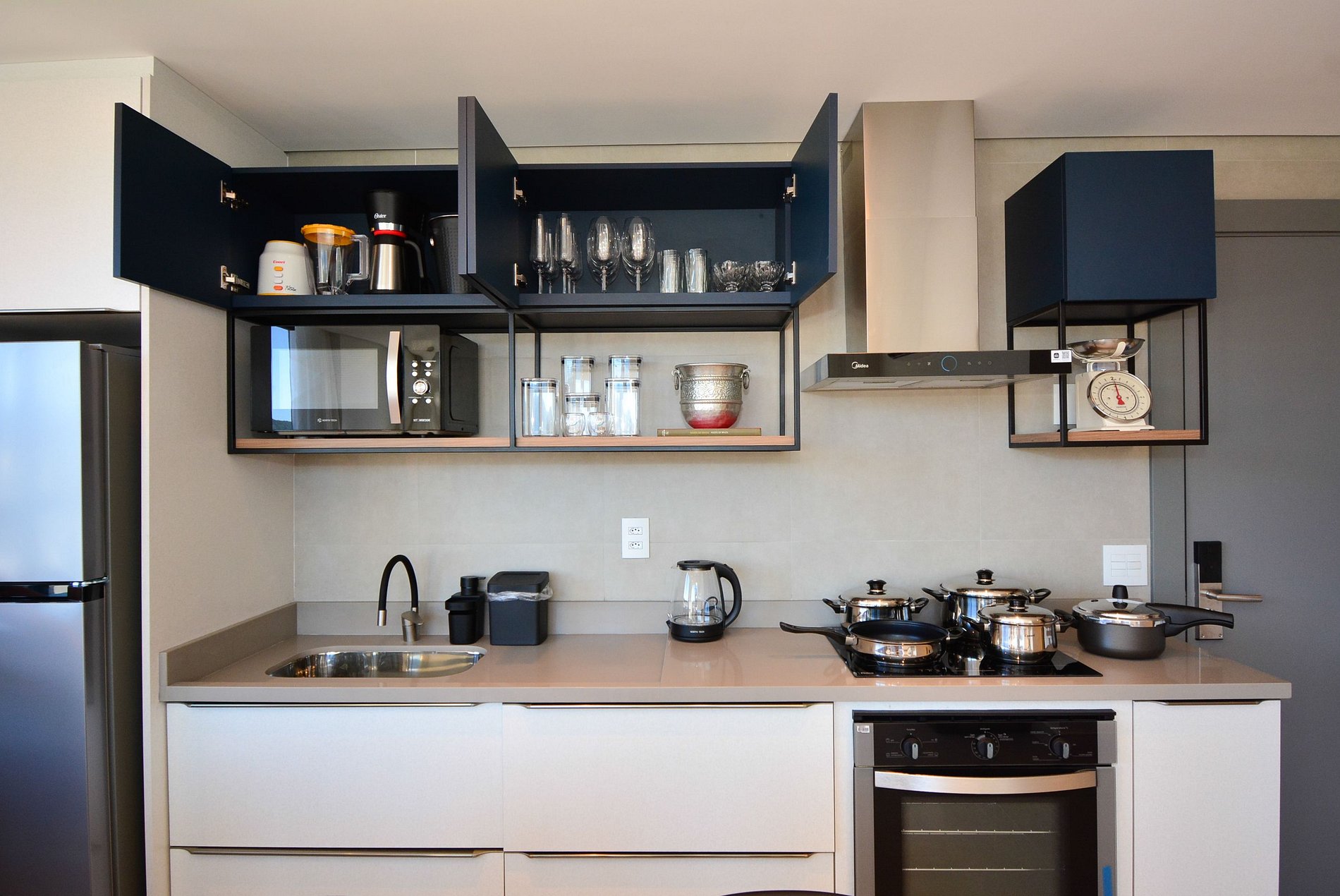 • Cooktop, micro-ondas, geladeira, cafeteira elétrica, chaleira elétrica, liquidificador, panelas variadas.