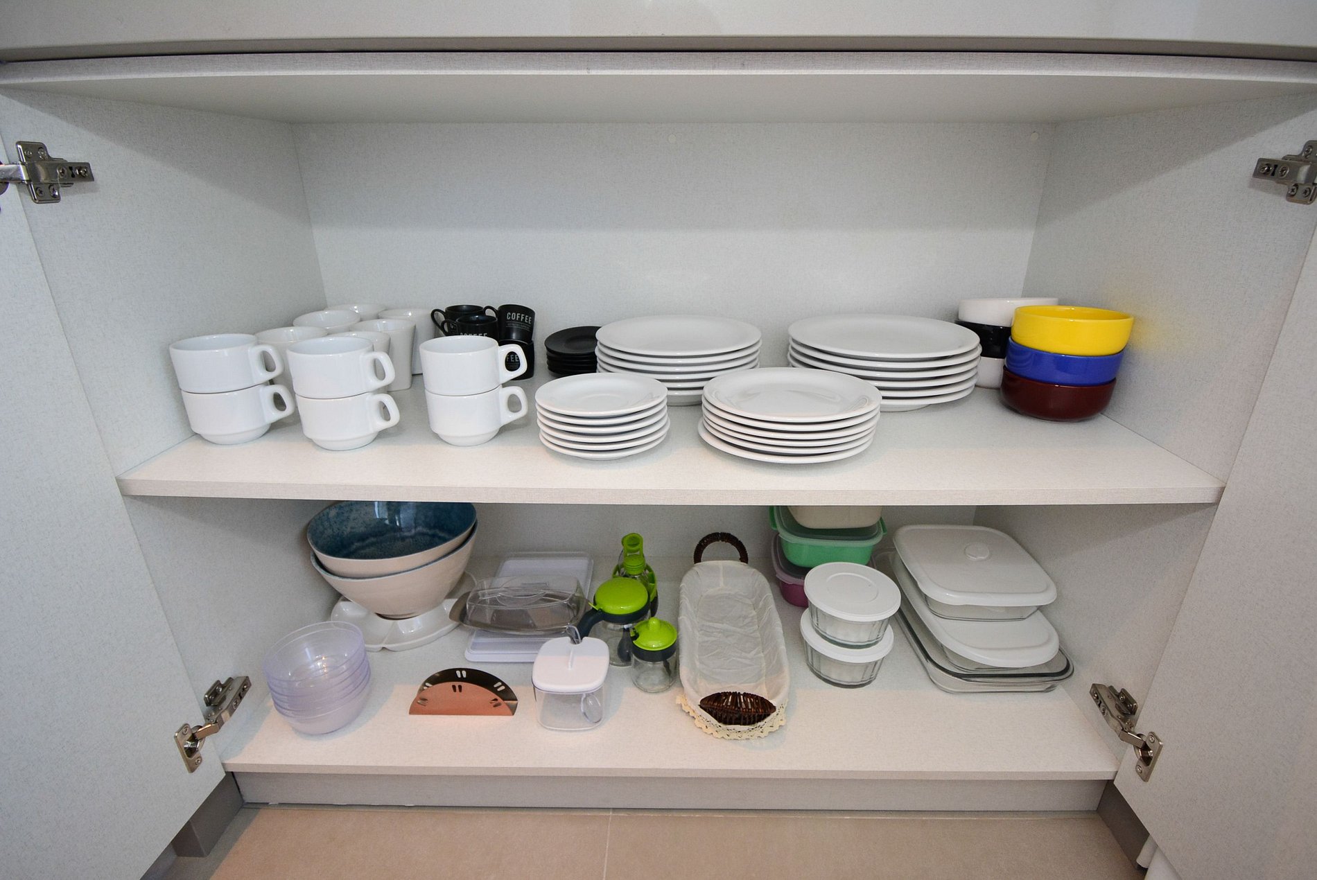 o Pratos, xícaras, copos, taças de vinho, taças de espumante, talheres em geral, abridor de lata, abridor de vinho.
