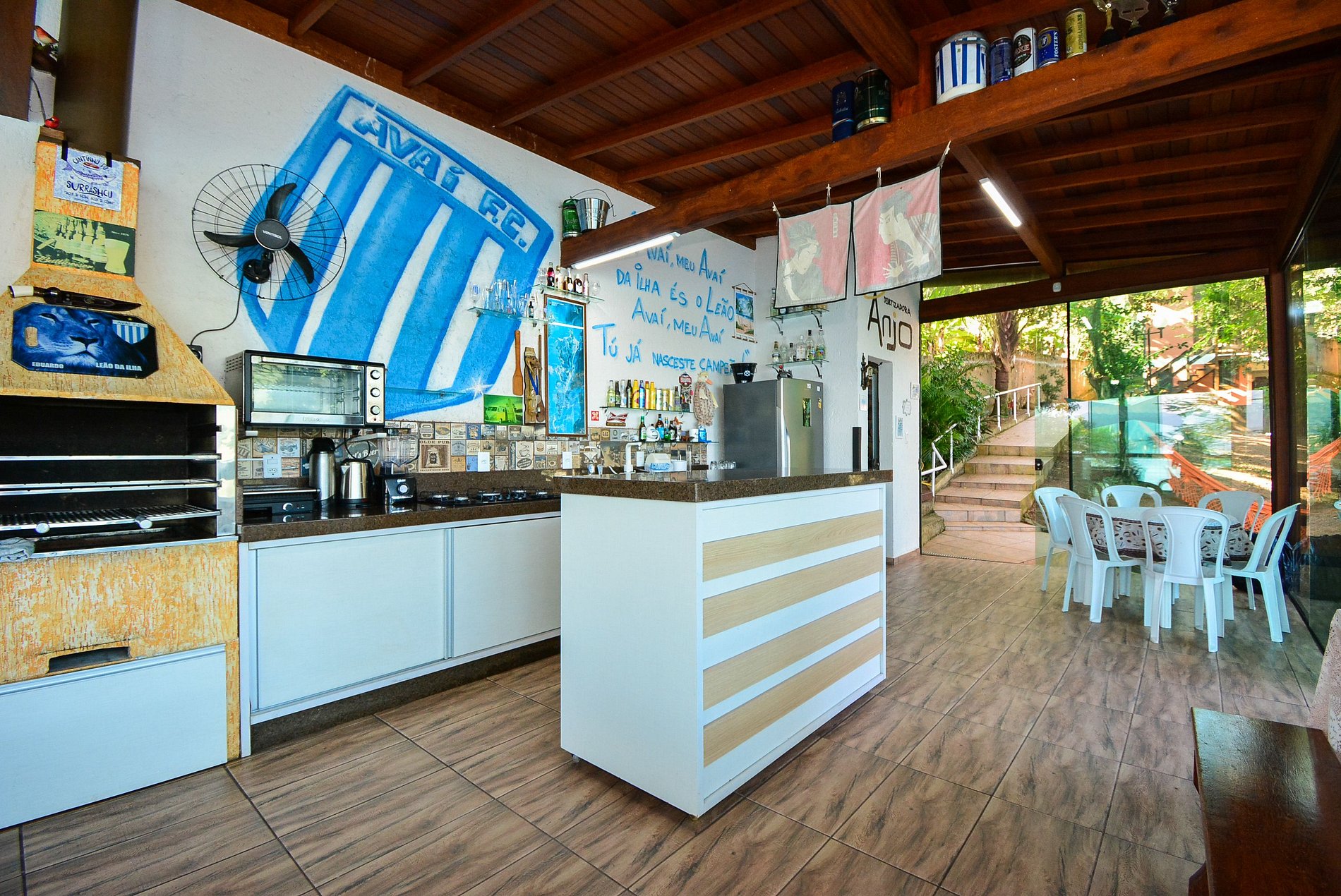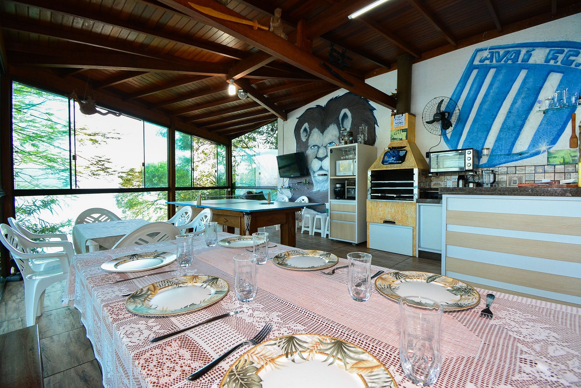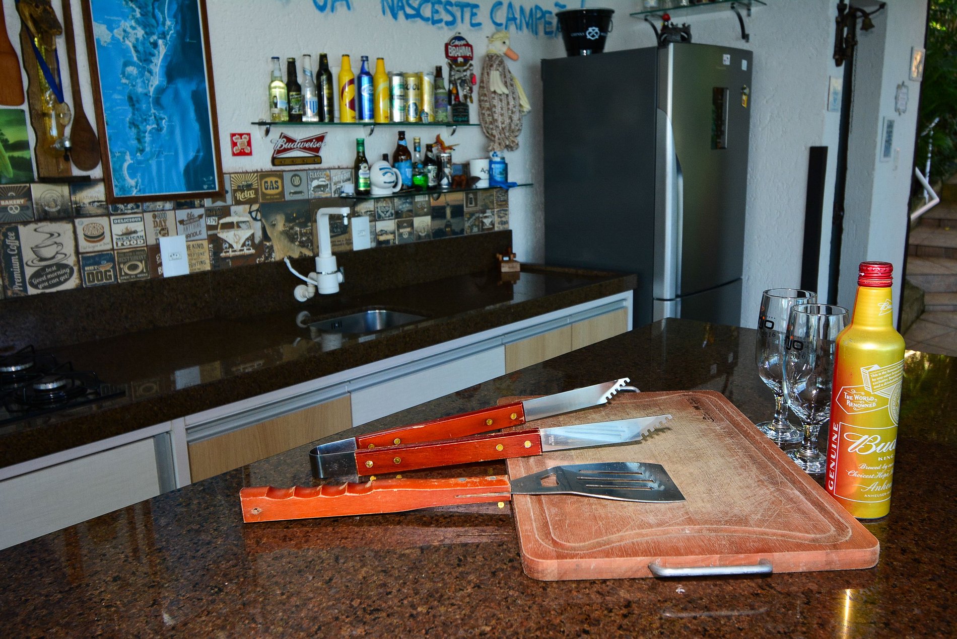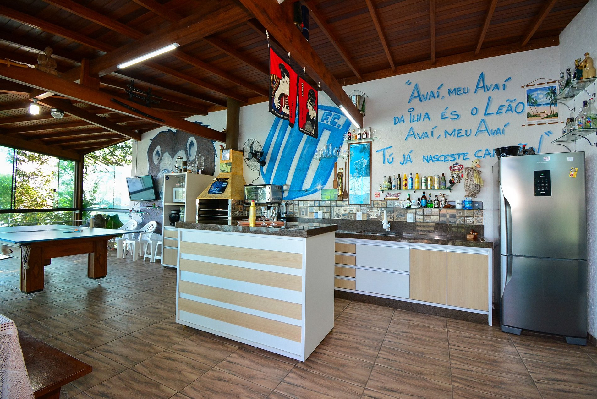 • Itens de cozinha: geladeira, fogão, micro-ondas, panelas grandes, utensílios para churrasco, pratos, copos, xícaras