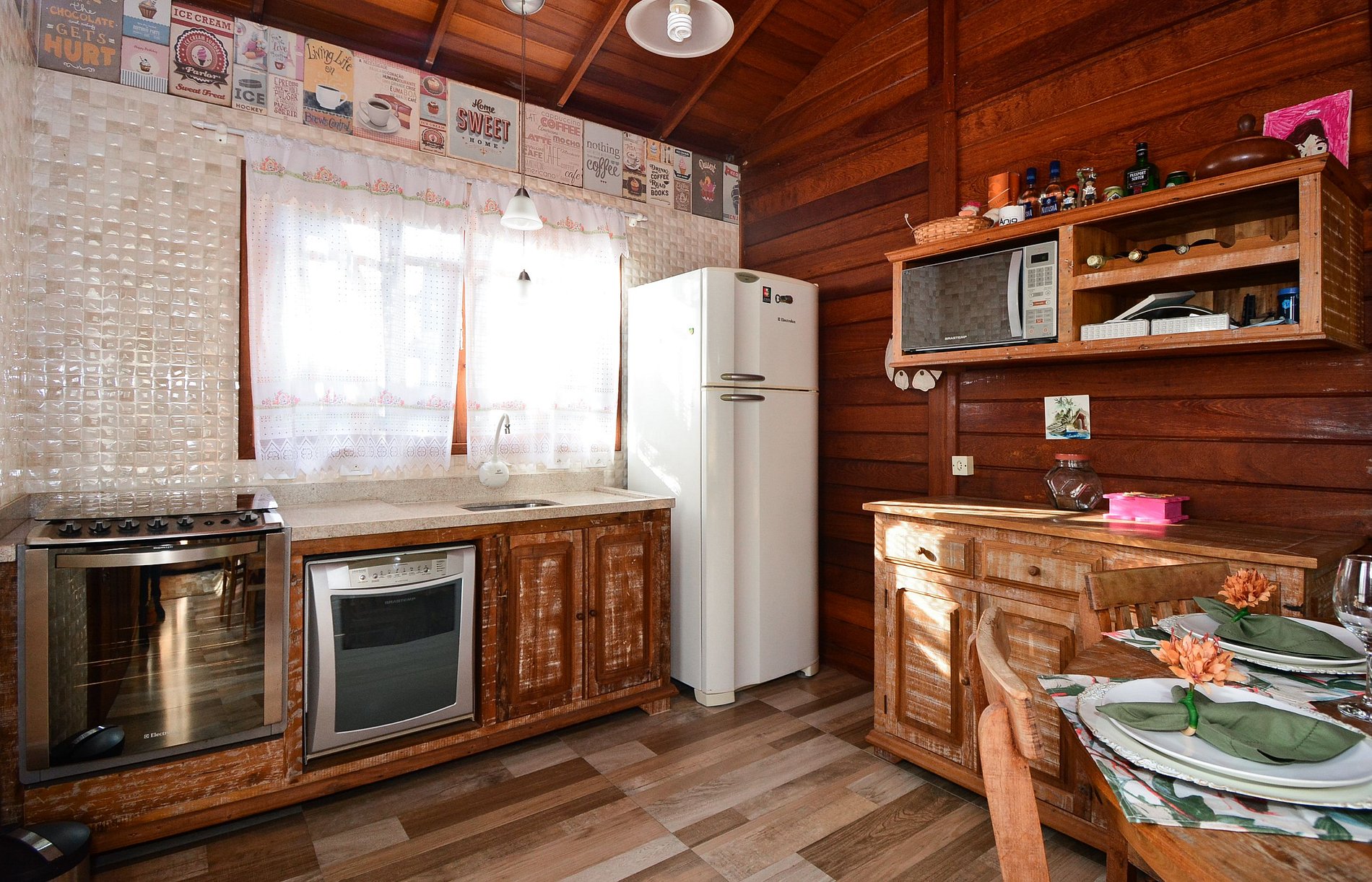 • Itens de cozinha: geladeira, fogão, micro-ondas, panelas grandes, utensílios para churrasco, pratos, copos, xícaras