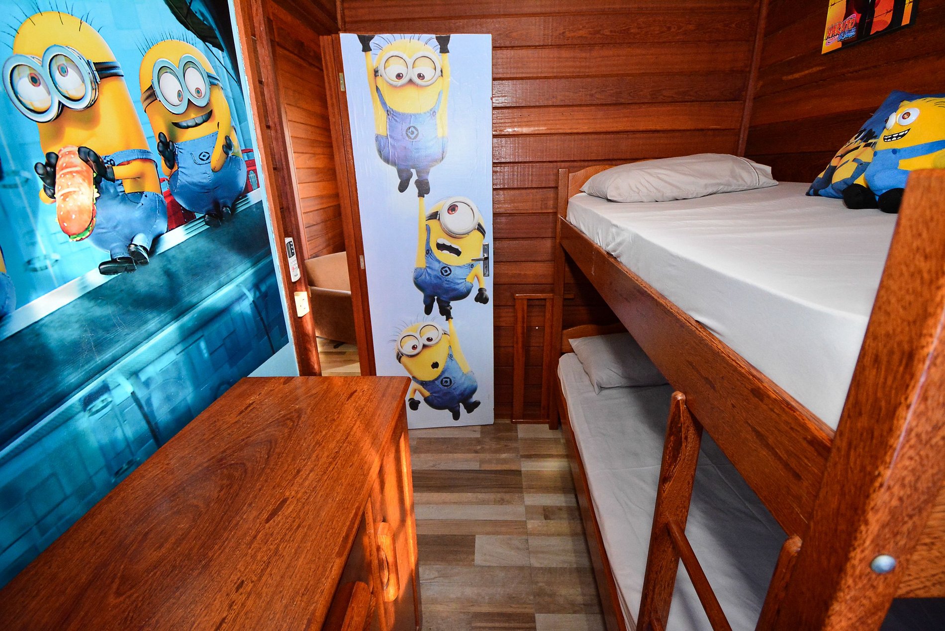 A casa principal acomoda confortavelmente até 12 pessoas, com 3 quartos climatizados (um com cama queen, outro com duas beliches de casal e um com beliche de solteiro, todos com ar condicionado quente e frio), além de um anexo com mais um quarto com cama queen e colchão extra de casal e ar condicionado.