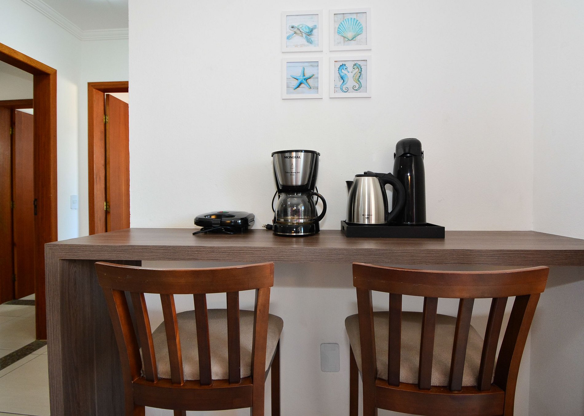 • Geladeira, fogão, micro-ondas, cafeteira, chaleira elétrica, sanduicheira