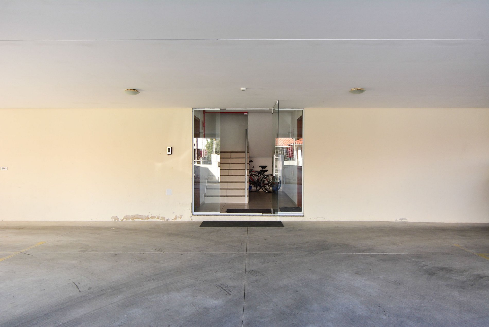 Conta com portão eletrônico e garagem descoberta com vaga exclusiva para um carro.